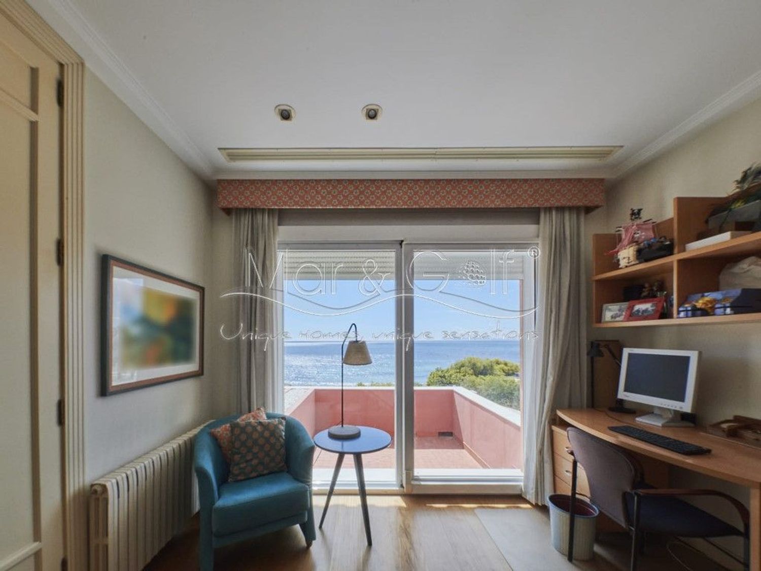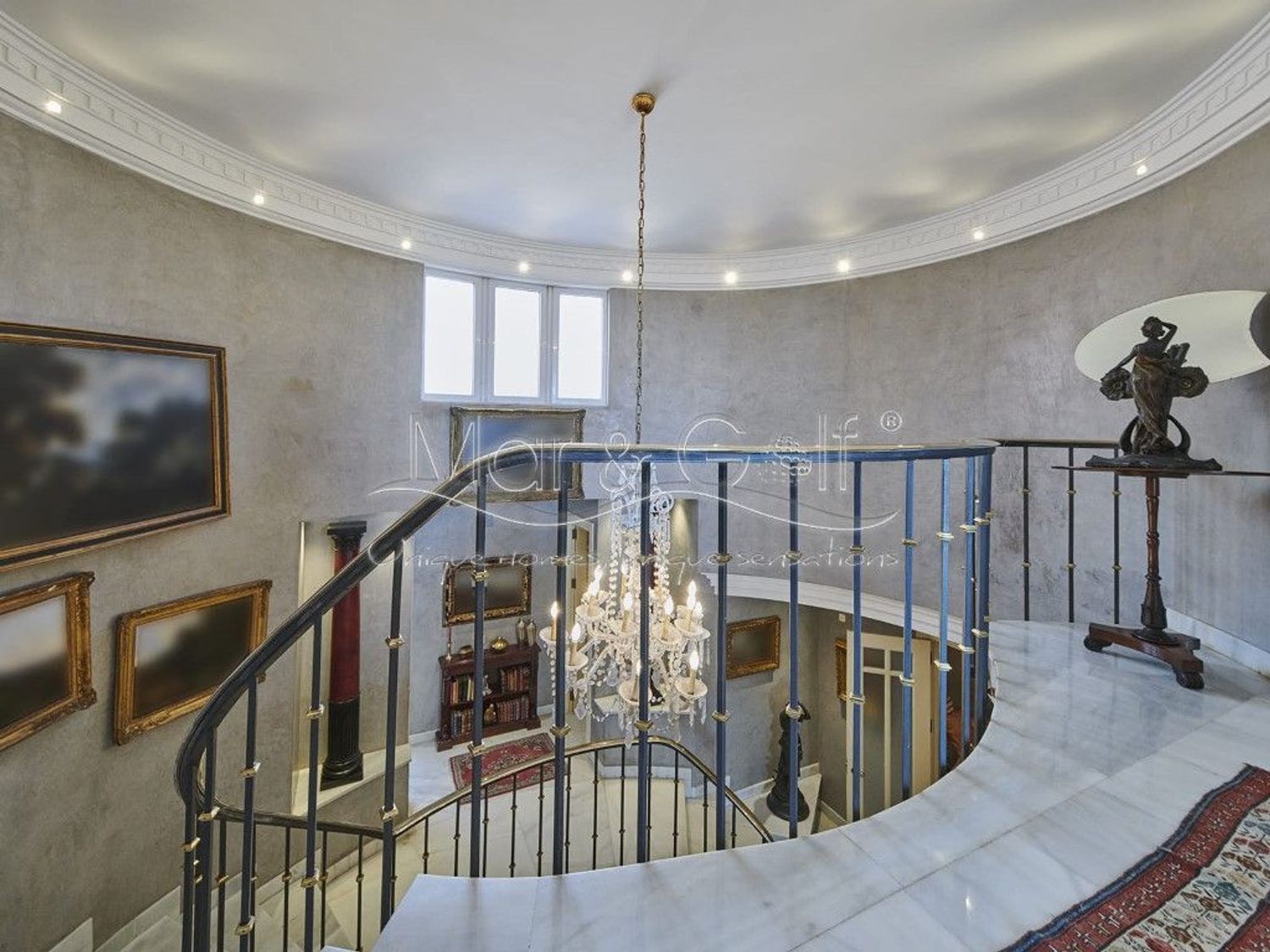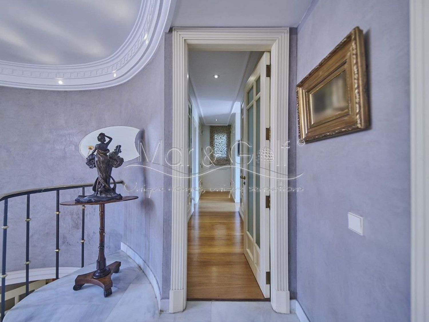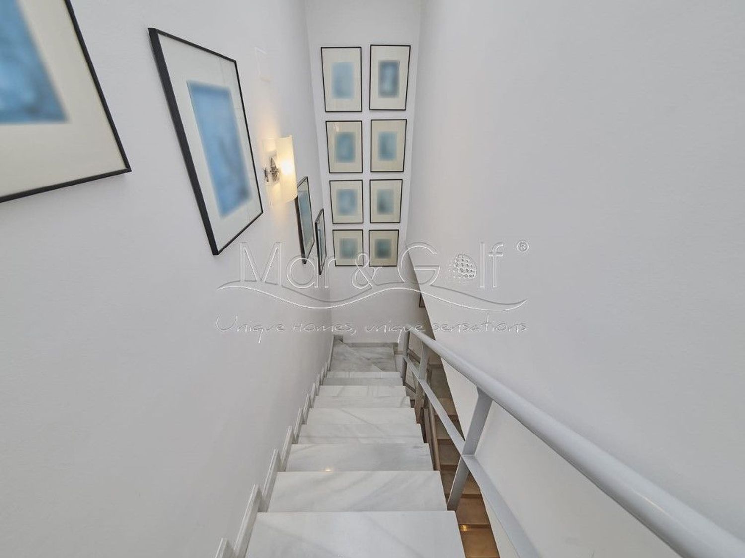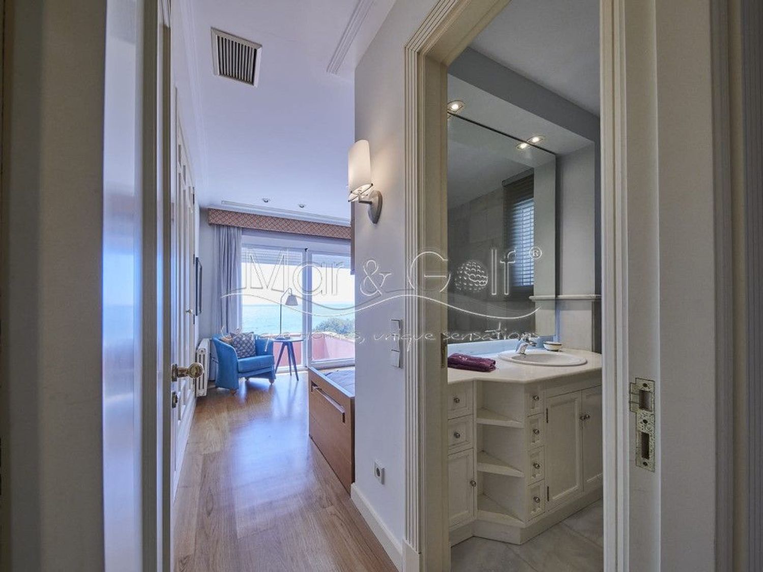 Una elegante escalera de caracol, de amplias dimensiones y con barandilla de forja, conduce a la zona de descanso, donde se distribuyen cuatro dormitorios adicionales y varios baños de refinado diseño. Cada estancia ha sido concebida como un espacio íntimo y sofisticado, con armarios empotrados y una cuidada atención al detalle. Destacan especialmente el despacho y la suite principal, ambos con acceso a una terraza privada desde la que se disfrutan privilegiadas vistas al mar.