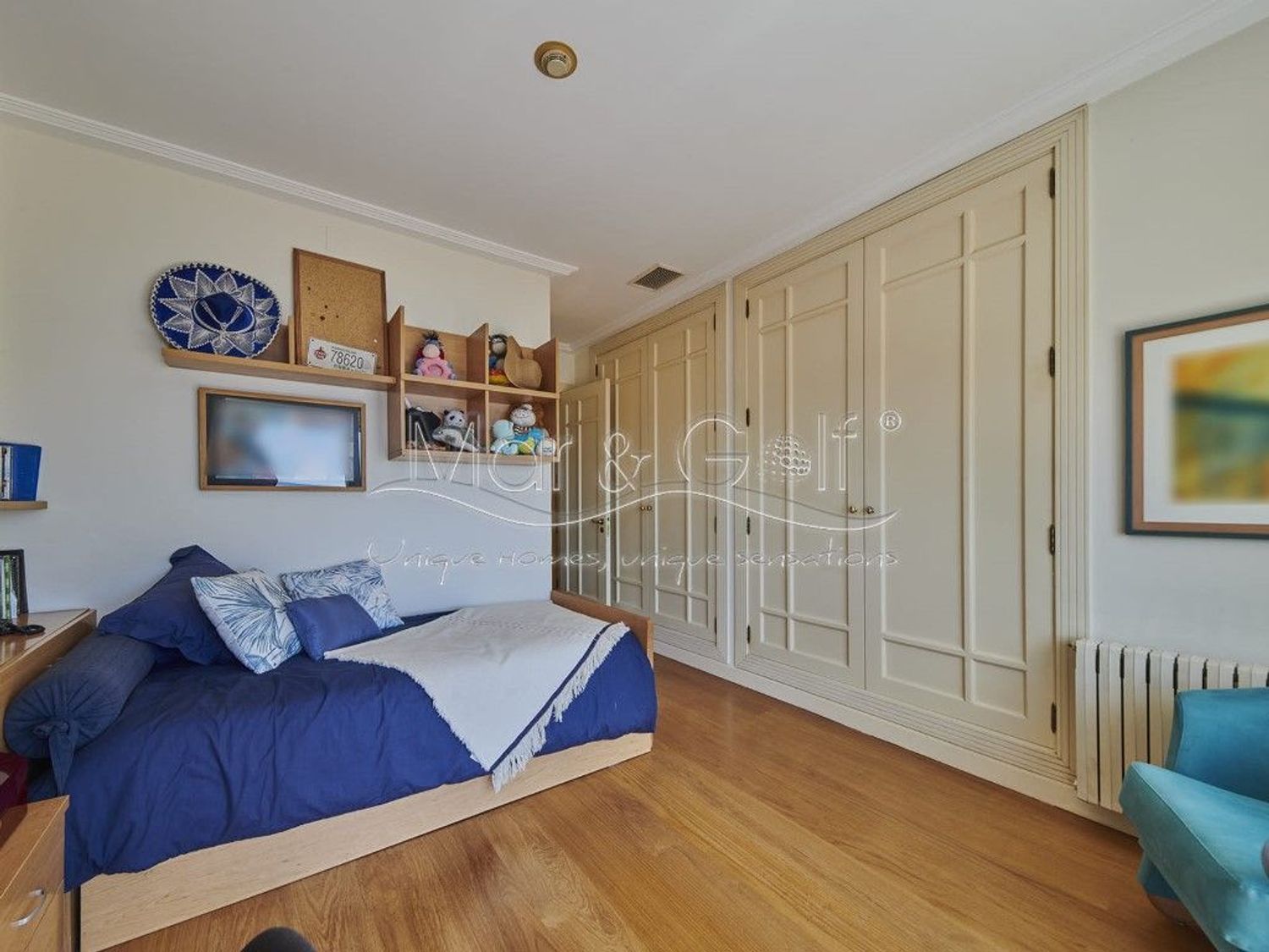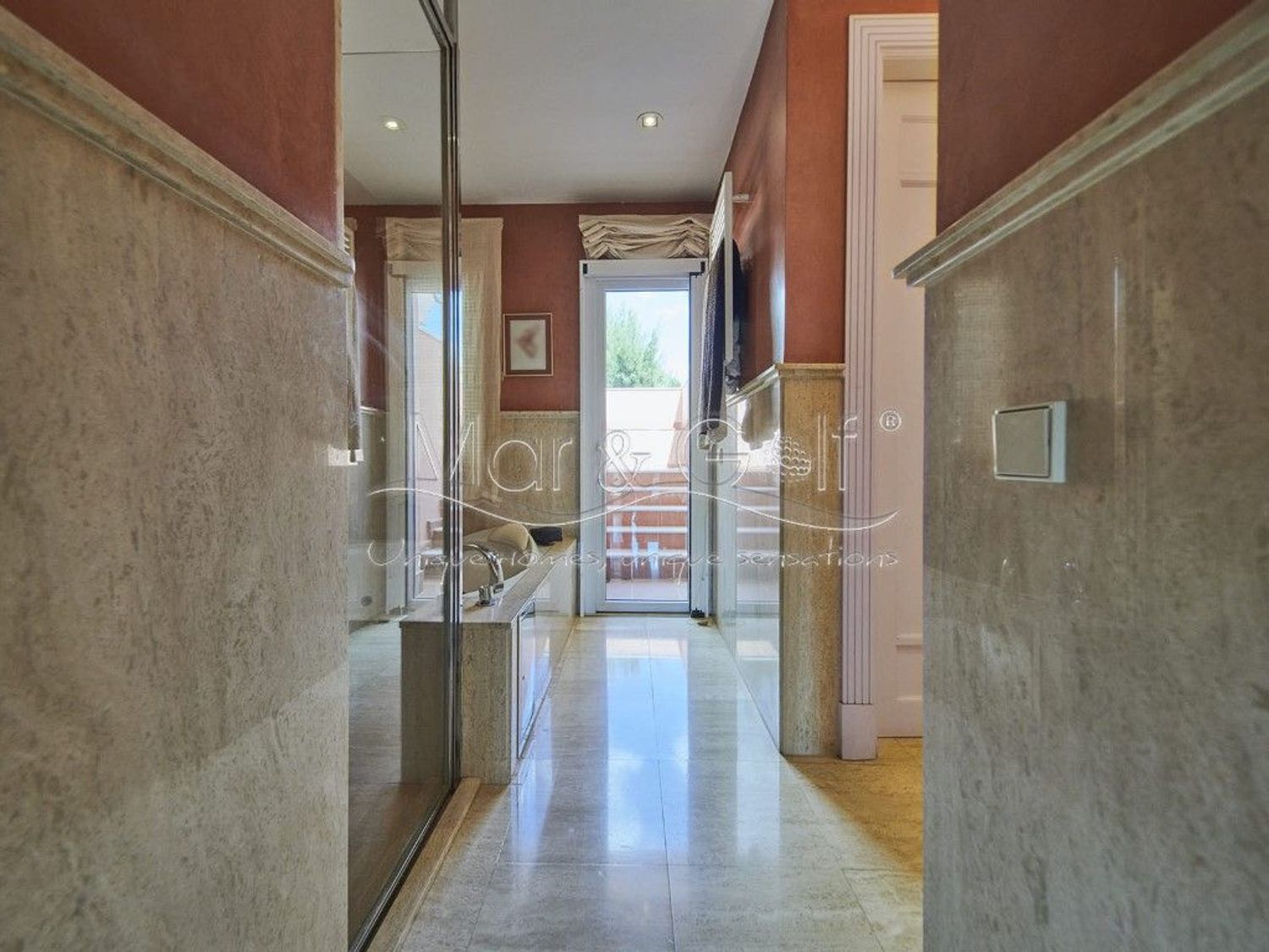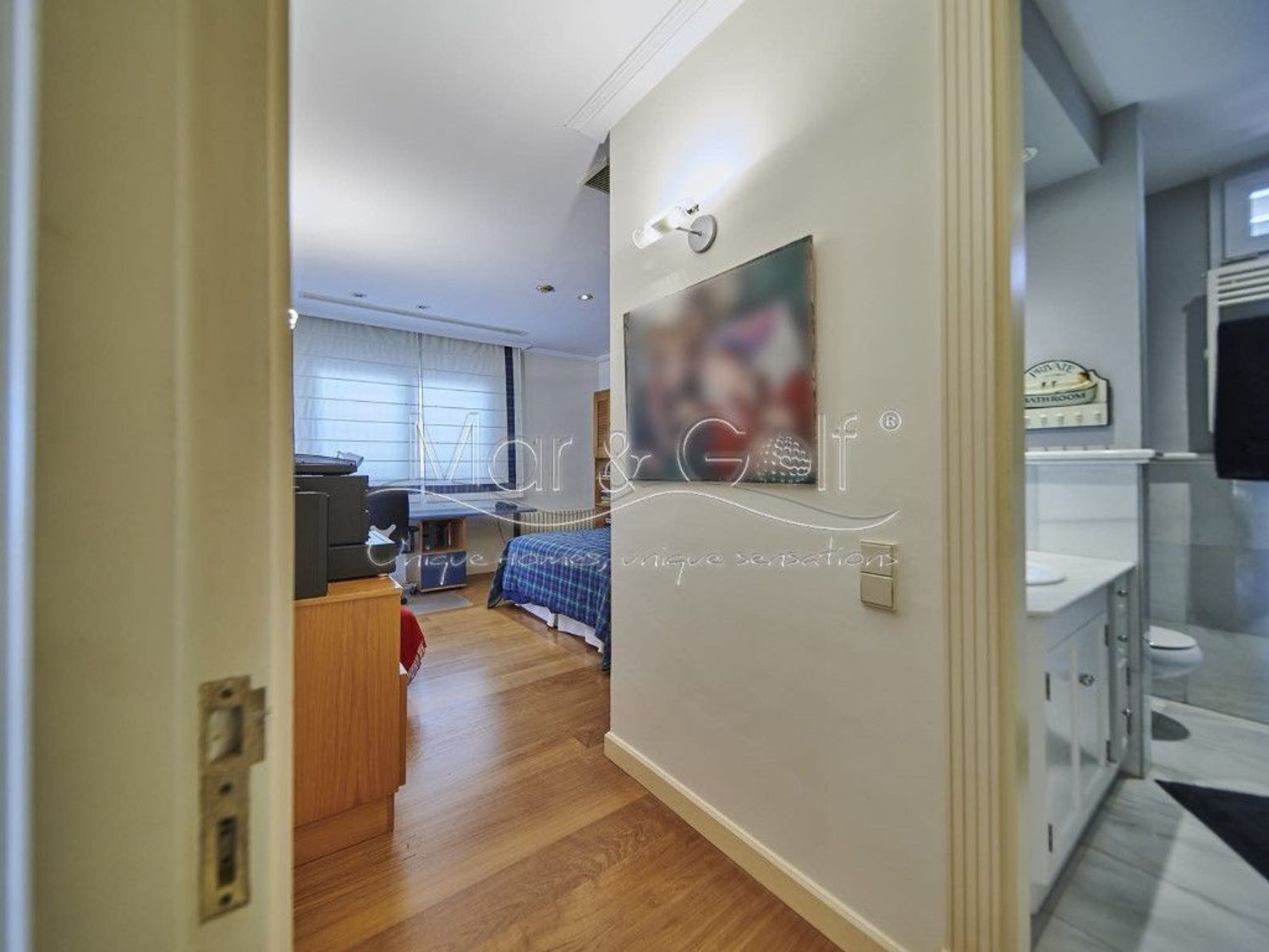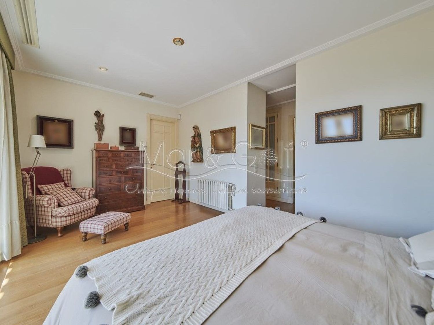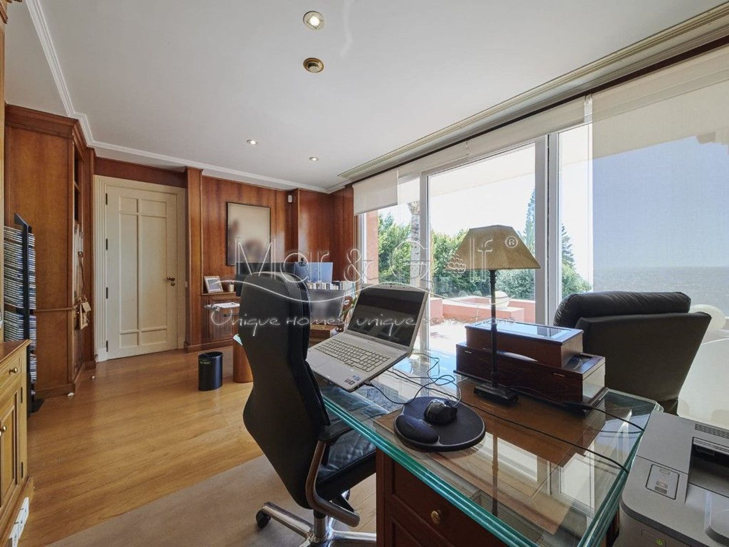 Una elegante escalera de caracol, de amplias dimensiones y con barandilla de forja, conduce a la zona de descanso, donde se distribuyen cuatro dormitorios adicionales y varios baños de refinado diseño. Cada estancia ha sido concebida como un espacio íntimo y sofisticado, con armarios empotrados y una cuidada atención al detalle. Destacan especialmente el despacho y la suite principal, ambos con acceso a una terraza privada desde la que se disfrutan privilegiadas vistas al mar.