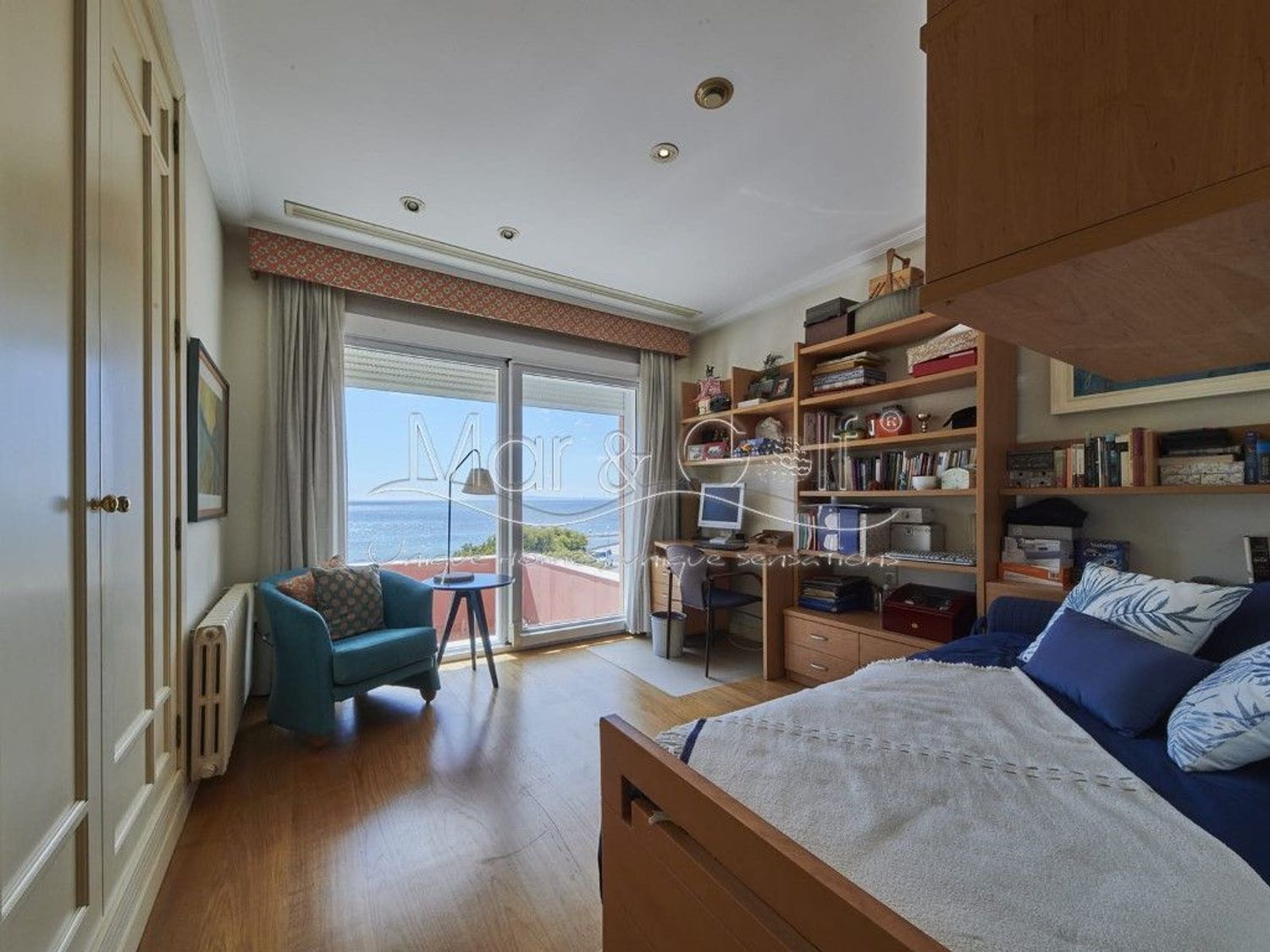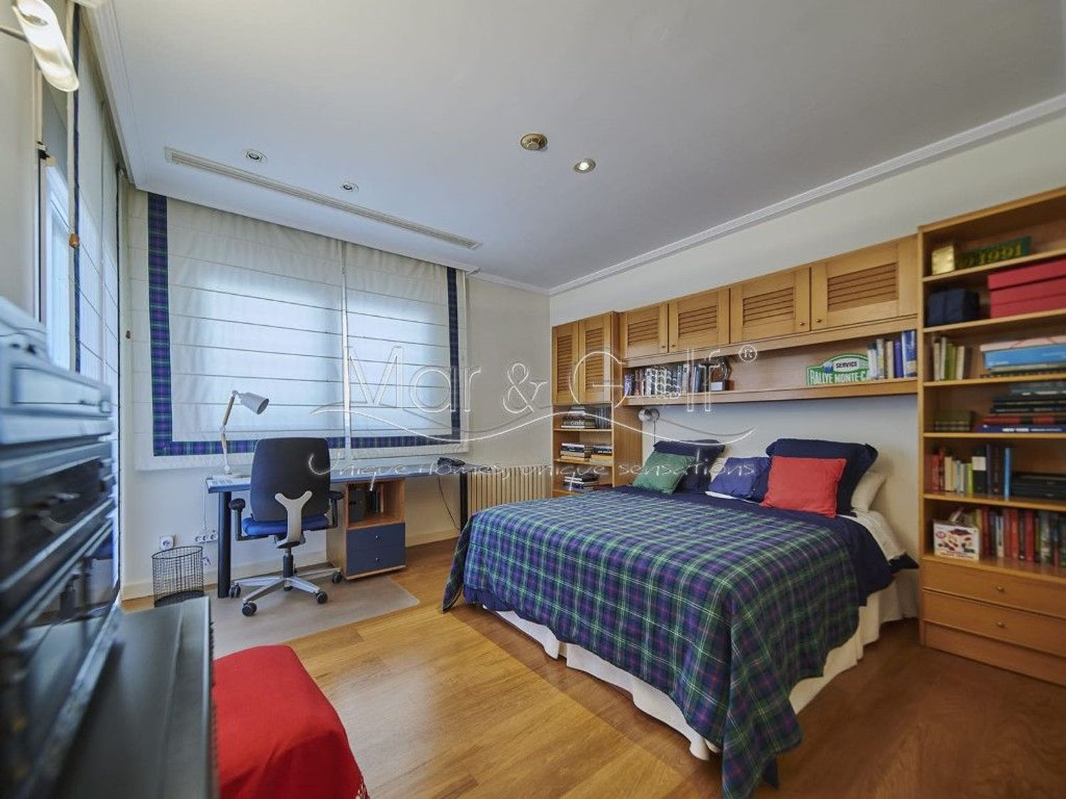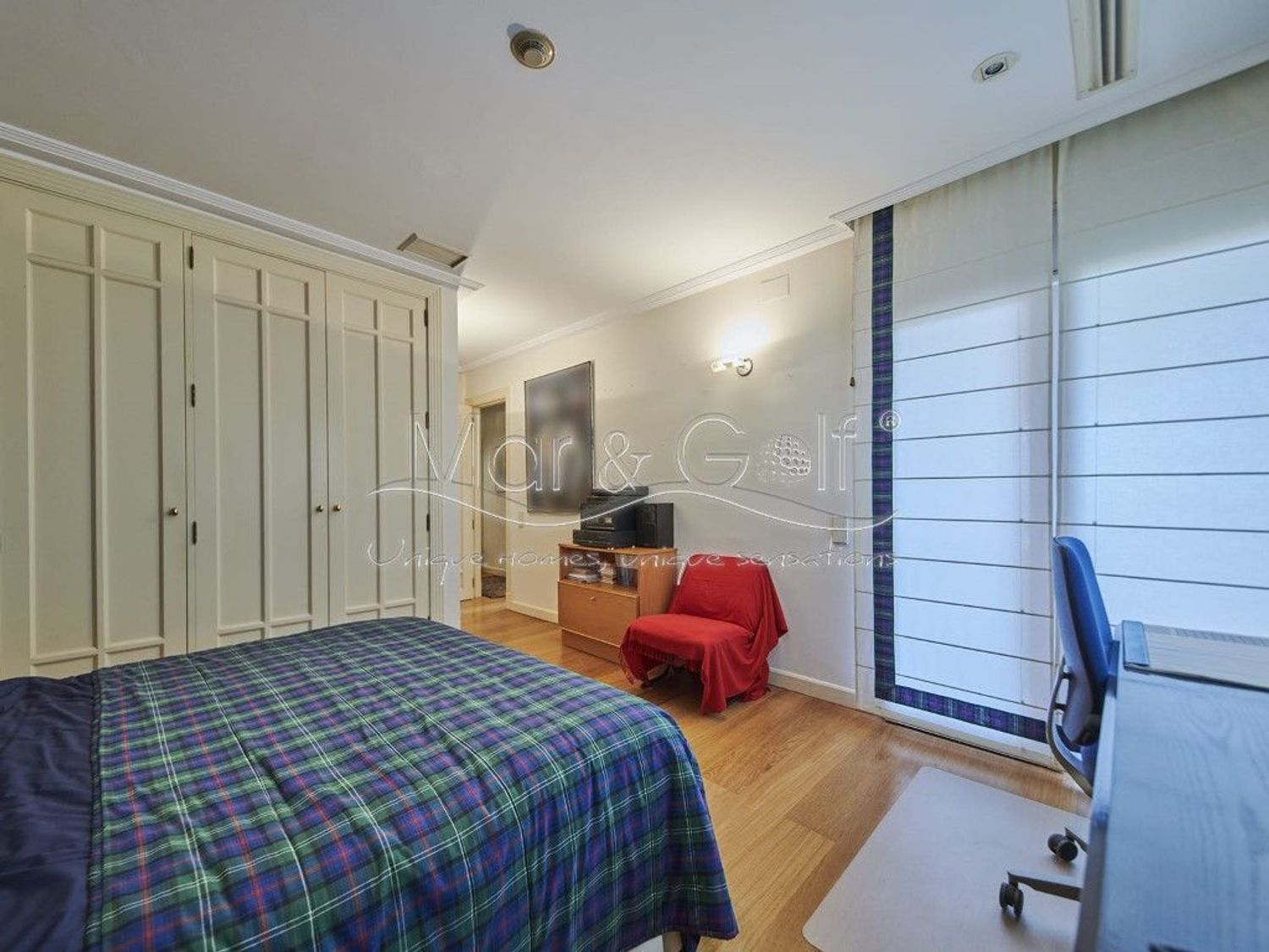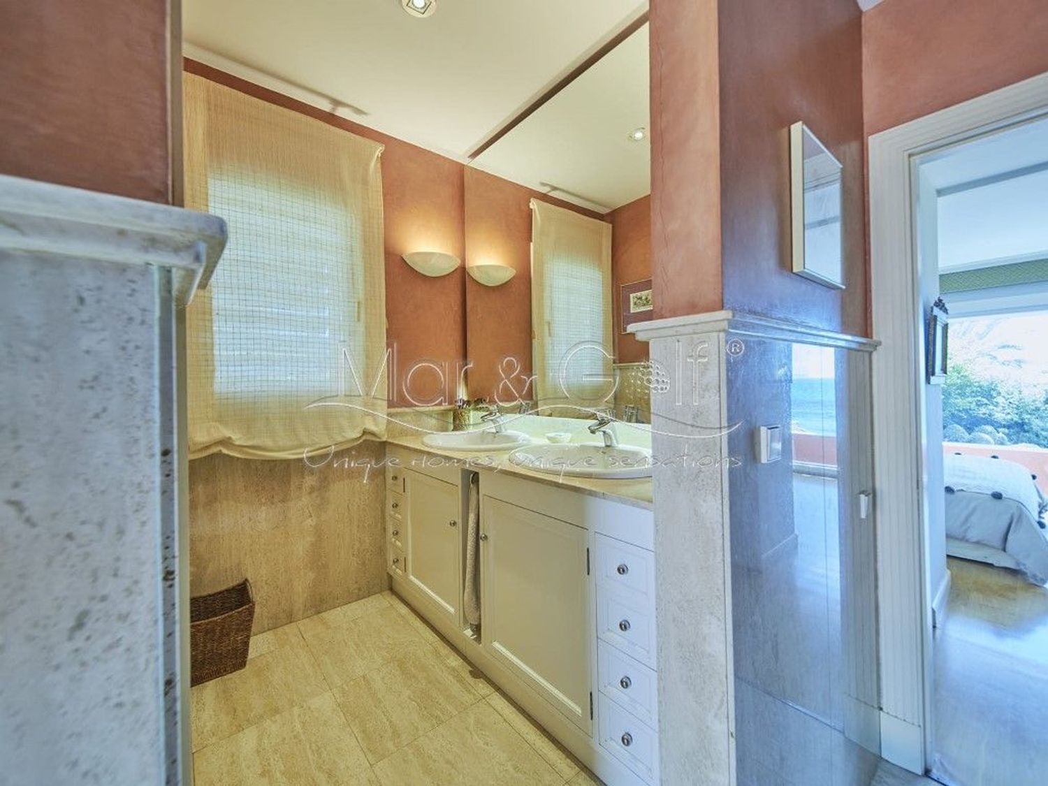 Una elegante escalera de caracol, de amplias dimensiones y con barandilla de forja, conduce a la zona de descanso, donde se distribuyen cuatro dormitorios adicionales y varios baños de refinado diseño. Cada estancia ha sido concebida como un espacio íntimo y sofisticado, con armarios empotrados y una cuidada atención al detalle. Destacan especialmente el despacho y la suite principal, ambos con acceso a una terraza privada desde la que se disfrutan privilegiadas vistas al mar.