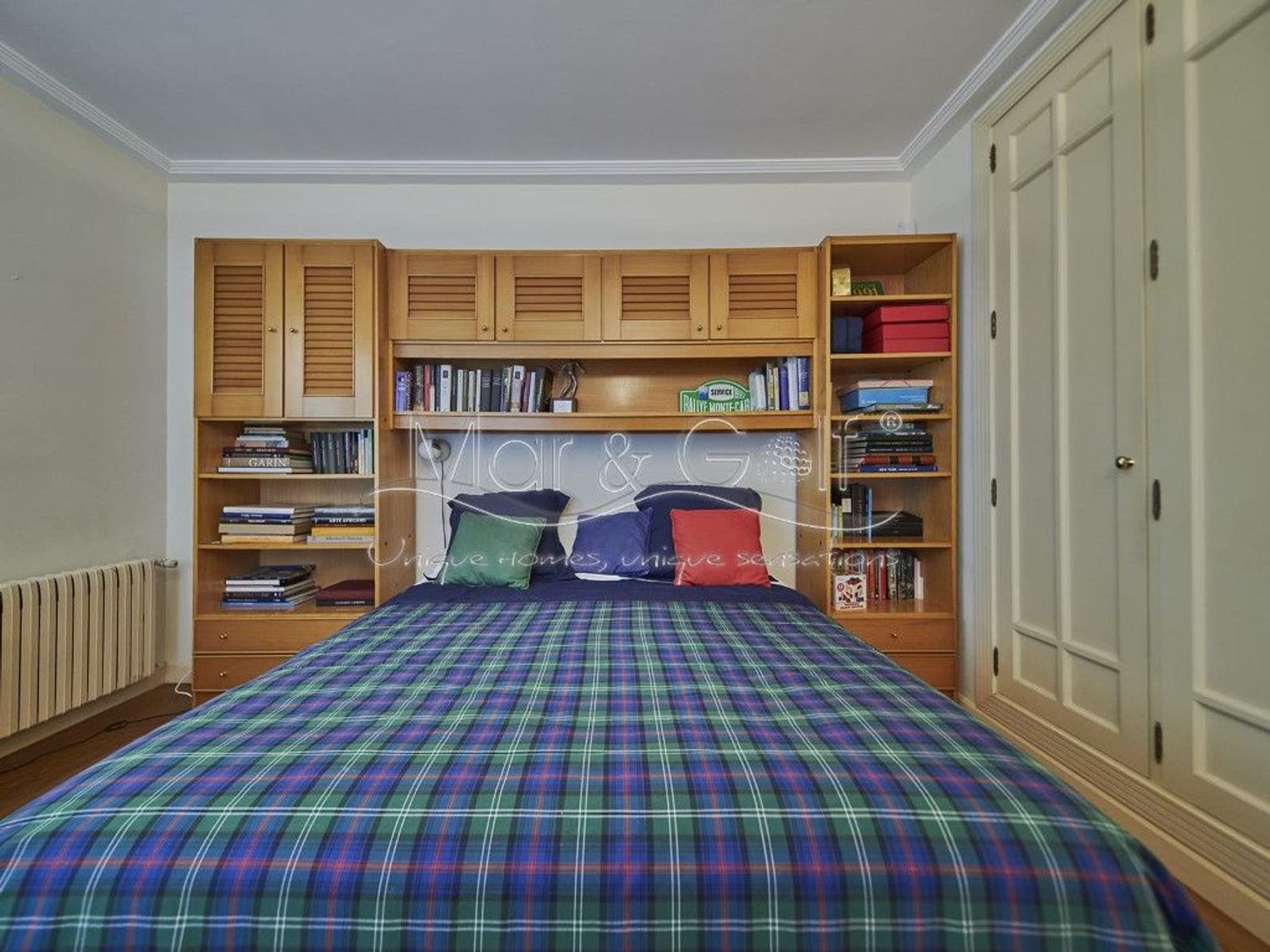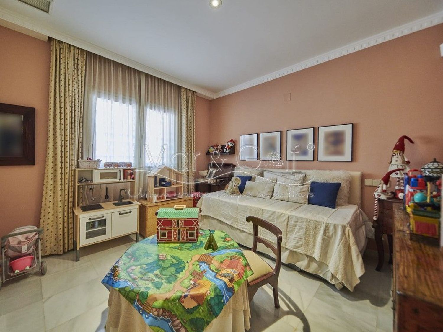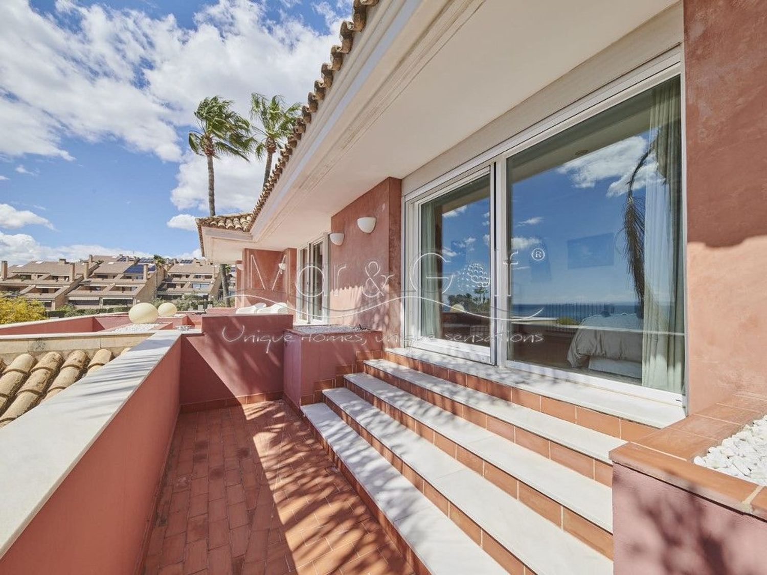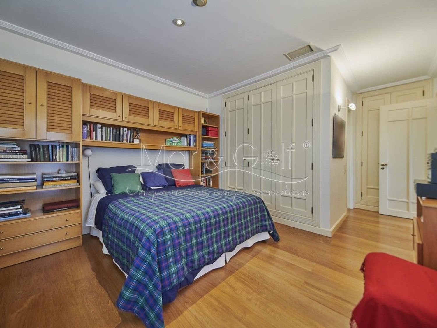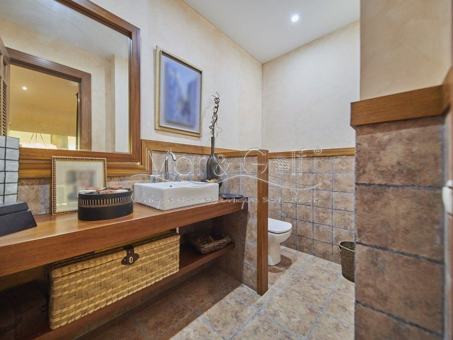 Una elegante escalera de caracol, de amplias dimensiones y con barandilla de forja, conduce a la zona de descanso, donde se distribuyen cuatro dormitorios adicionales y varios baños de refinado diseño. Cada estancia ha sido concebida como un espacio íntimo y sofisticado, con armarios empotrados y una cuidada atención al detalle. Destacan especialmente el despacho y la suite principal, ambos con acceso a una terraza privada desde la que se disfrutan privilegiadas vistas al mar.