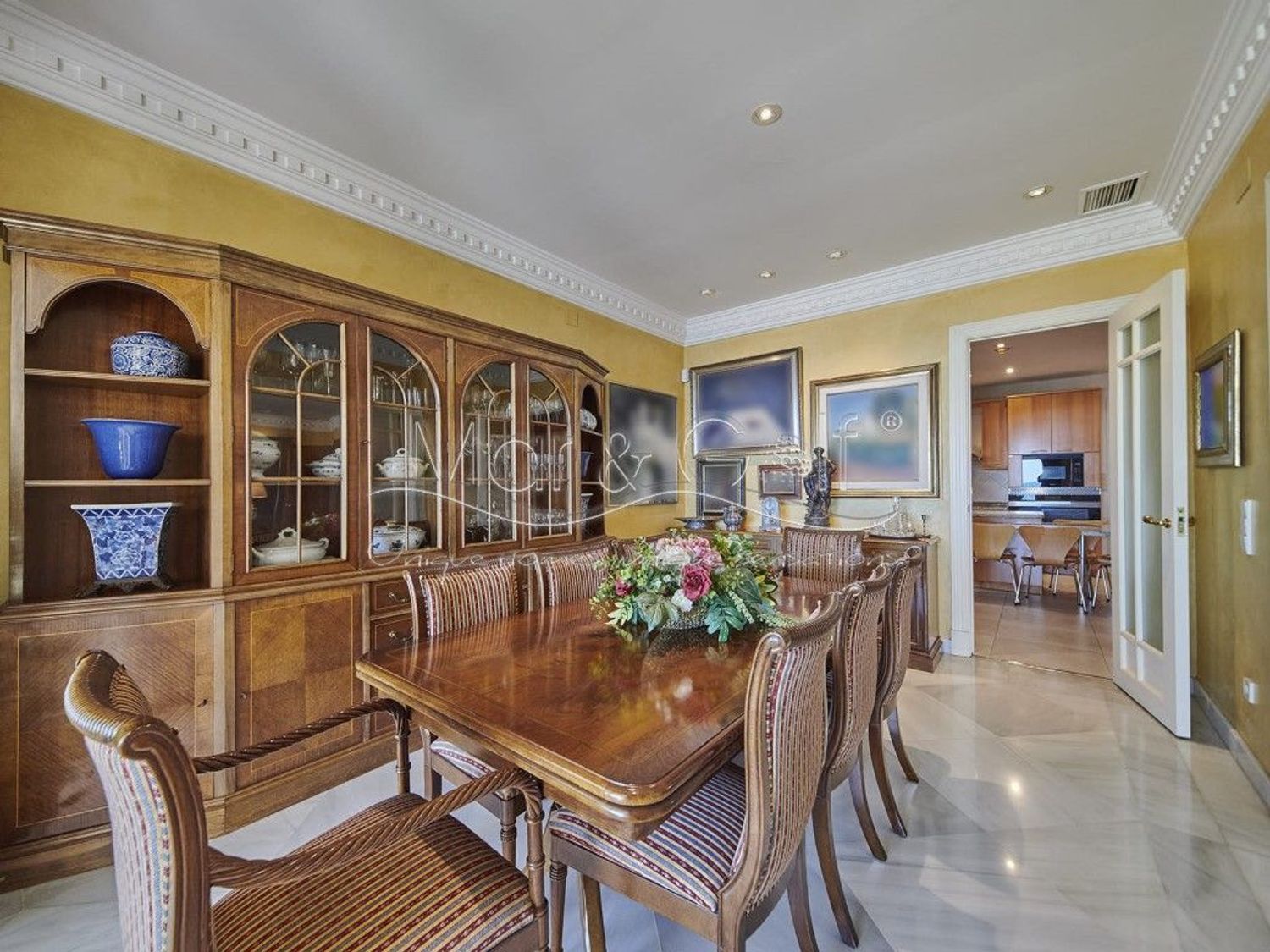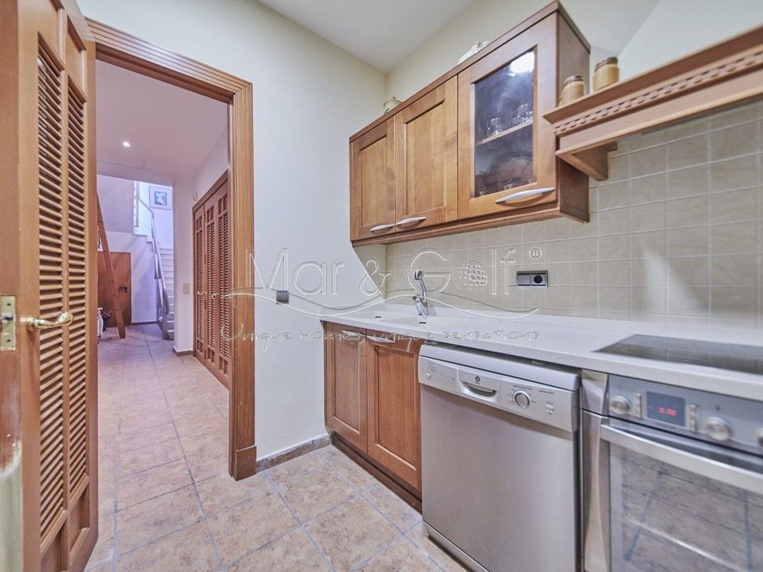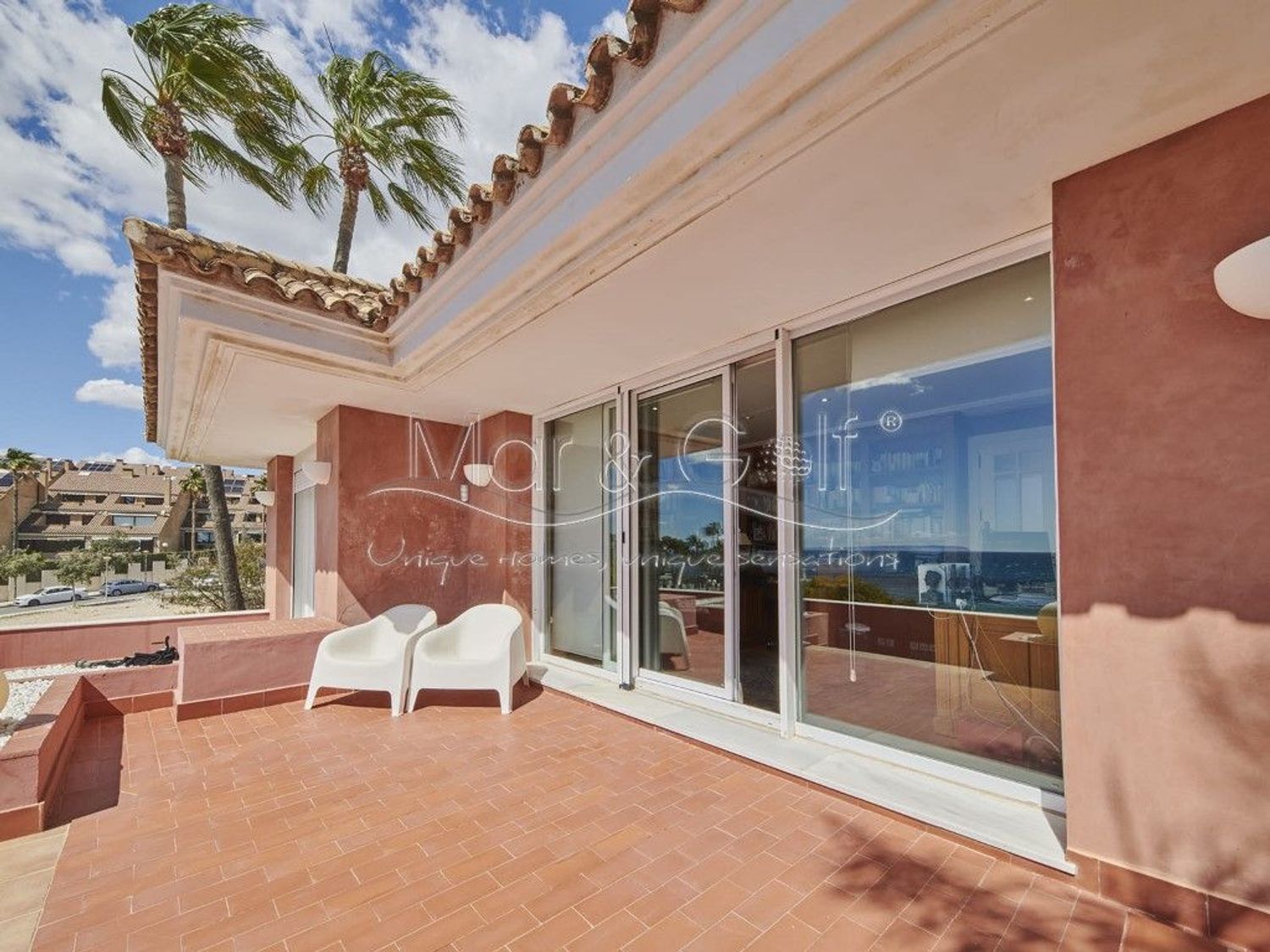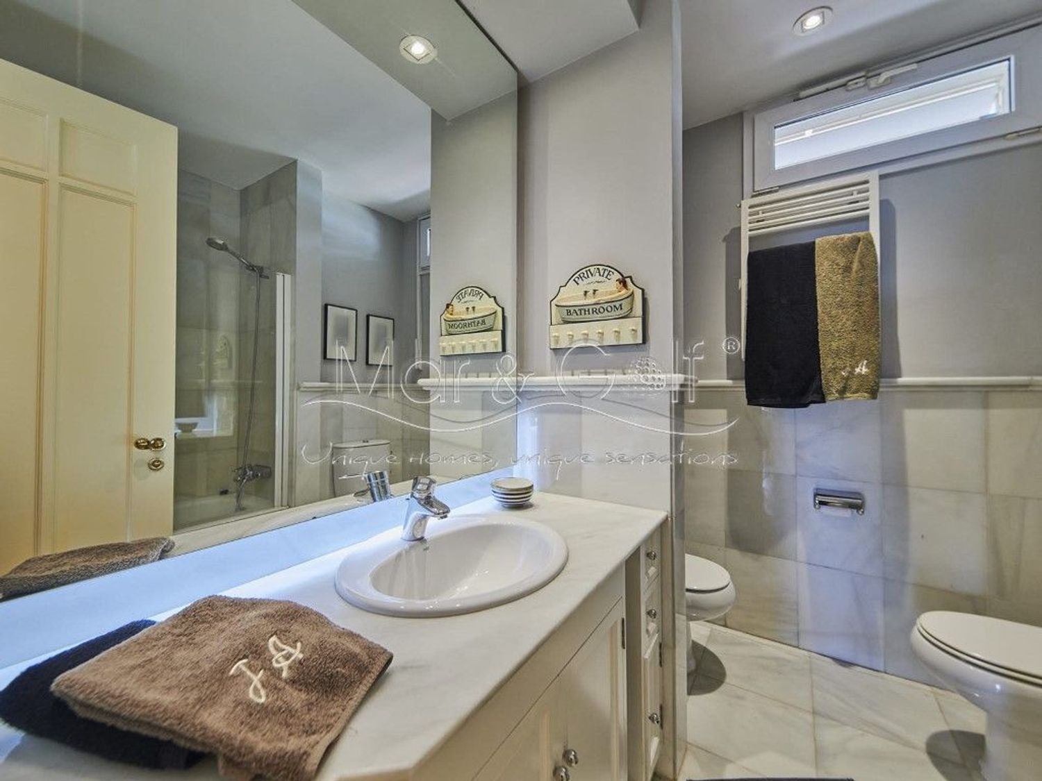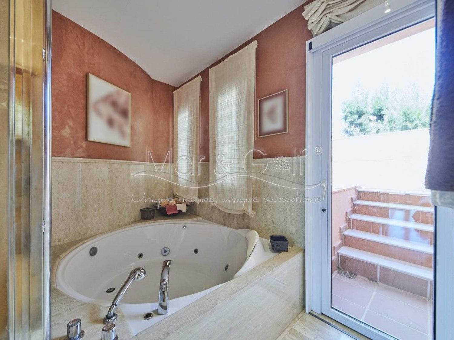Una elegante escalera de caracol, de amplias dimensiones y con barandilla de forja, conduce a la zona de descanso, donde se distribuyen cuatro dormitorios adicionales y varios baños de refinado diseño. Cada estancia ha sido concebida como un espacio íntimo y sofisticado, con armarios empotrados y una cuidada atención al detalle. Destacan especialmente el despacho y la suite principal, ambos con acceso a una terraza privada desde la que se disfrutan privilegiadas vistas al mar.