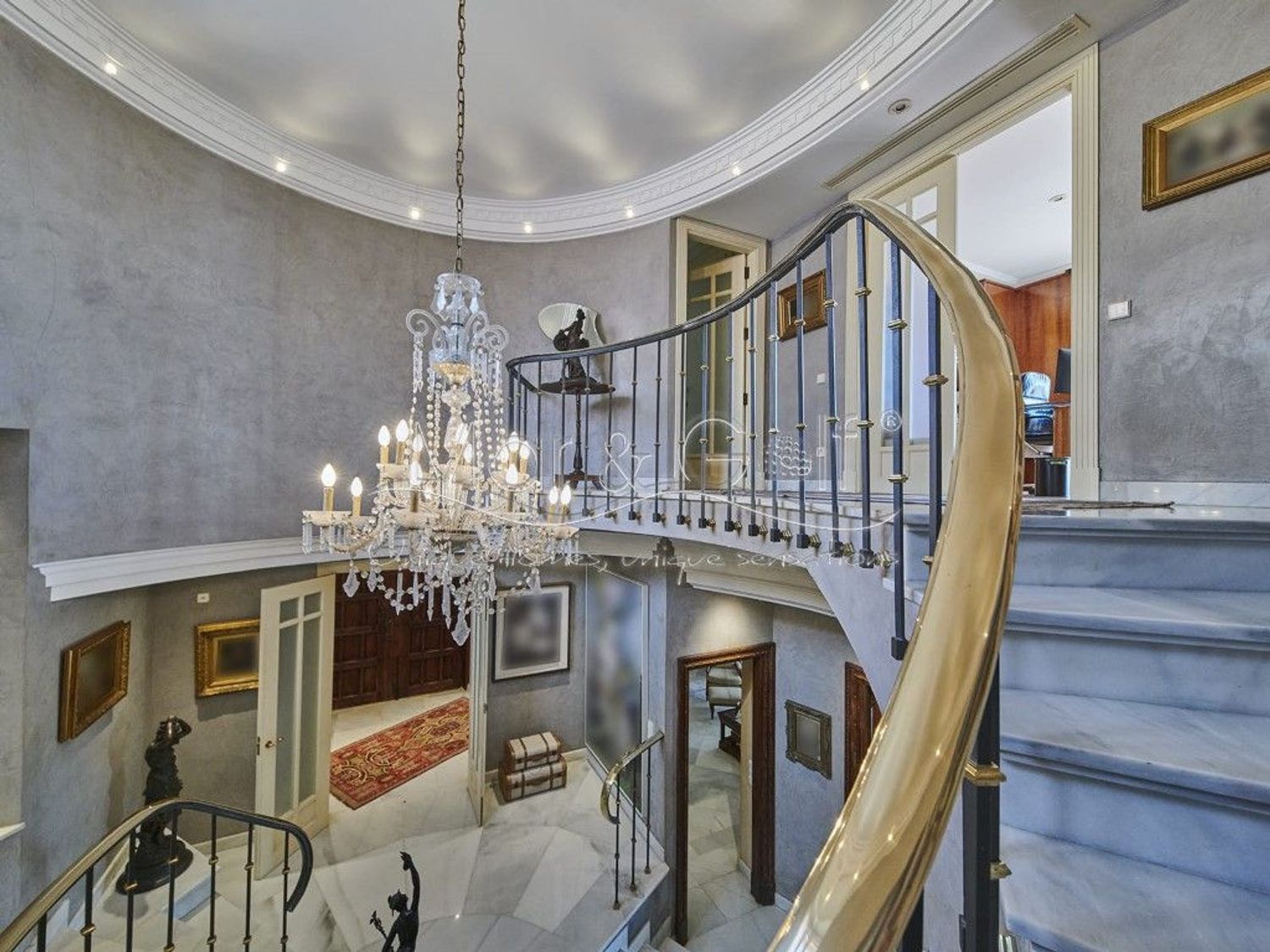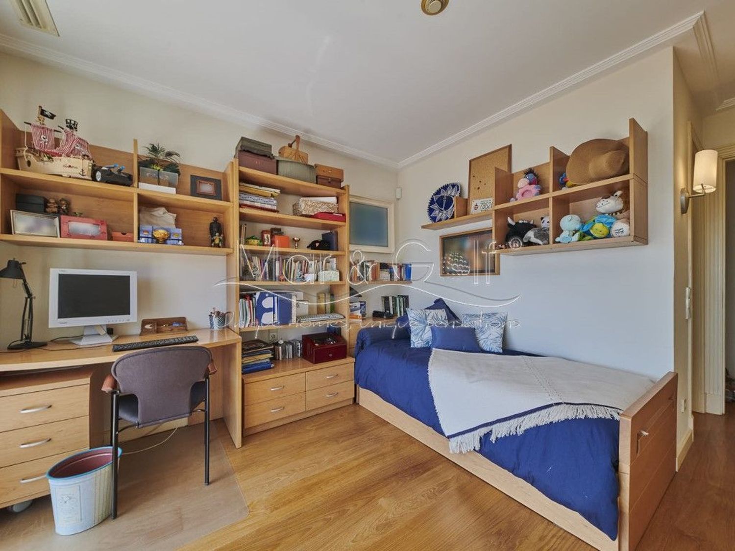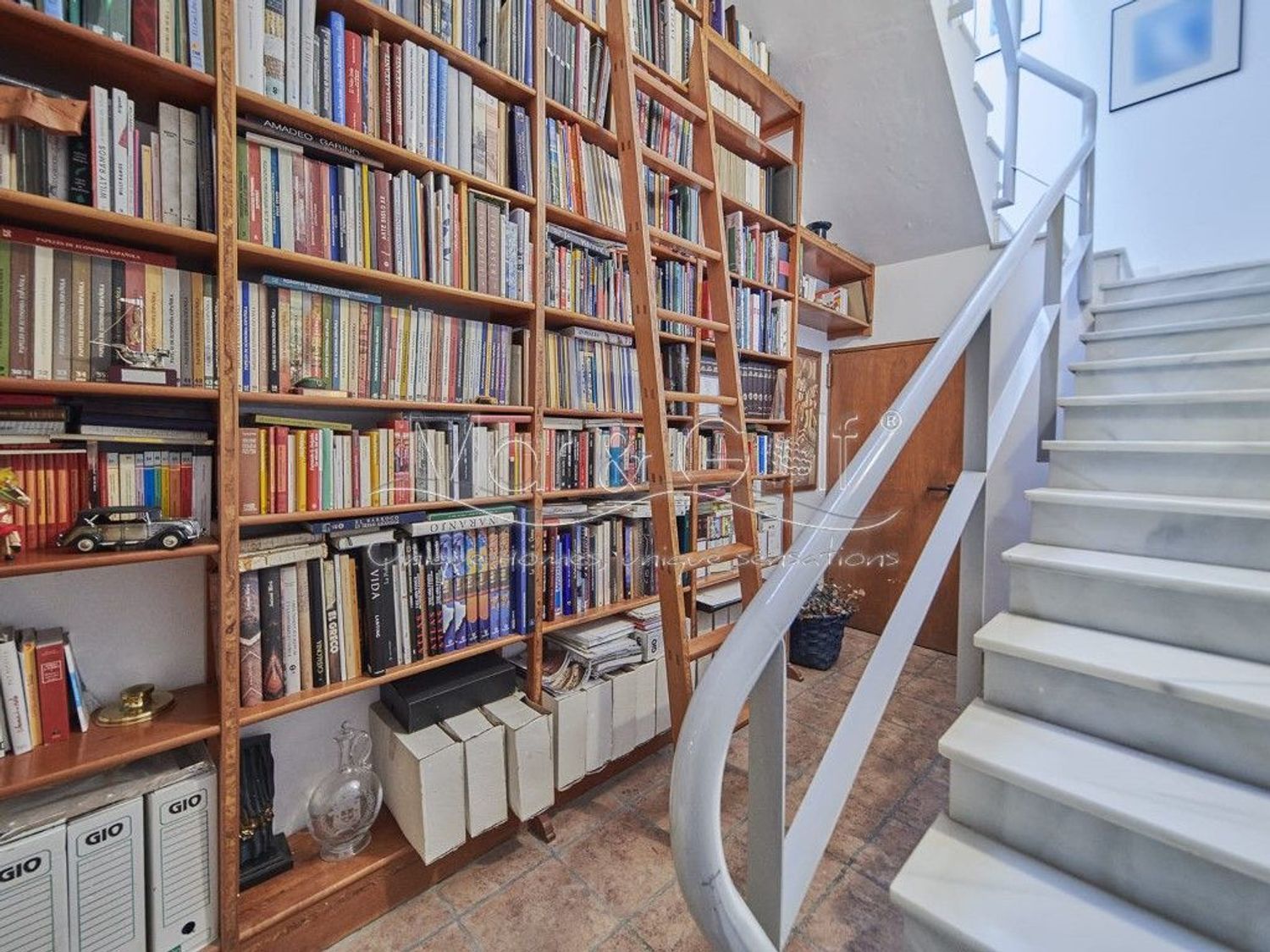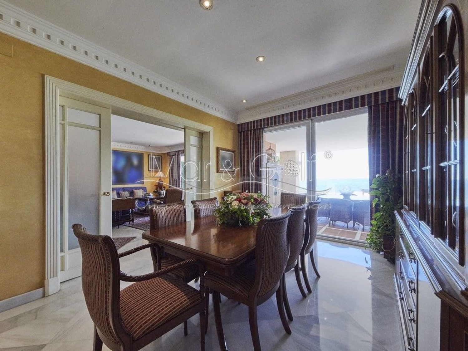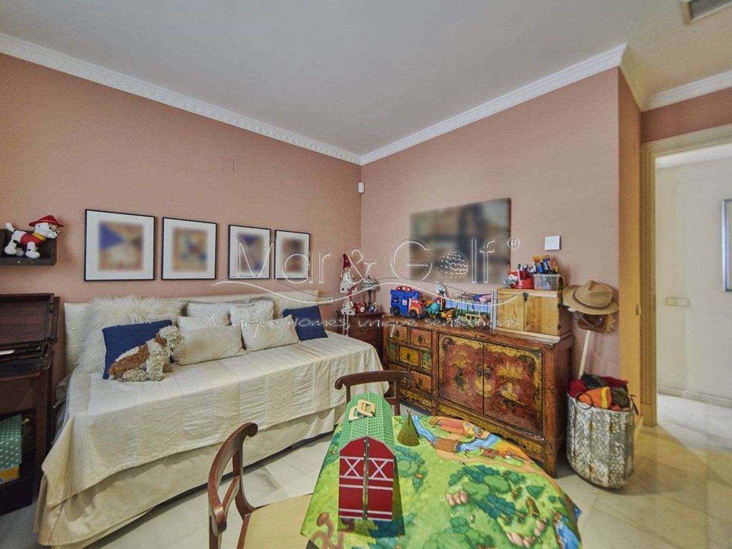 Una elegante escalera de caracol, de amplias dimensiones y con barandilla de forja, conduce a la zona de descanso, donde se distribuyen cuatro dormitorios adicionales y varios baños de refinado diseño. Cada estancia ha sido concebida como un espacio íntimo y sofisticado, con armarios empotrados y una cuidada atención al detalle. Destacan especialmente el despacho y la suite principal, ambos con acceso a una terraza privada desde la que se disfrutan privilegiadas vistas al mar.