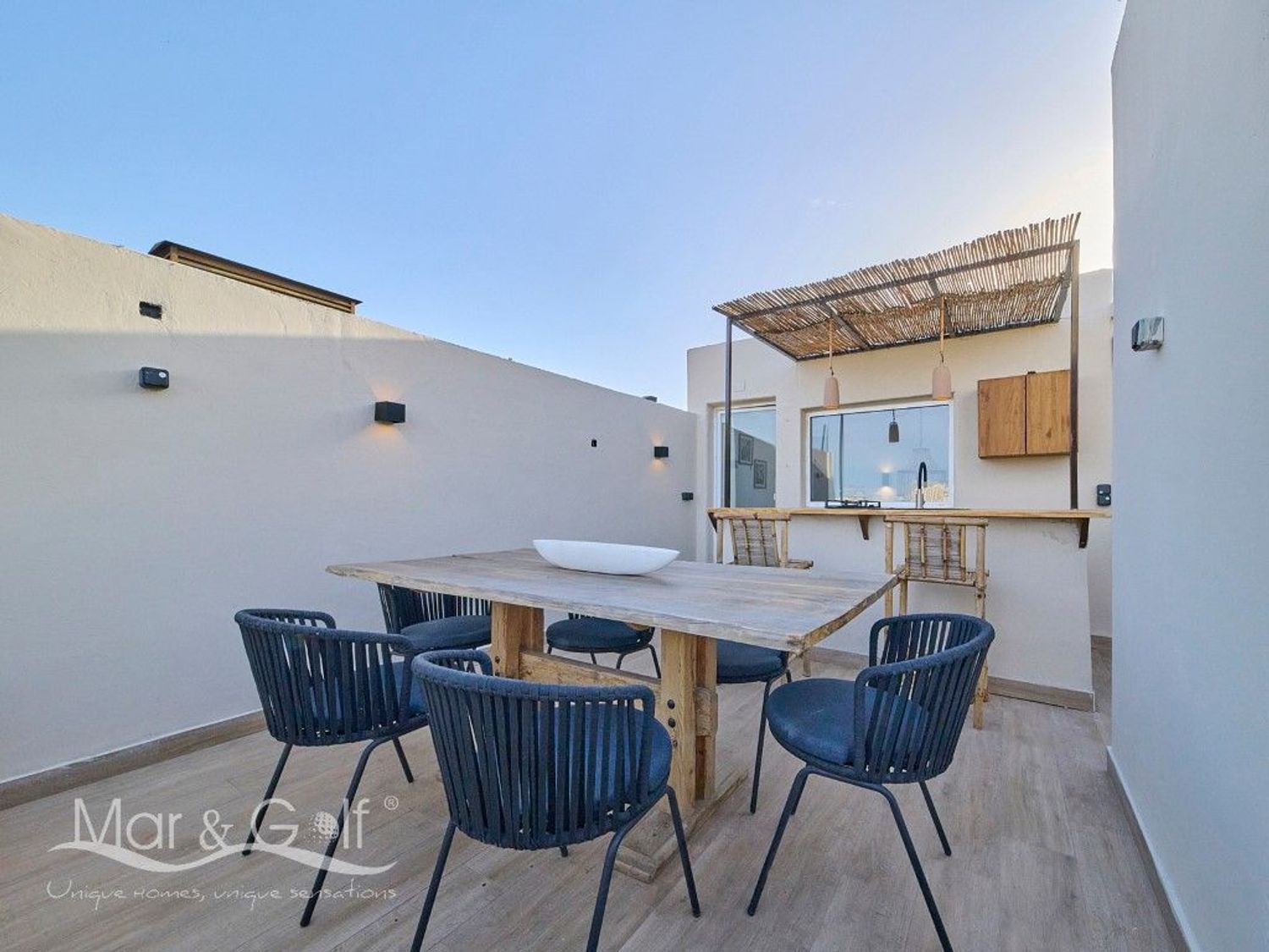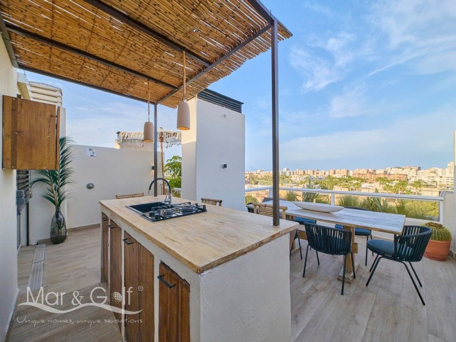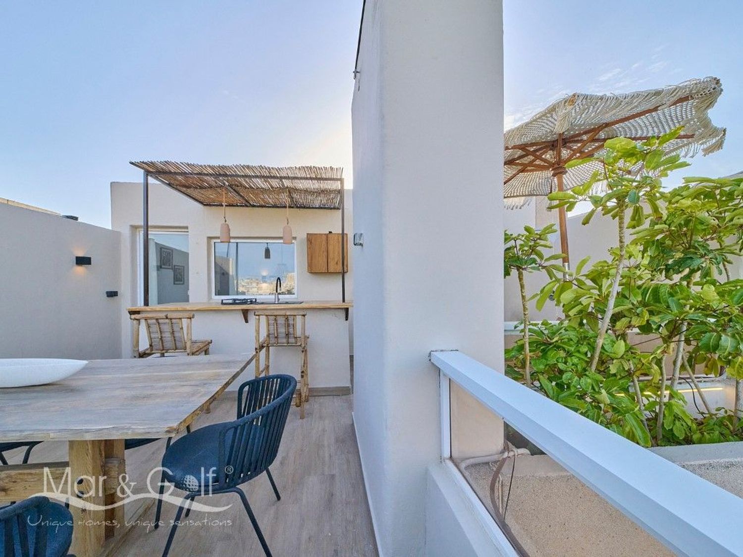 Este exclusivo ático destaca por su rooftop privado diseñado para el disfrute, un espacio único que combina funcionalidad y estilo mediterráneo. Su cocina exterior completamente equipada, cuenta además con una barra, convierte este espacio único en el lugar perfecto para reuniones y momentos al aire libre.