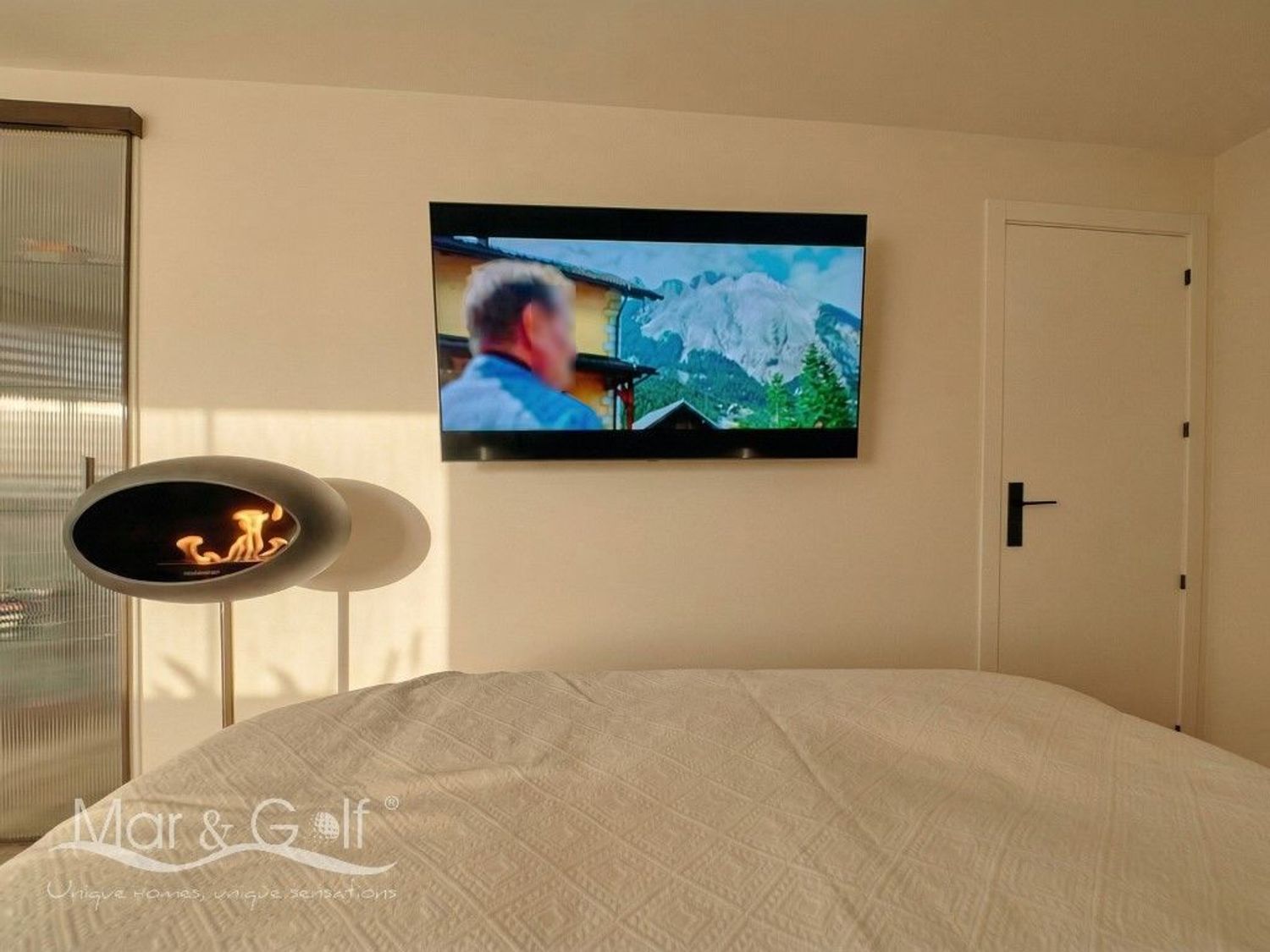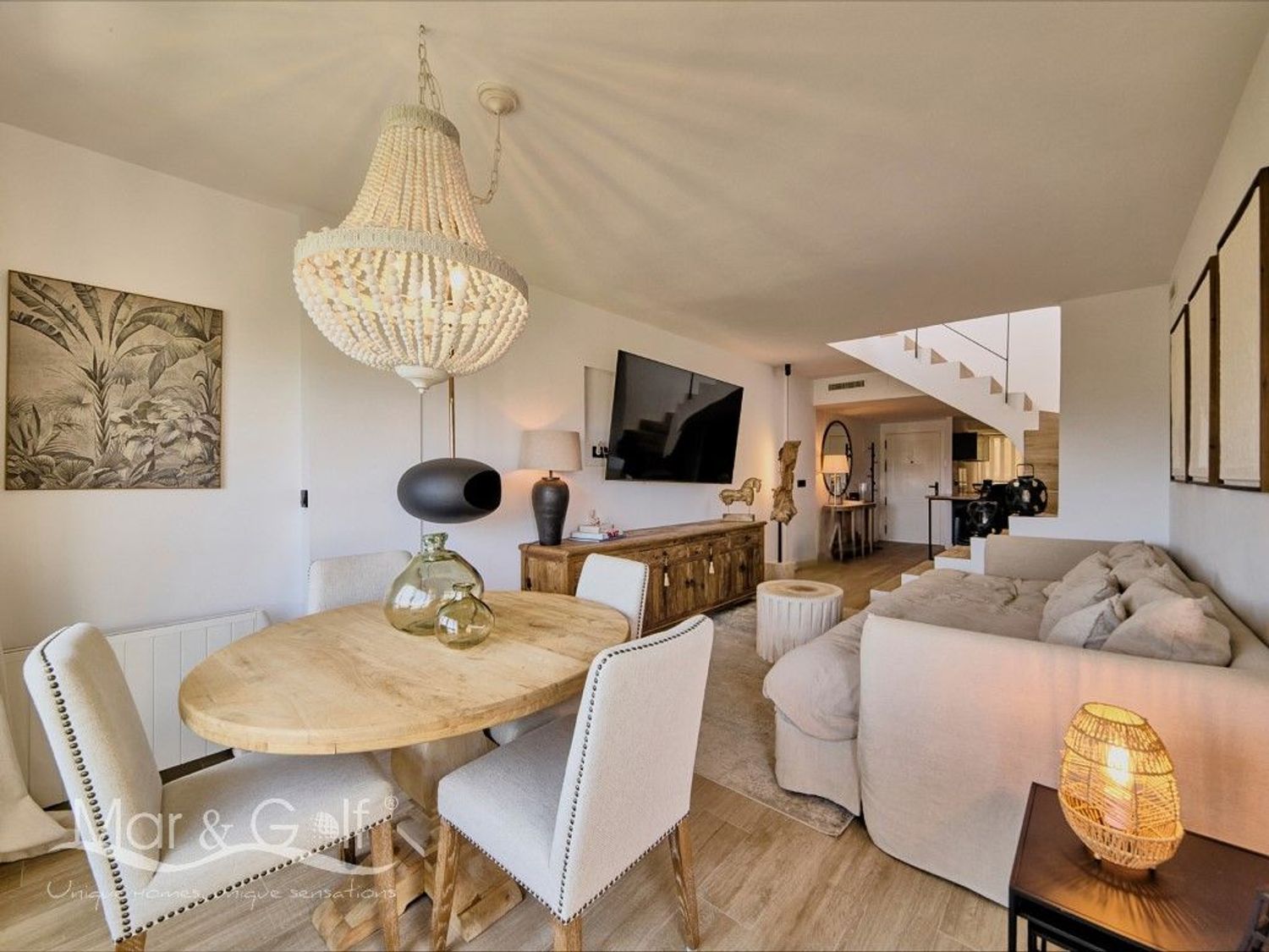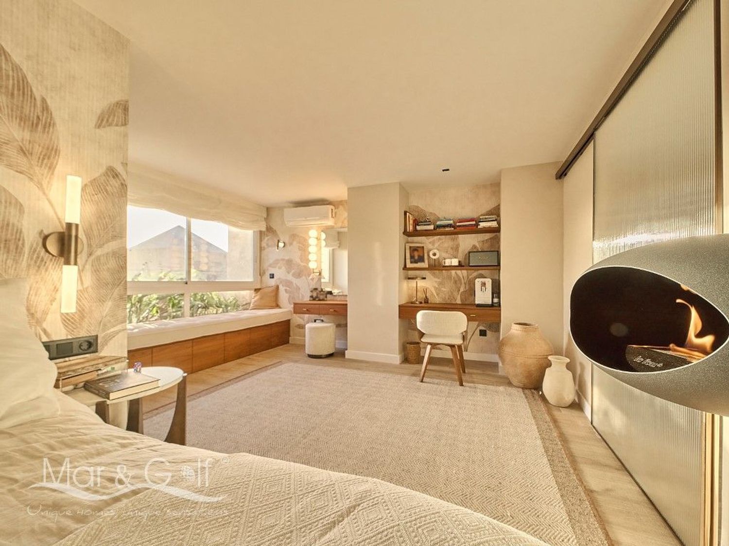 A nuestra llegada, el interior nos cautiva con un precioso hall recibidor abierto que nos deleita con un acogedor salón-comedor, amplio y luminoso, que se presenta como el corazón de la vivienda. Una elegante chimenea al aire, aporta carácter y confort, a la vez que eleva el ambiente. Este elemento distintivo se repite en la suite principal, creando un ambiente acogedor y exclusivo que permite disfrutar de la vivienda en cualquier época del año.