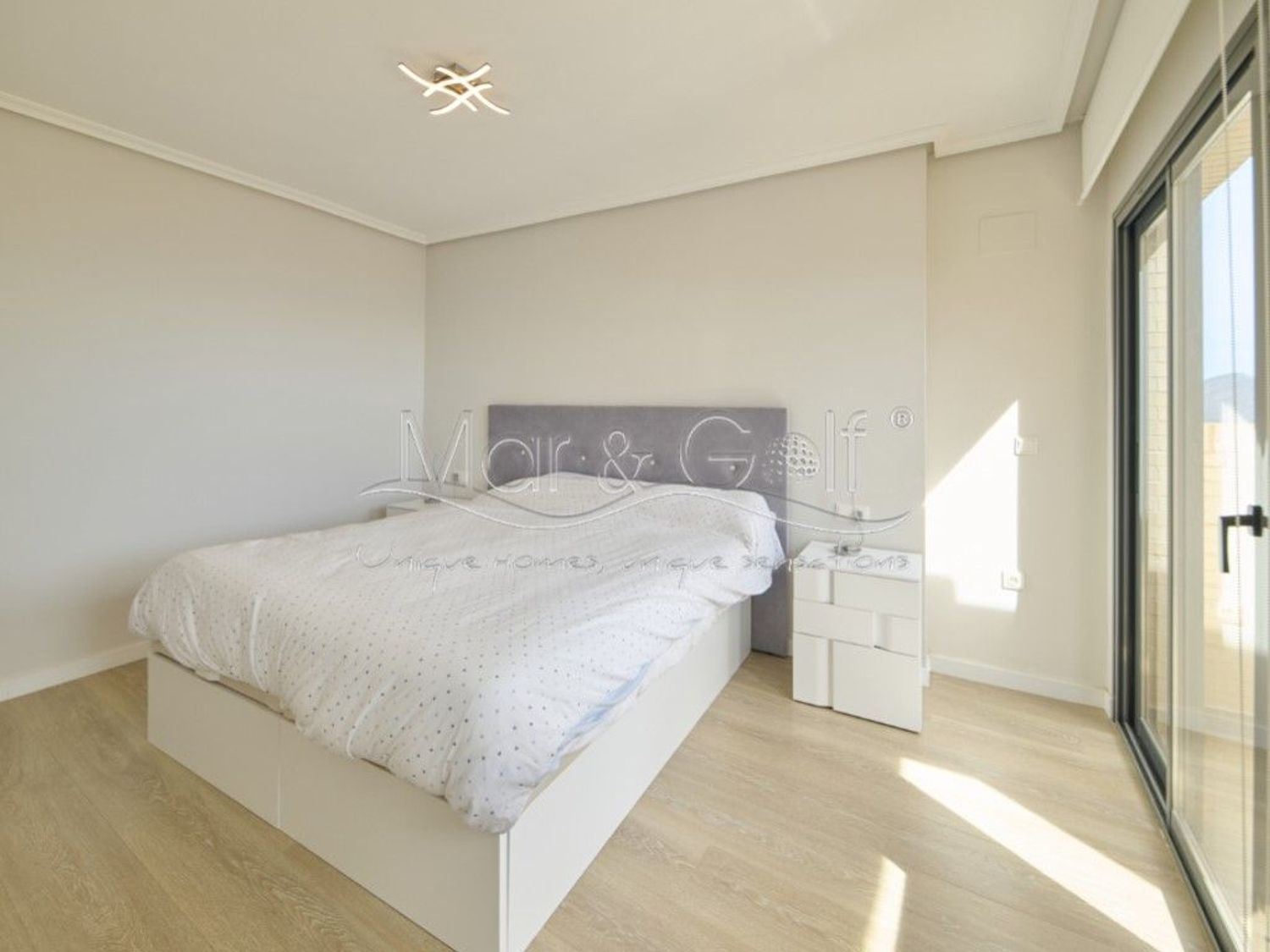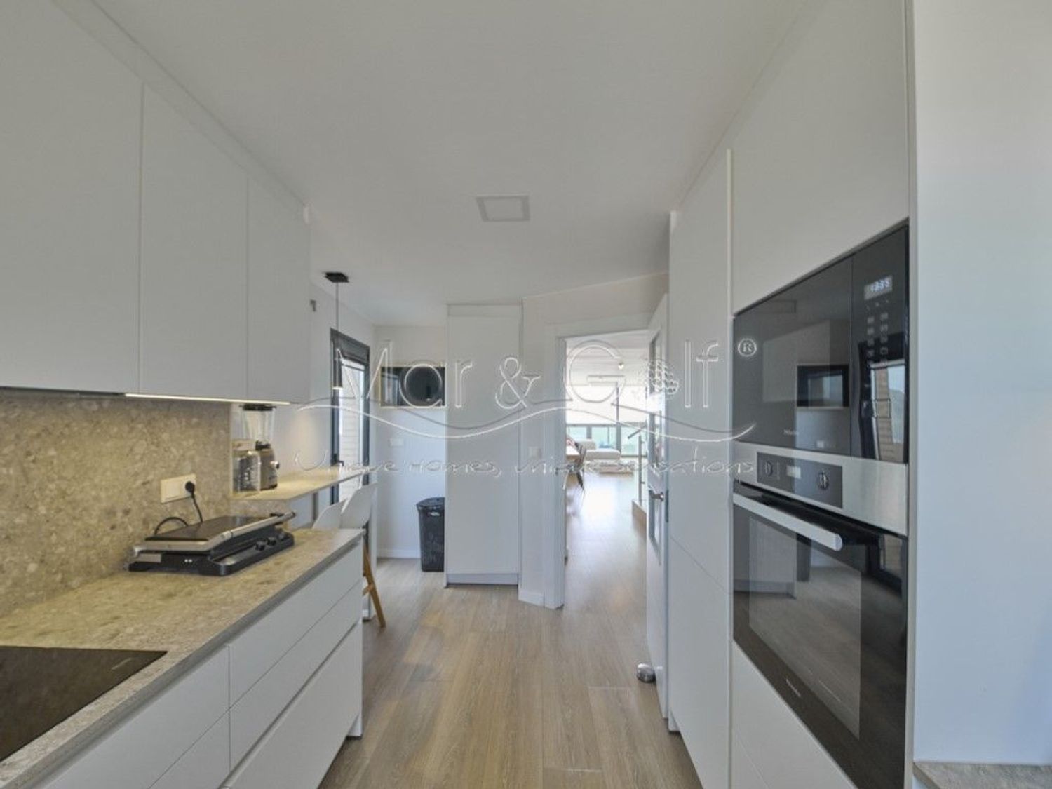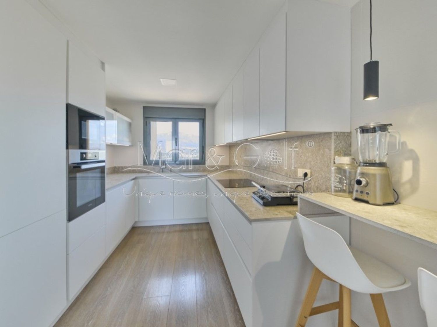 La propiedad ha sido reformada íntegramente con materiales de primer nivel, incorporando cerramientos de aluminio Cortizo con cristal Guardian Sun, suelos de tarima Quick-Step de alta gama, armarios italianos Molteni, mobiliario de diseño y piezas icónicas como el sofá Natuzzi. Los baños, equipados con firmas como Roca y Grohe, reflejan un cuidado excepcional por el detalle.