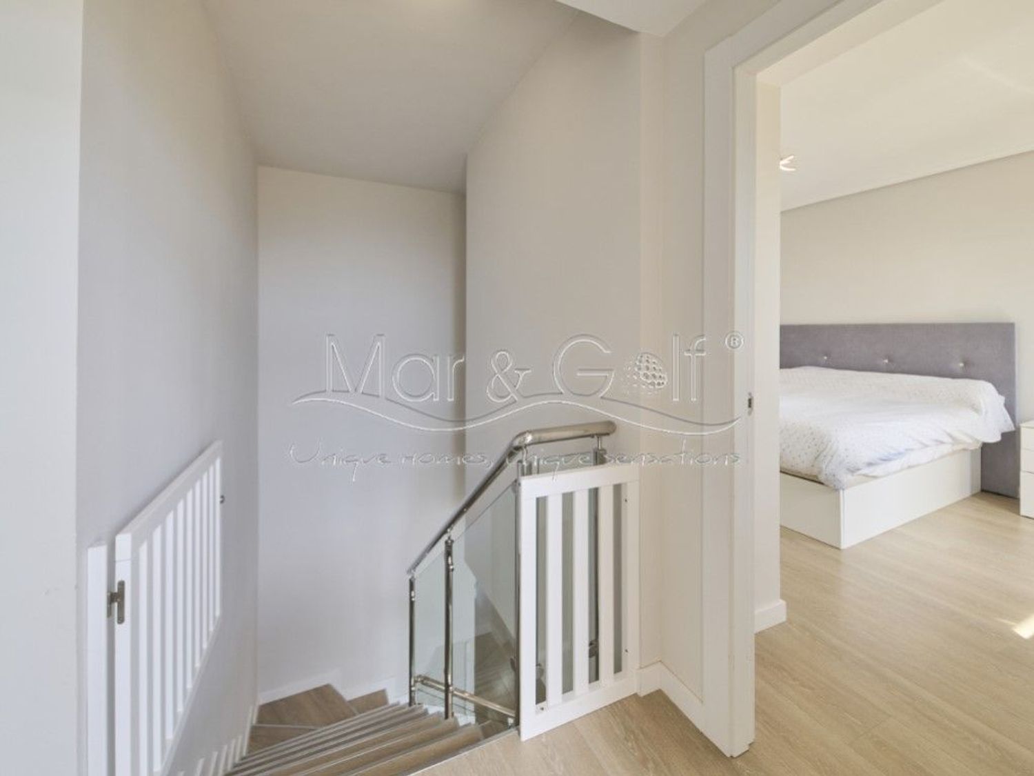 Ubicado en una urbanización privada de alto nivel, la vivienda se distribuye en dos plantas que articulan con elegancia las zonas de día y de descanso. En la planta principal, un amplio y luminoso salón-comedor, amueblado con piezas de diseño, se convierte en el eje del hogar. La cocina, de la firma Schüller y equipada con electrodomésticos Miele, destaca por su sofisticación y funcionalidad. Este nivel se completa con un dormitorio, un baño completo y un práctico balcón destinado a zona de lavado.