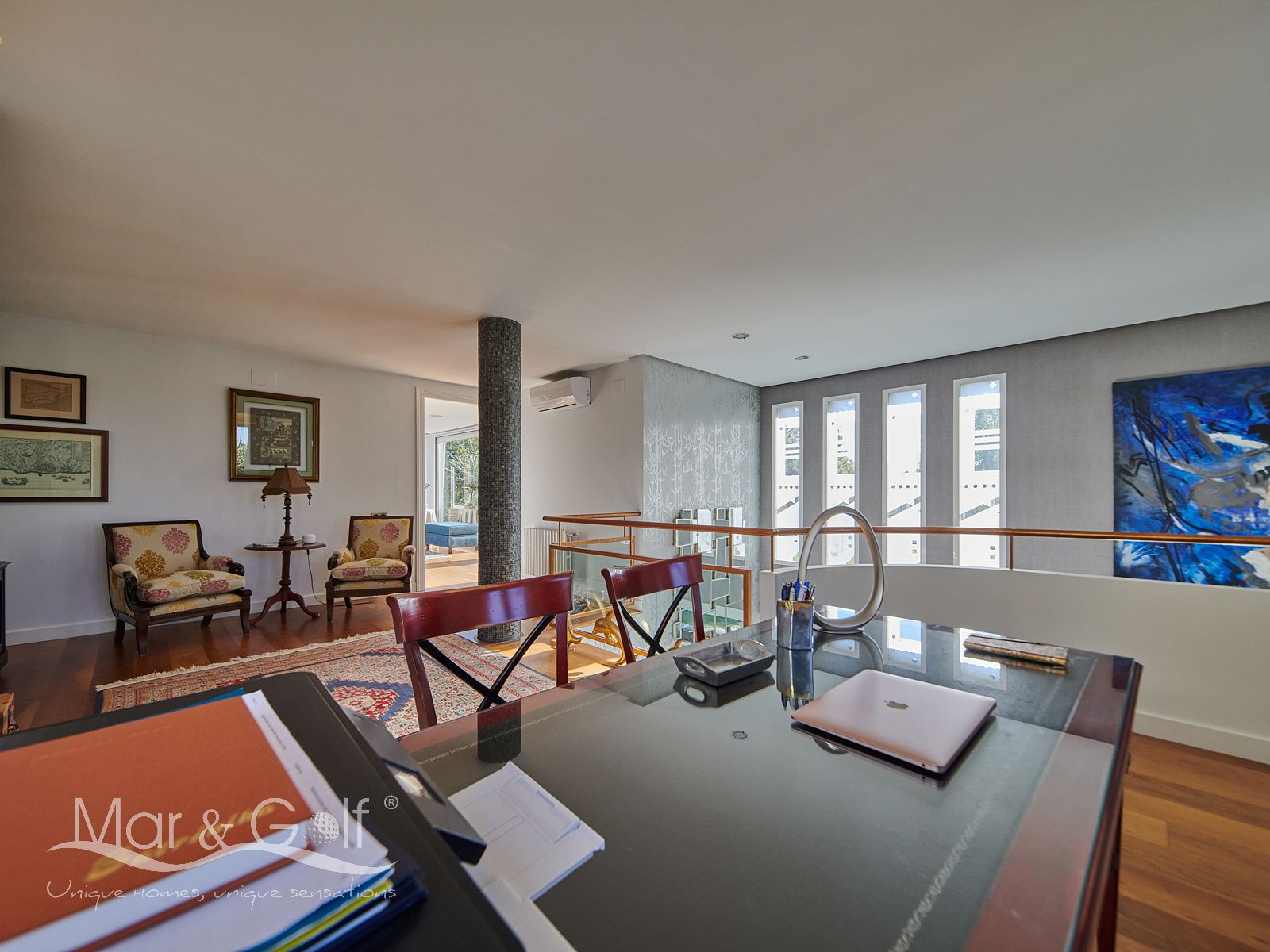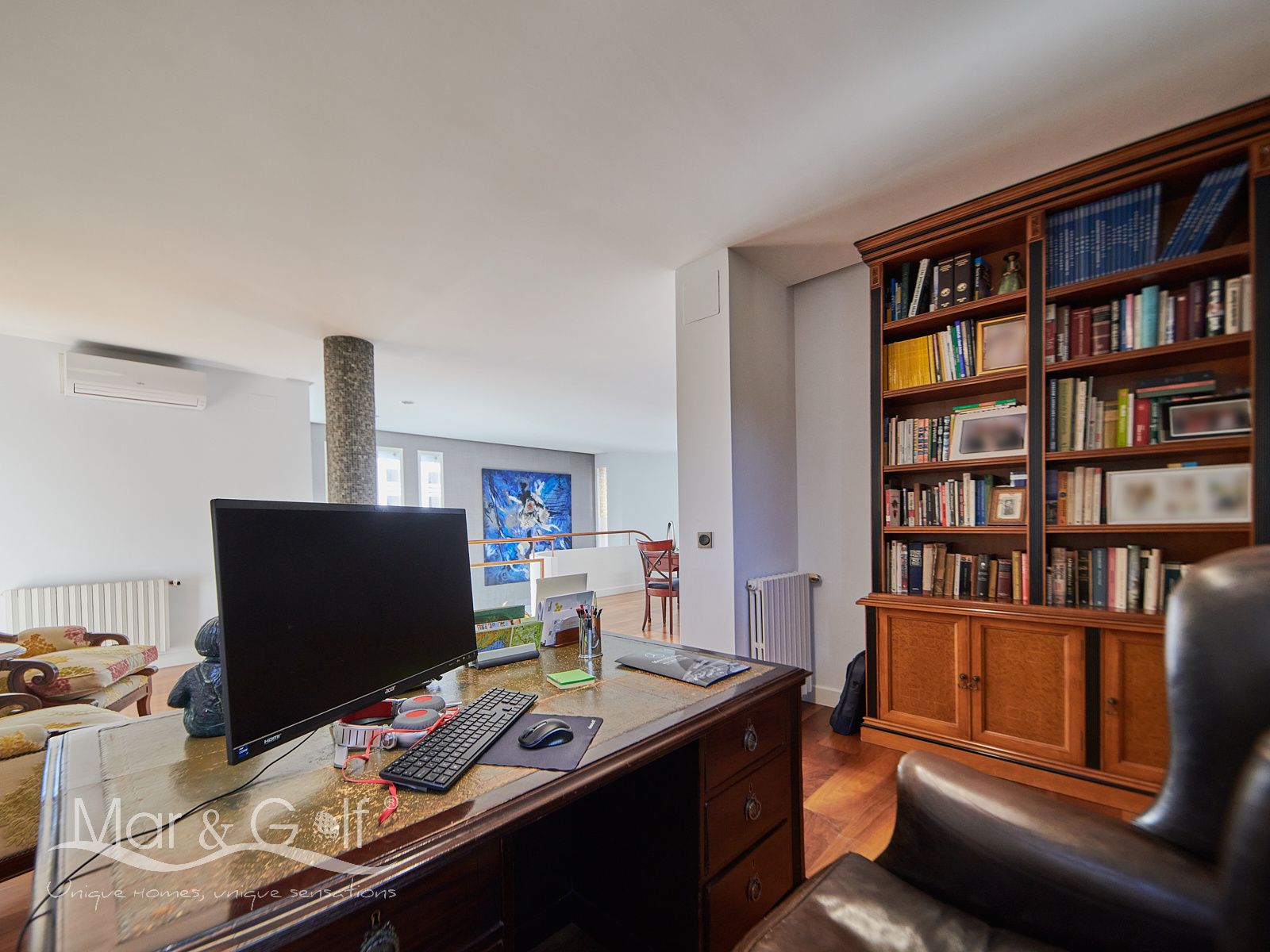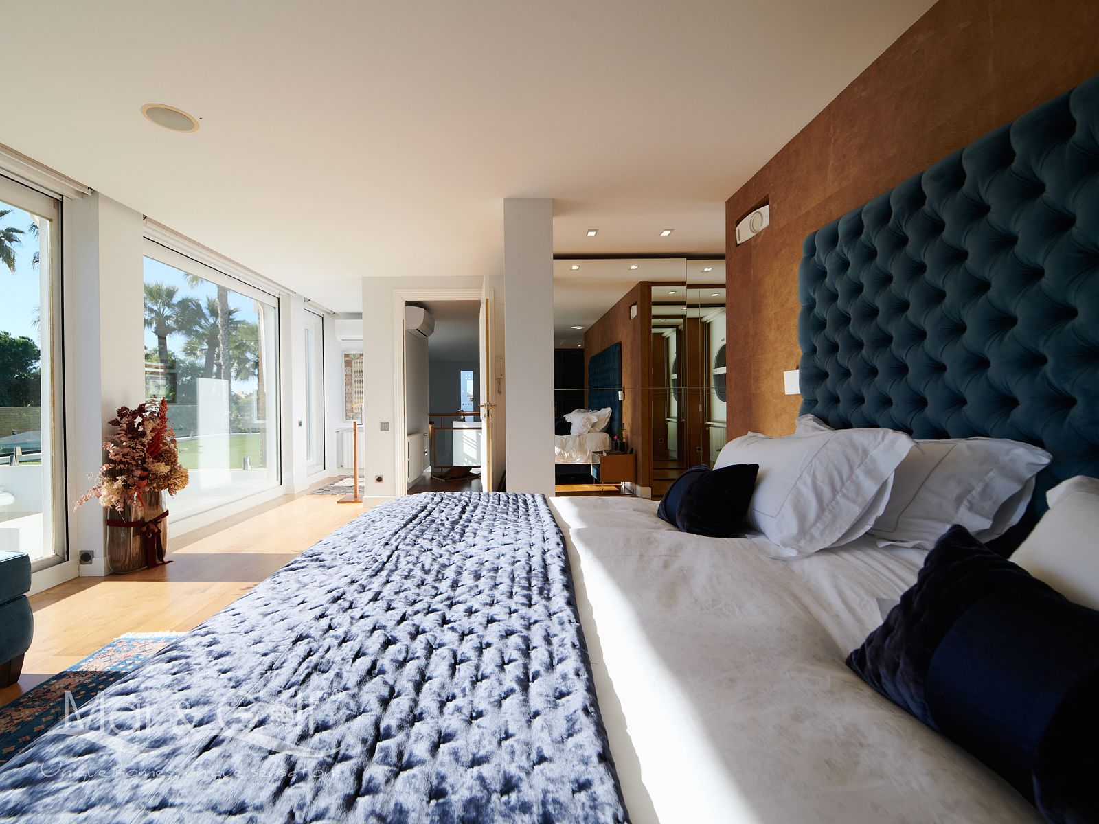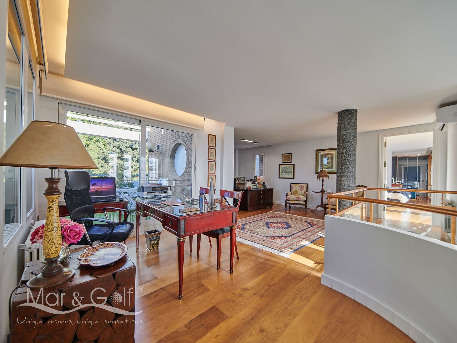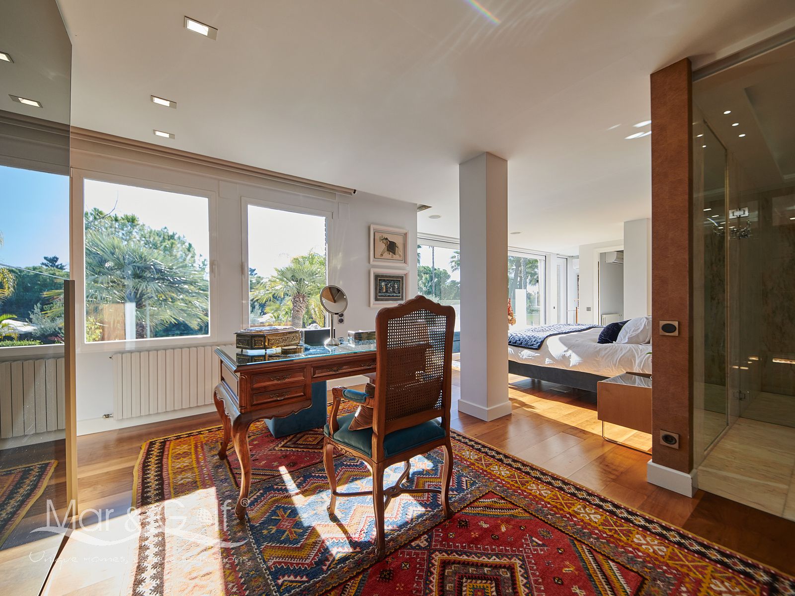 La primera planta es un refugio privado ya que consta de un gran despacho que conecta directamente con la majestuosa suite principal. Este espacio íntimo incorpora un baño con bañera y ducha, vestidor, dos splits frío/calor y dos encantadoras terrazas descubiertas para disfrutar del amanecer o del silencio del atardecer.