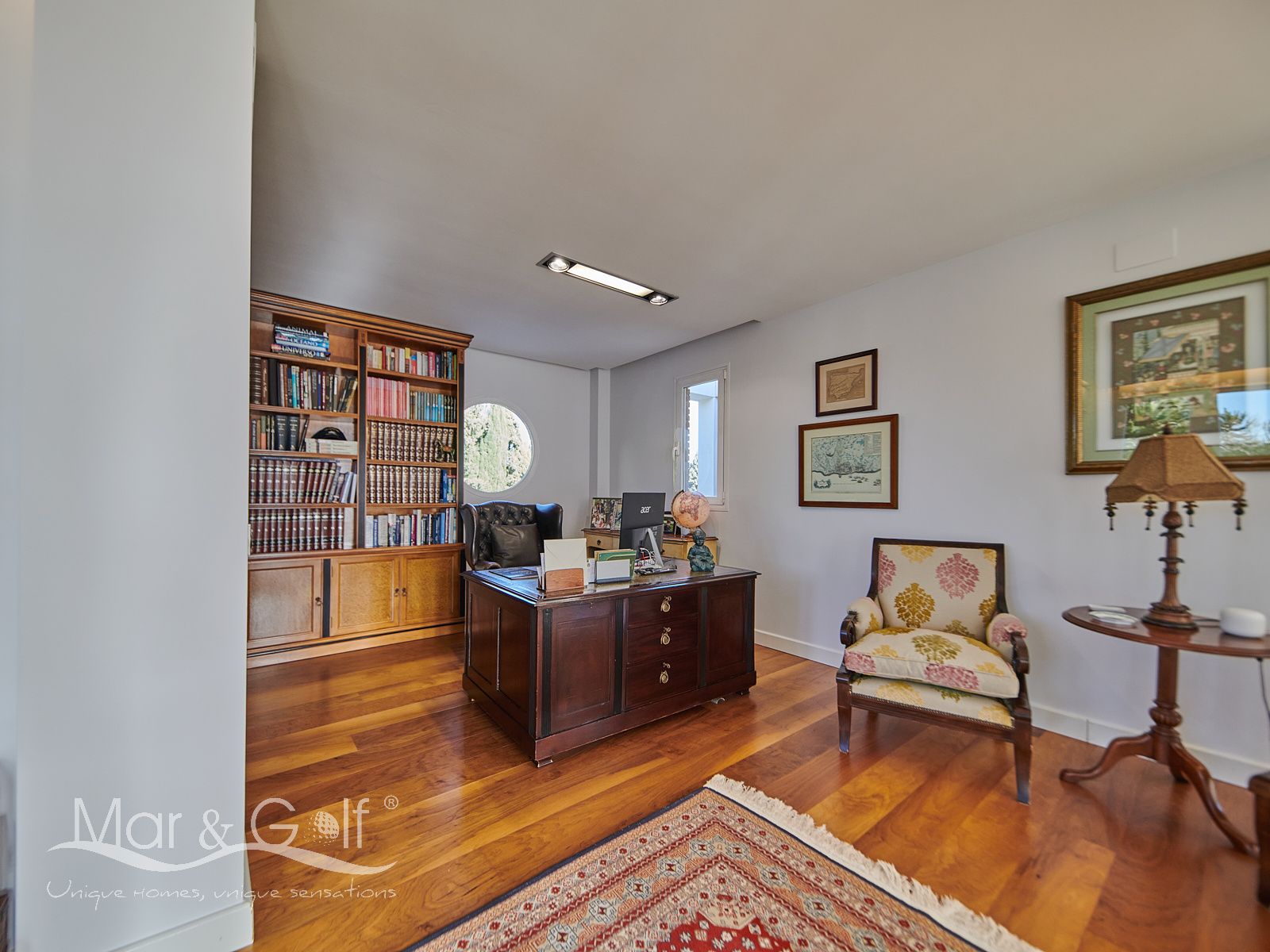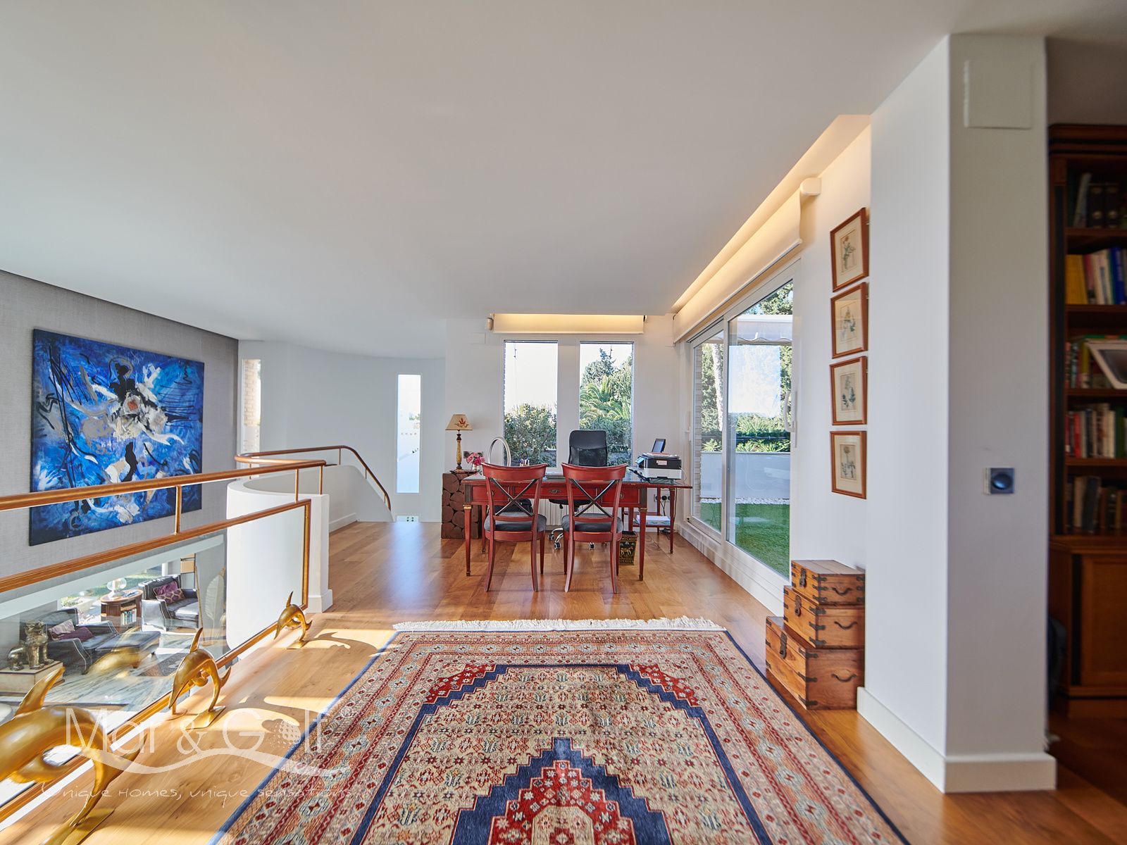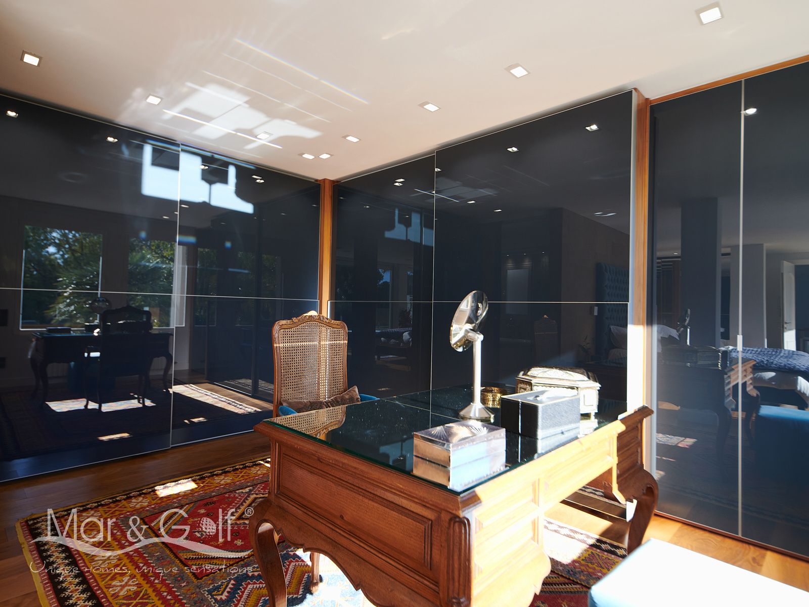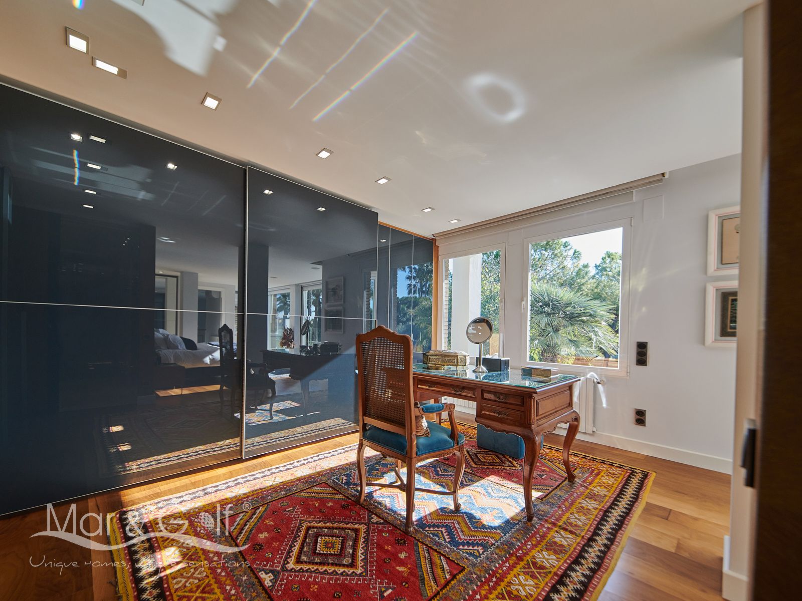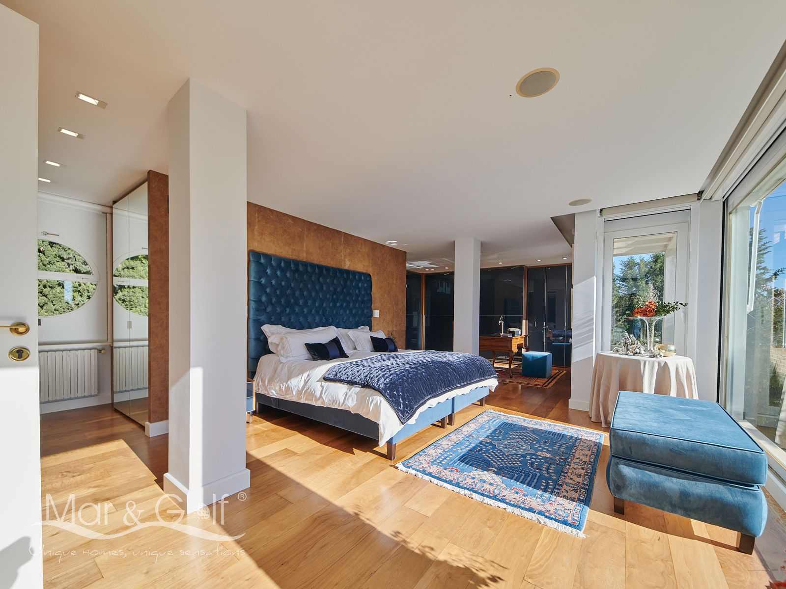 La primera planta es un refugio privado ya que consta de un gran despacho que conecta directamente con la majestuosa suite principal. Este espacio íntimo incorpora un baño con bañera y ducha, vestidor, dos splits frío/calor y dos encantadoras terrazas descubiertas para disfrutar del amanecer o del silencio del atardecer.