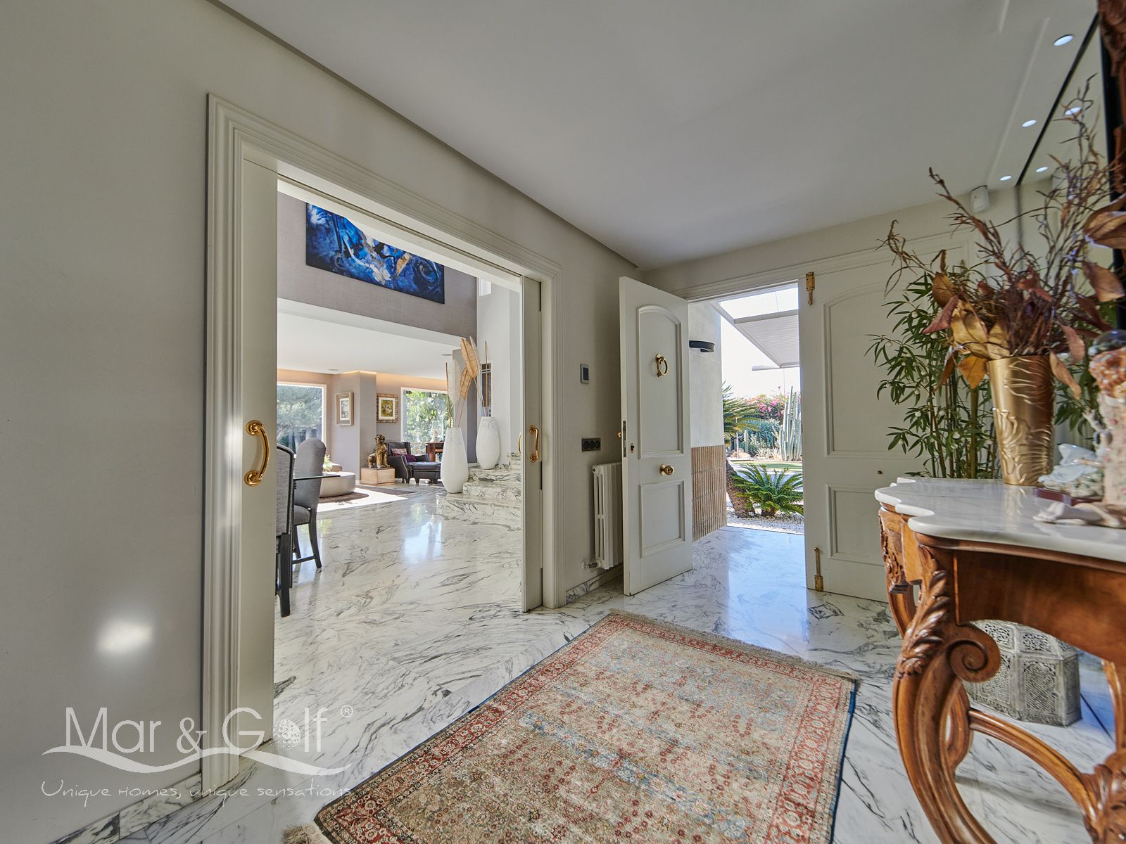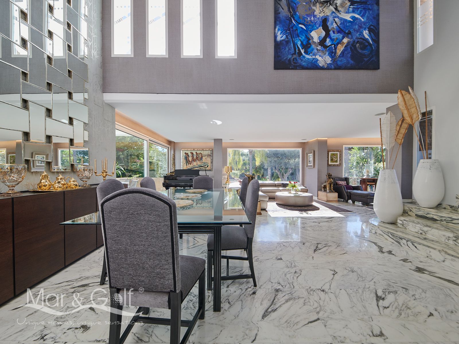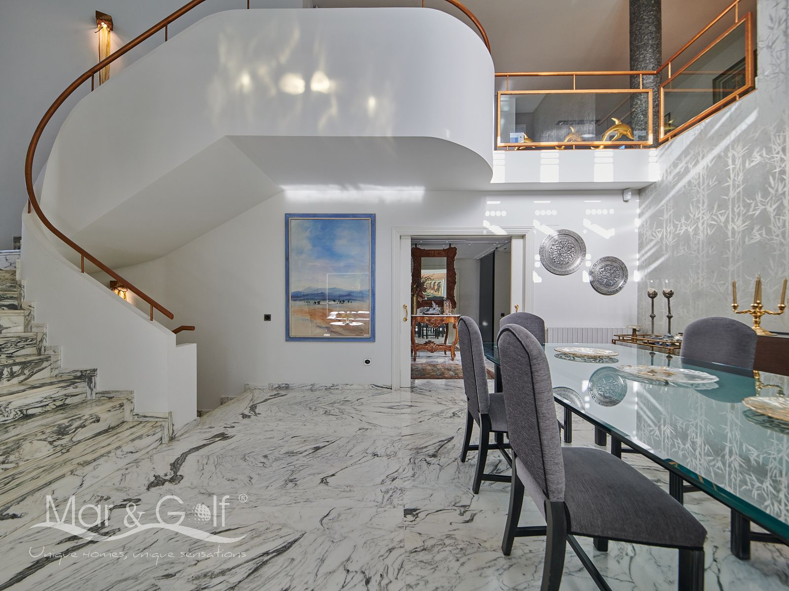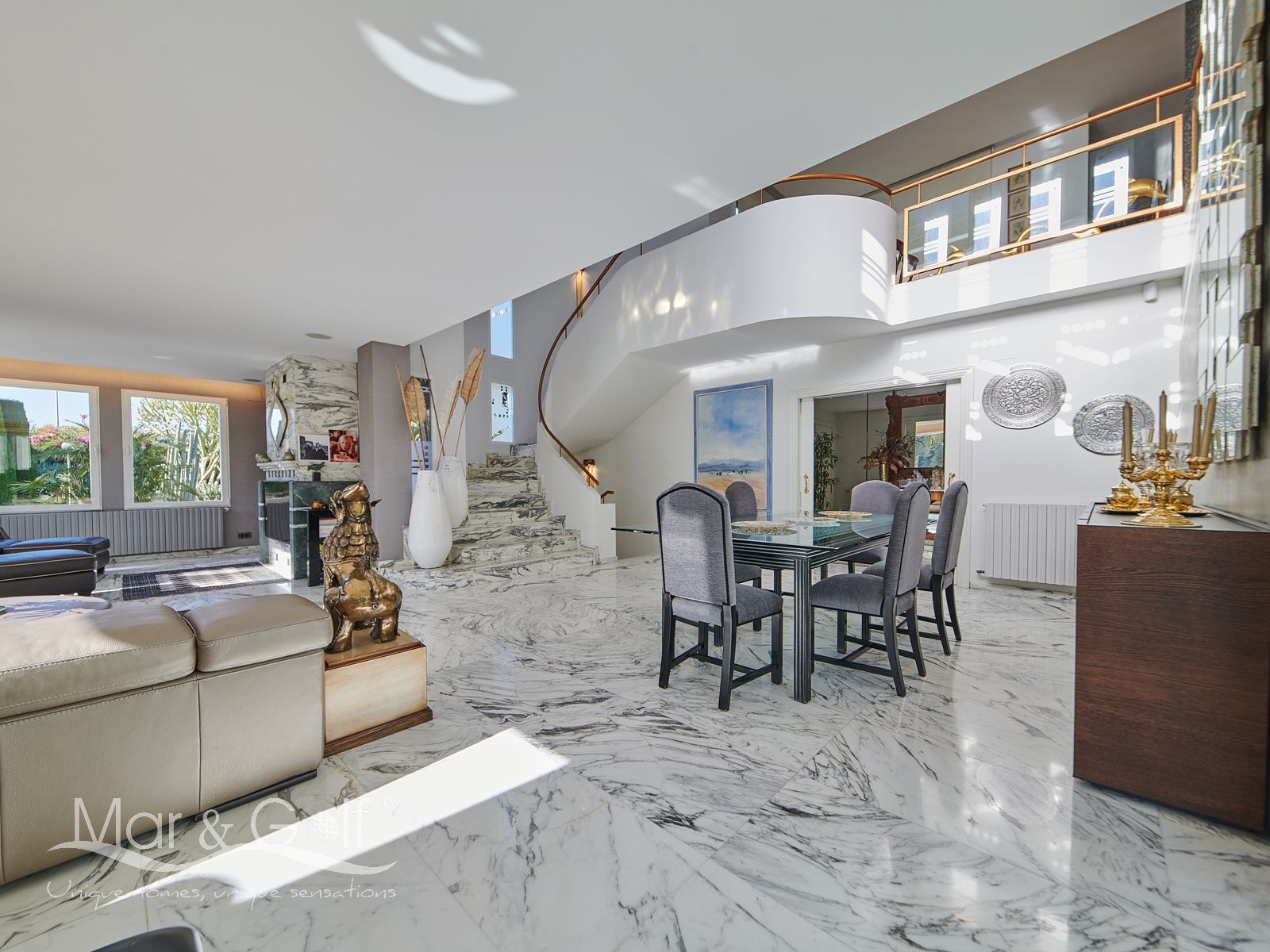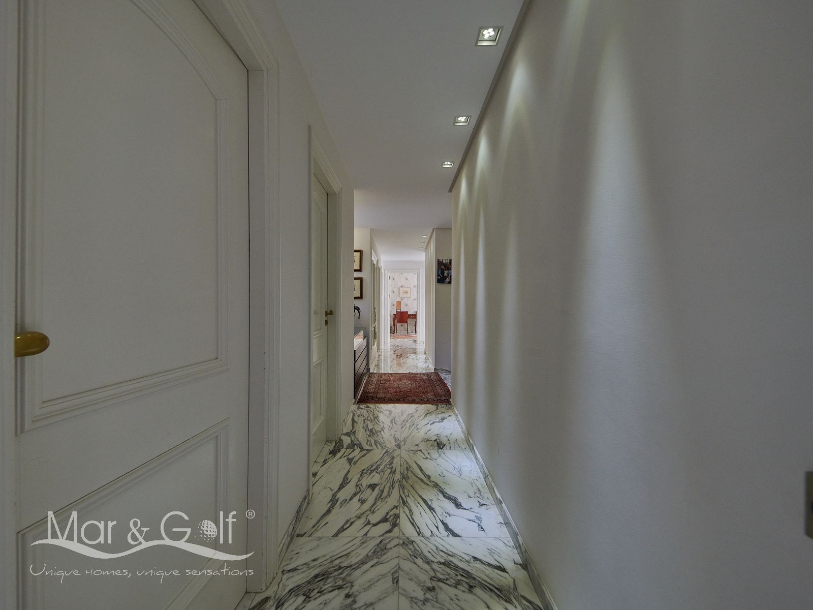 Toda la planta cuenta con un exquisito suelo de mármol arabescato, que suma sofisticación y elegancia a la estancia.