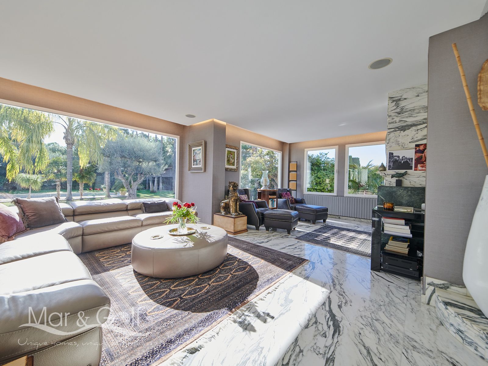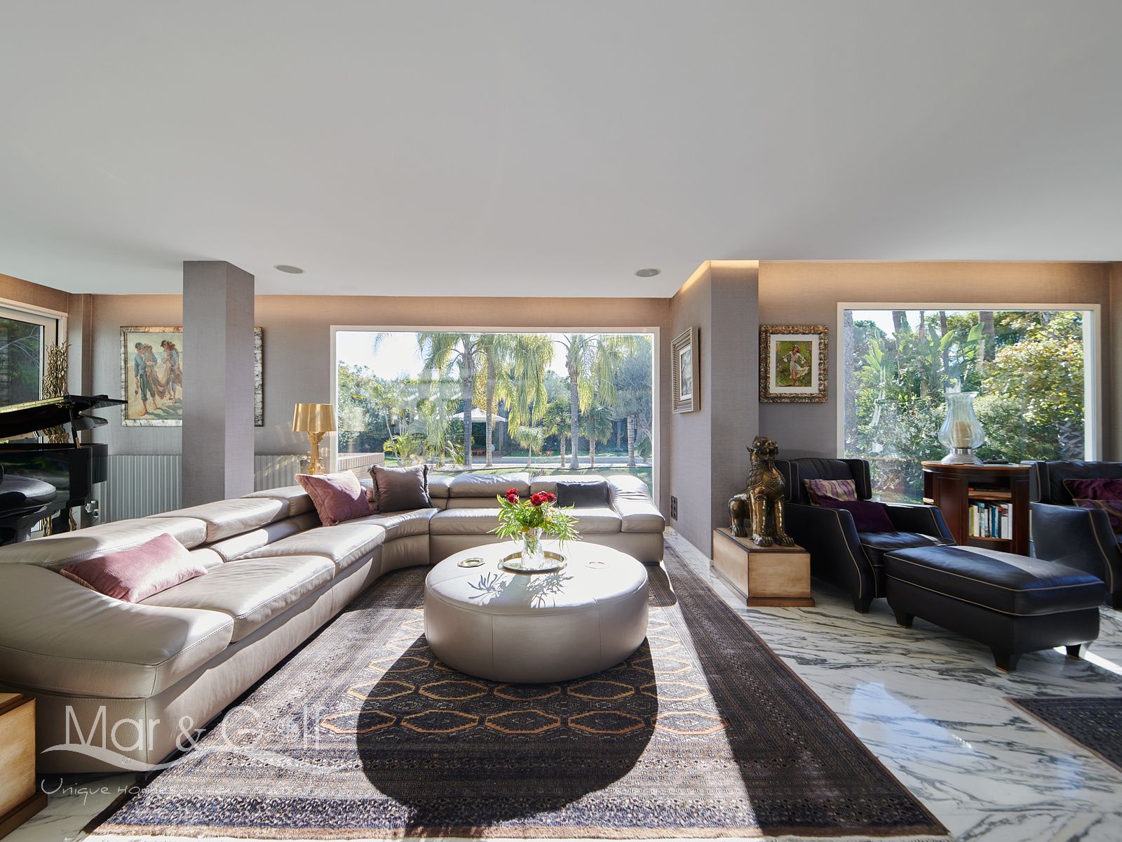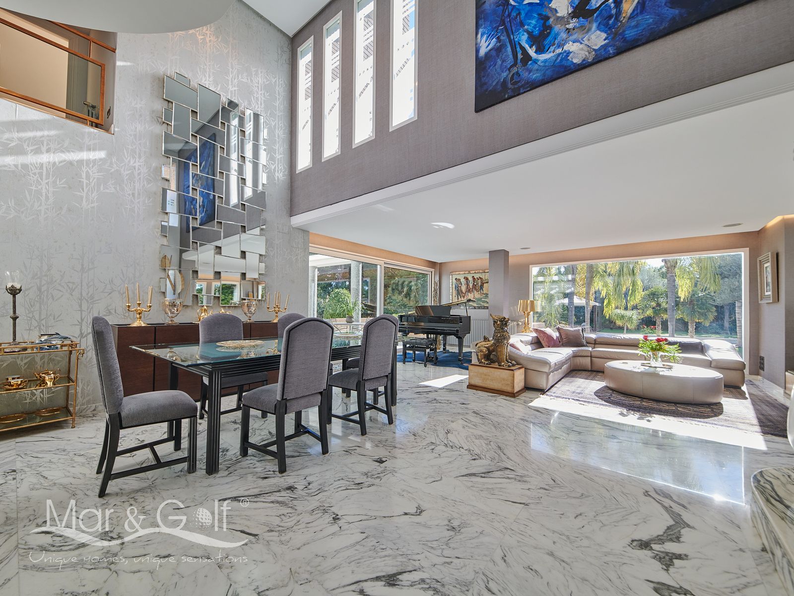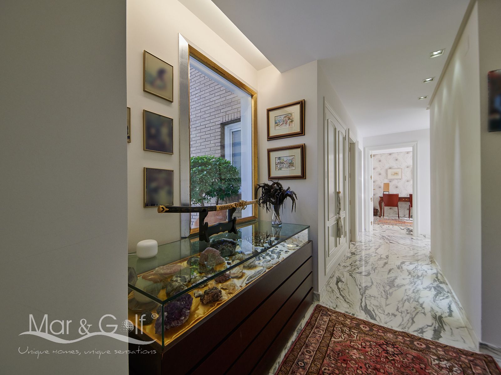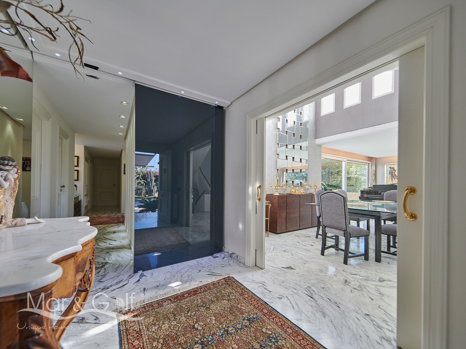 Toda la planta cuenta con un exquisito suelo de mármol arabescato, que suma sofisticación y elegancia a la estancia.