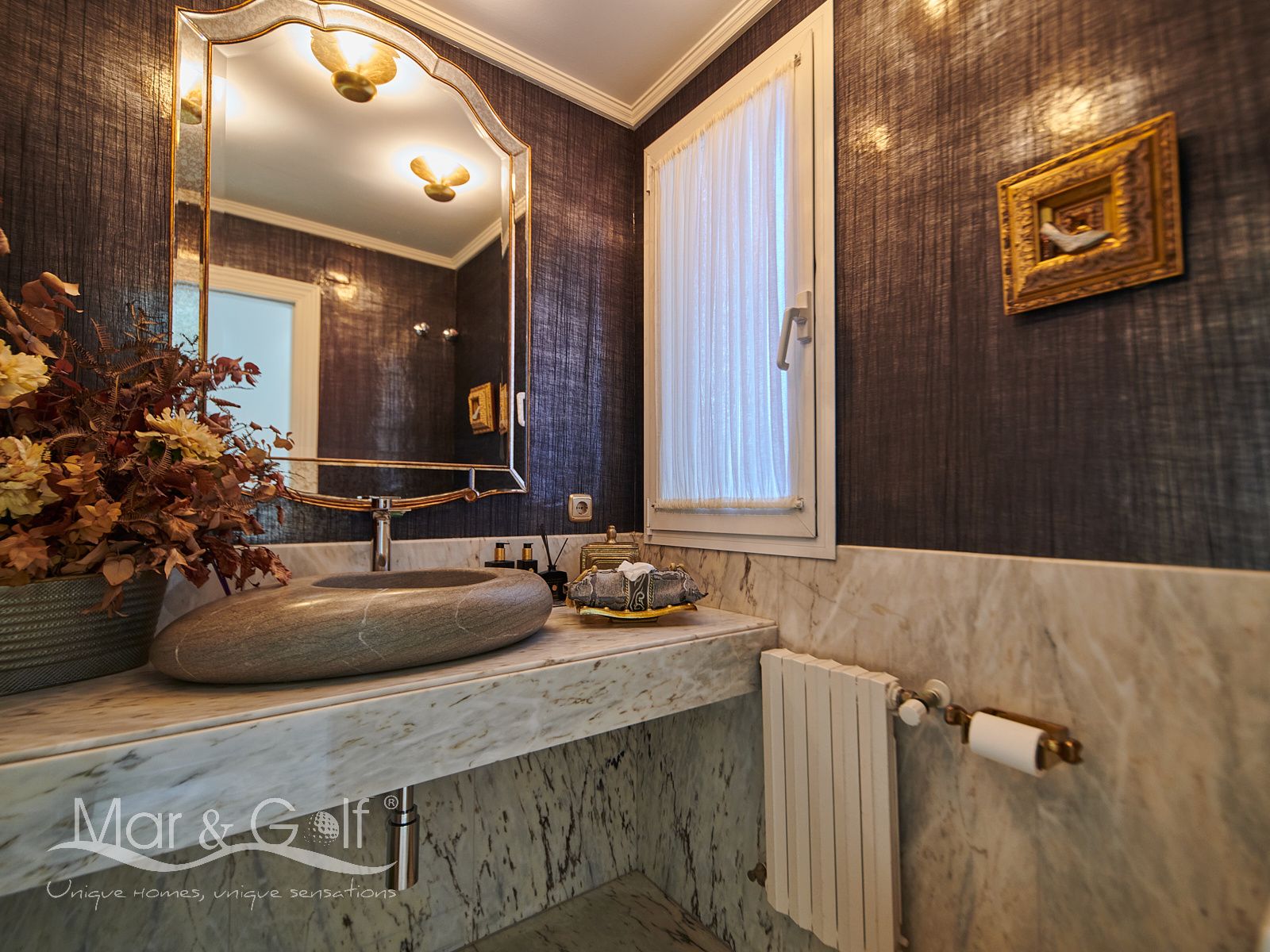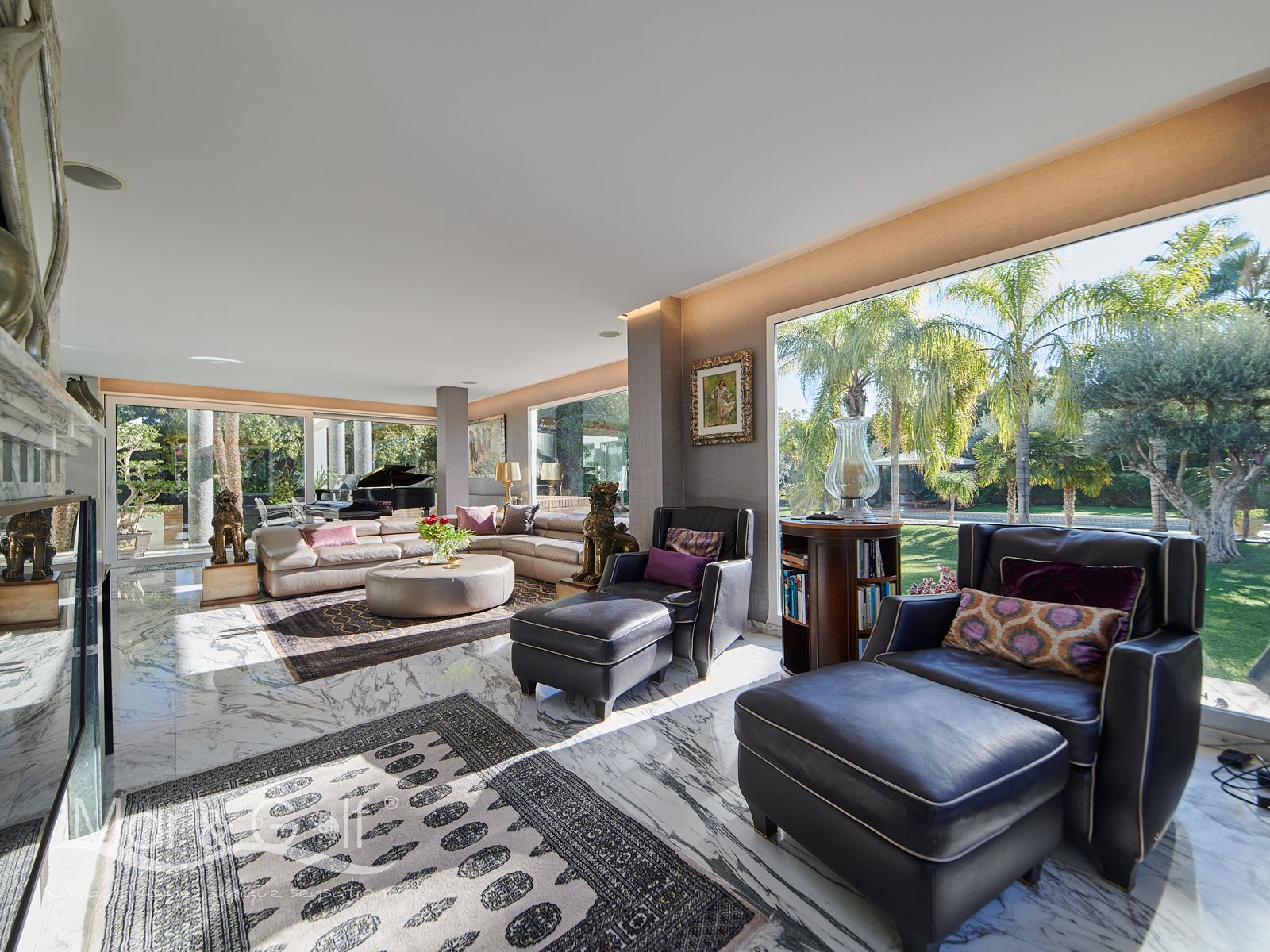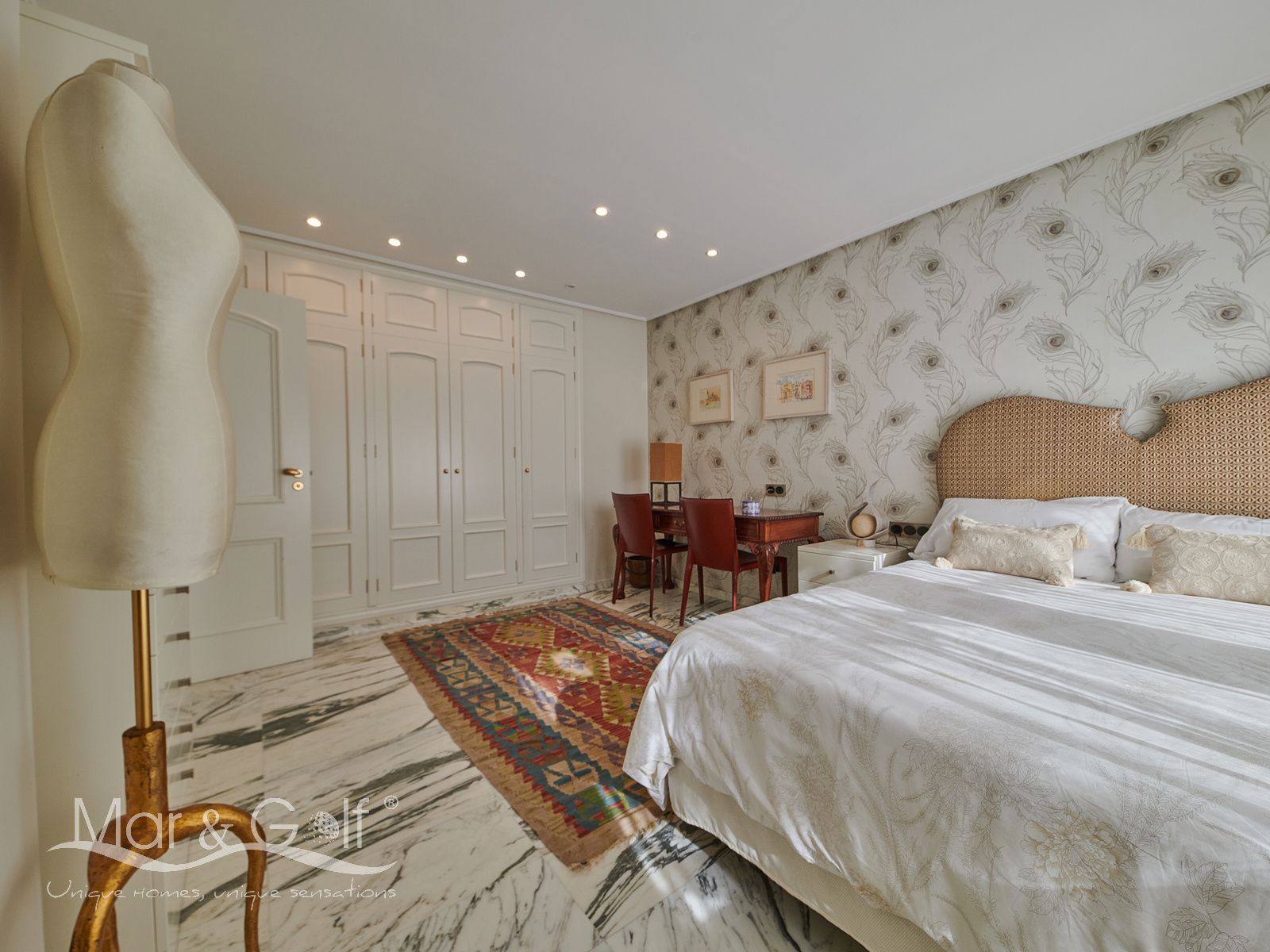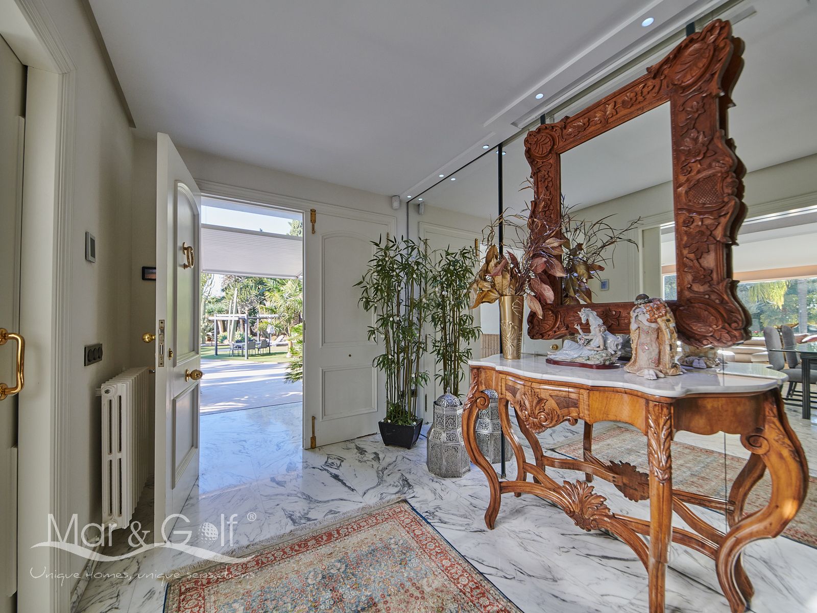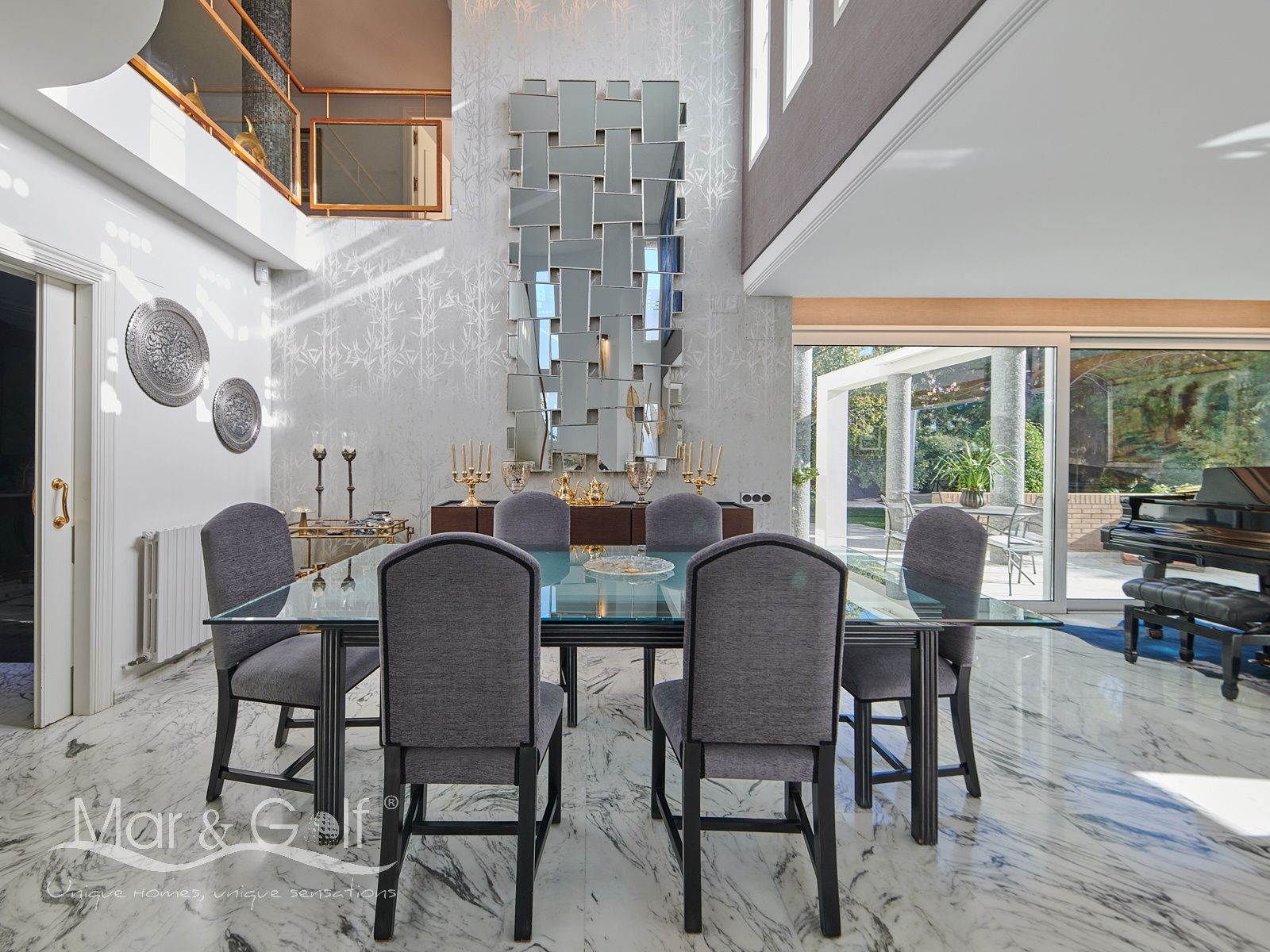 Toda la planta cuenta con un exquisito suelo de mármol arabescato, que suma sofisticación y elegancia a la estancia.