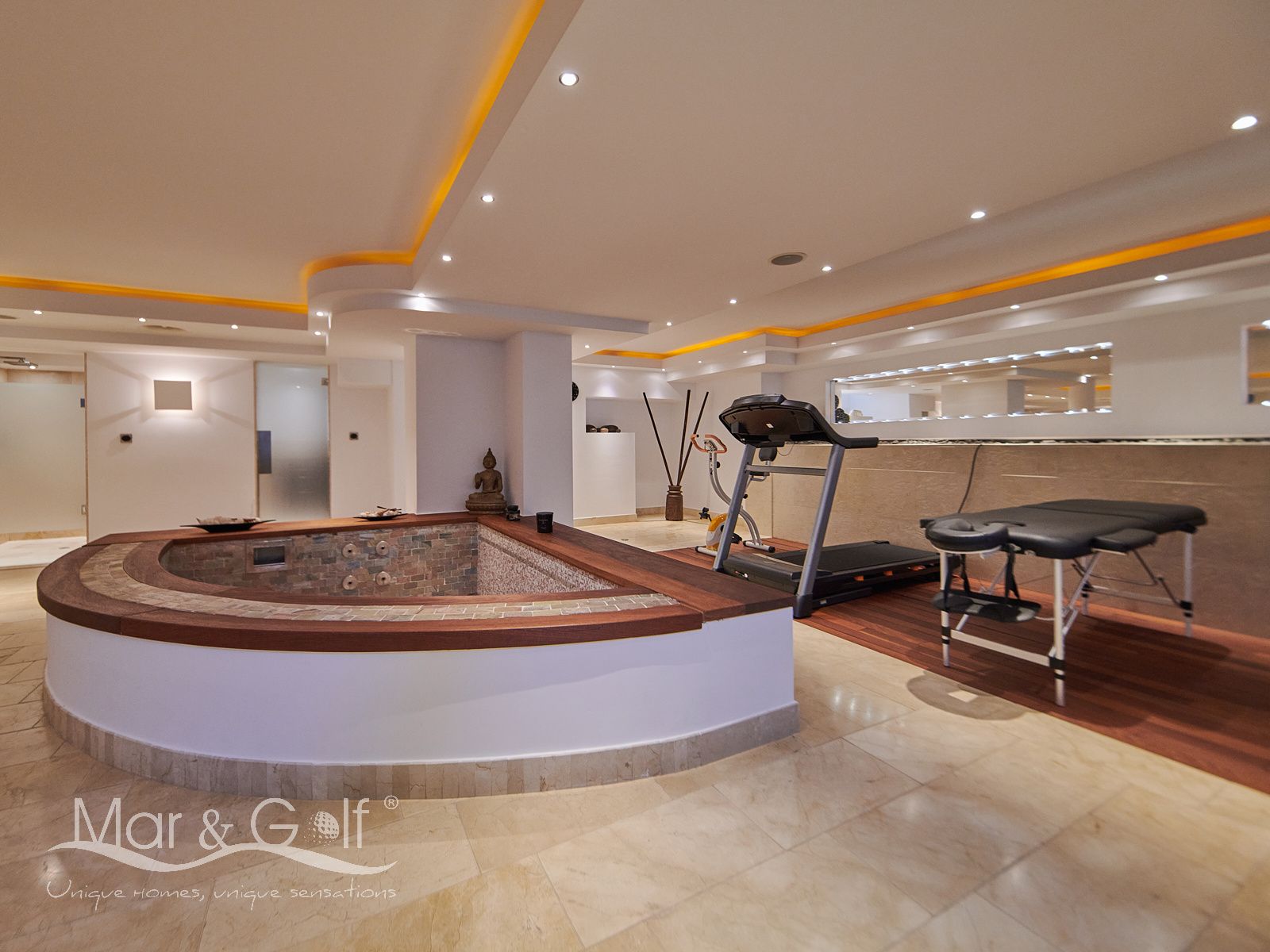Consta de piscina climatizada interior, con la versatilidad de cubrirse con tarimas de madera para transformar el espacio en un gimnasio totalmente utilizable, sauna de vapor y baño completo con áreas separadas para aseo y ducha.