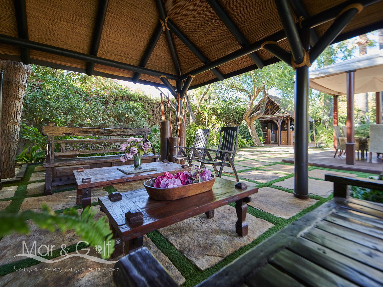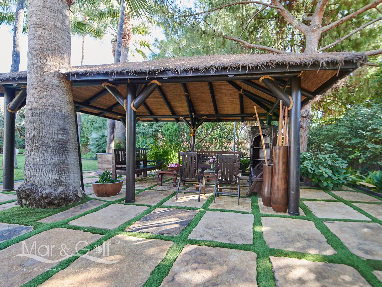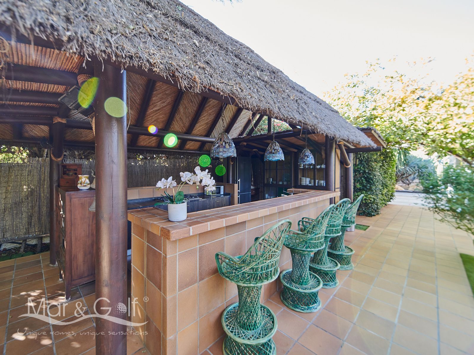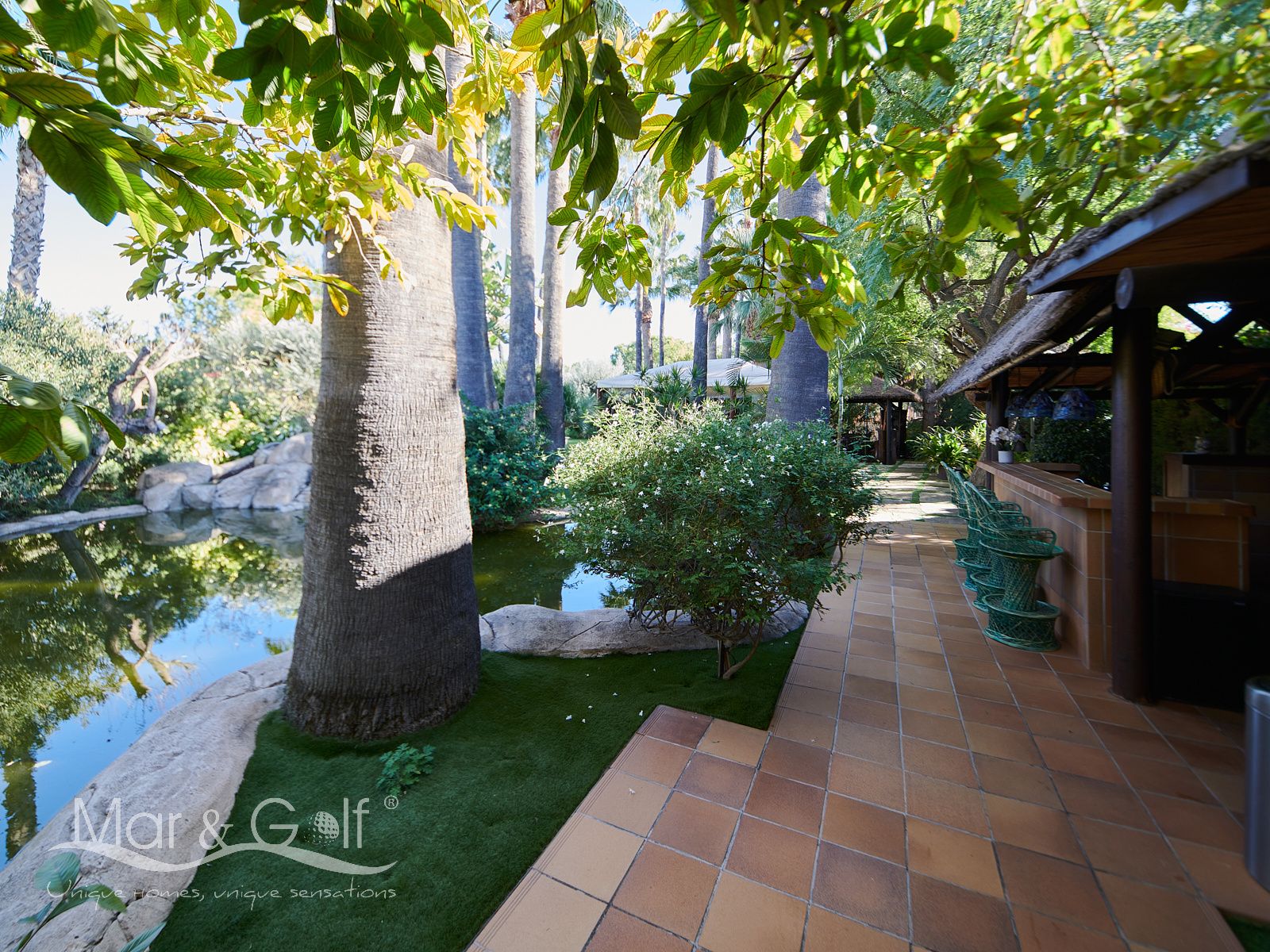 La zona exterior es paraíso privado dentro de la ciudad. La villa se extiende sobre más de 5.000 m² de escenario natural excepcional con árboles frutales y pinada privada, dos lagos artificiales, piscina exterior, cocina exterior techada, baño completo en la zona de piscina, parking exterior con punto de carga eléctrica y dos ambientes chill-out de inspiración balinesa, perfectos para comer, relajarse o disfrutar de veladas inolvidables.