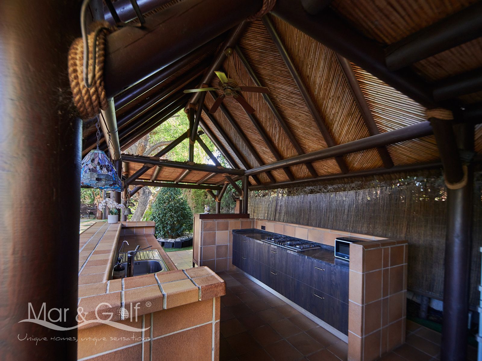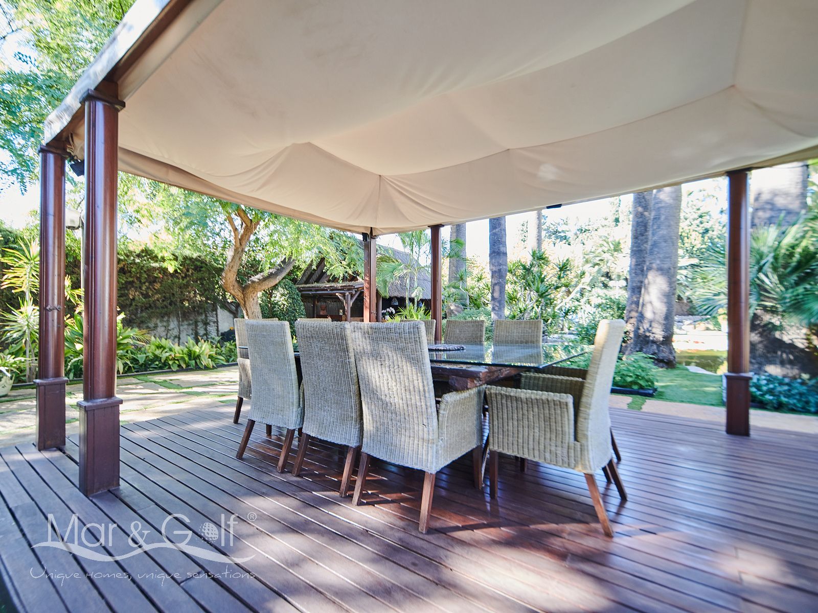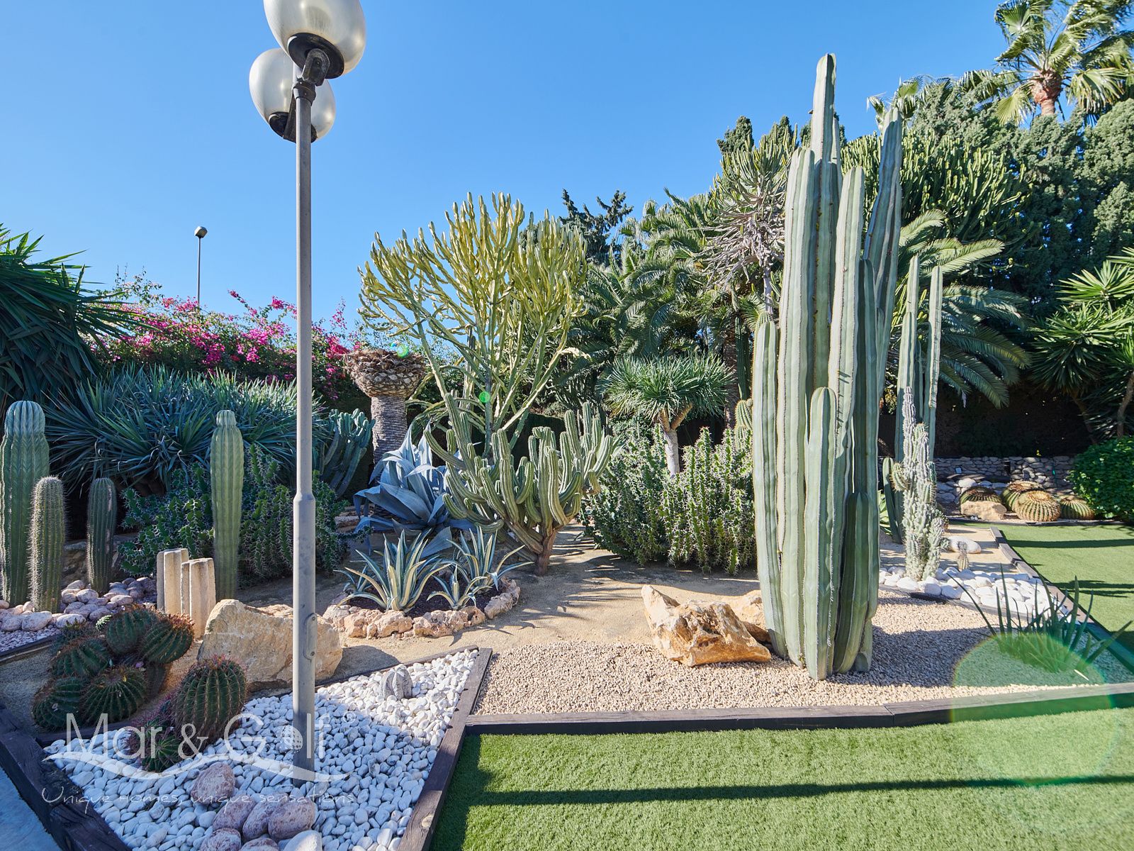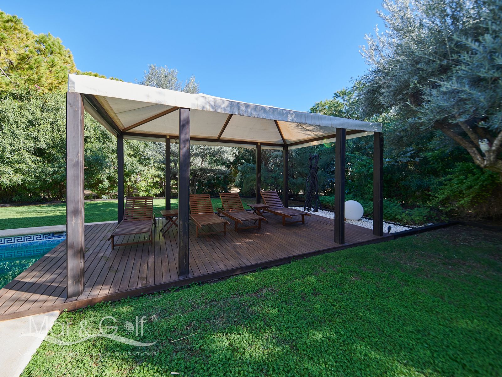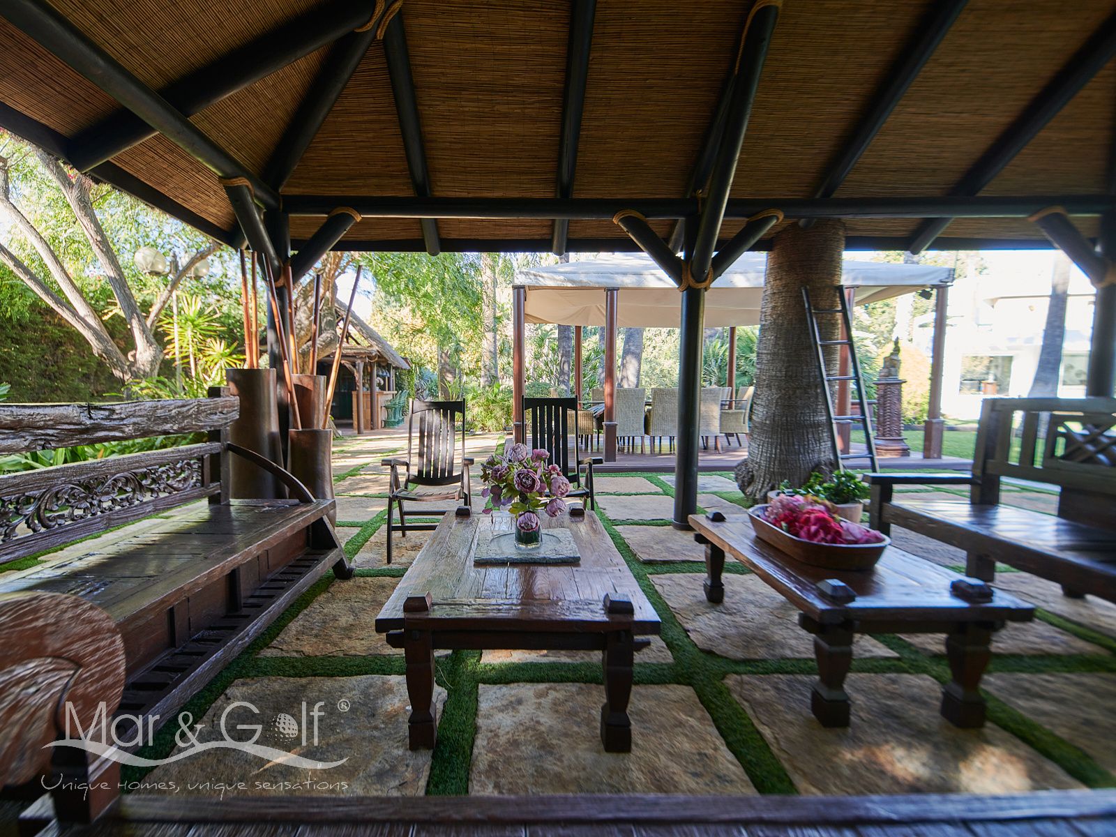 La zona exterior es paraíso privado dentro de la ciudad. La villa se extiende sobre más de 5.000 m² de escenario natural excepcional con árboles frutales y pinada privada, dos lagos artificiales, piscina exterior, cocina exterior techada, baño completo en la zona de piscina, parking exterior con punto de carga eléctrica y dos ambientes chill-out de inspiración balinesa, perfectos para comer, relajarse o disfrutar de veladas inolvidables.