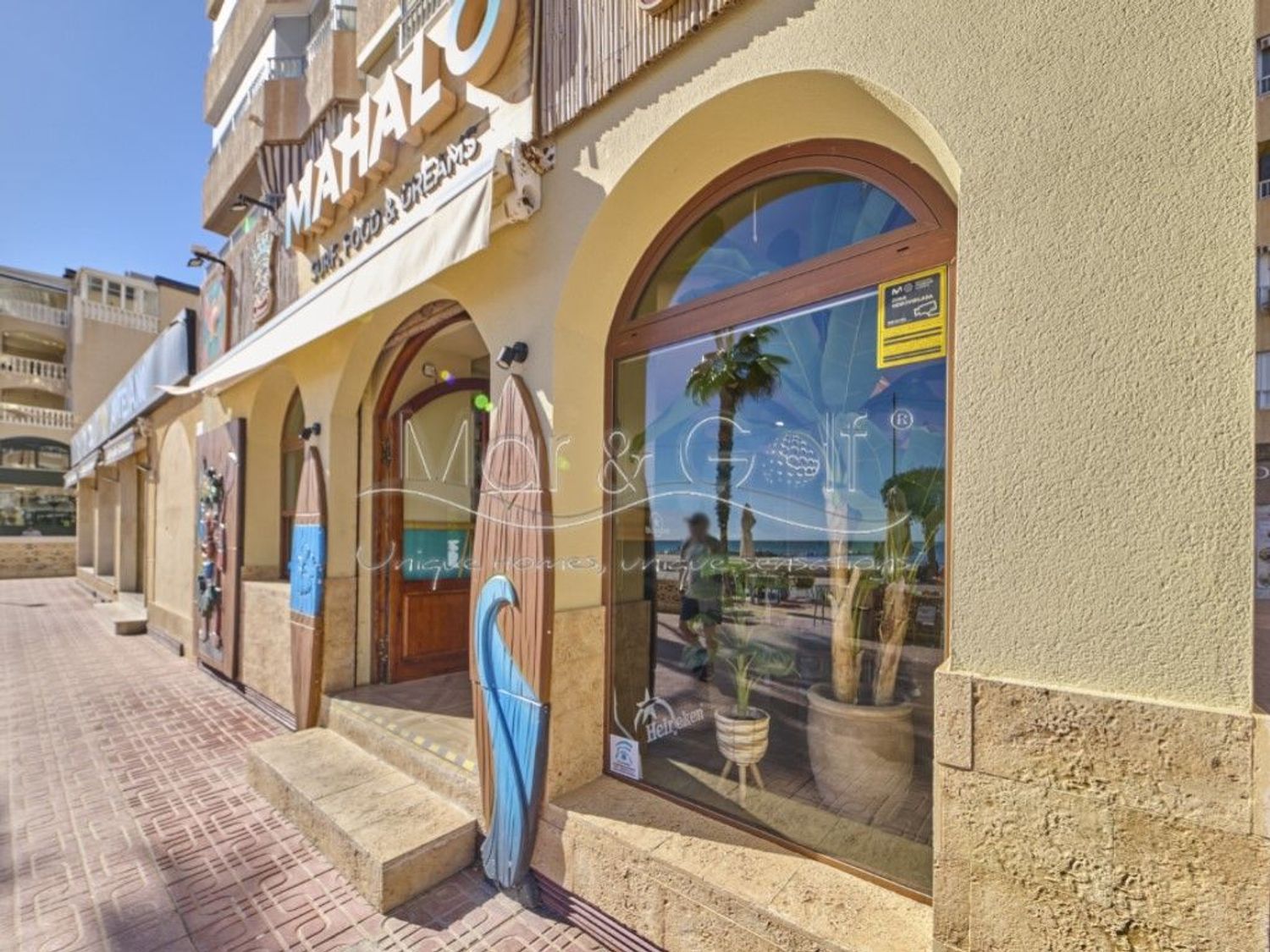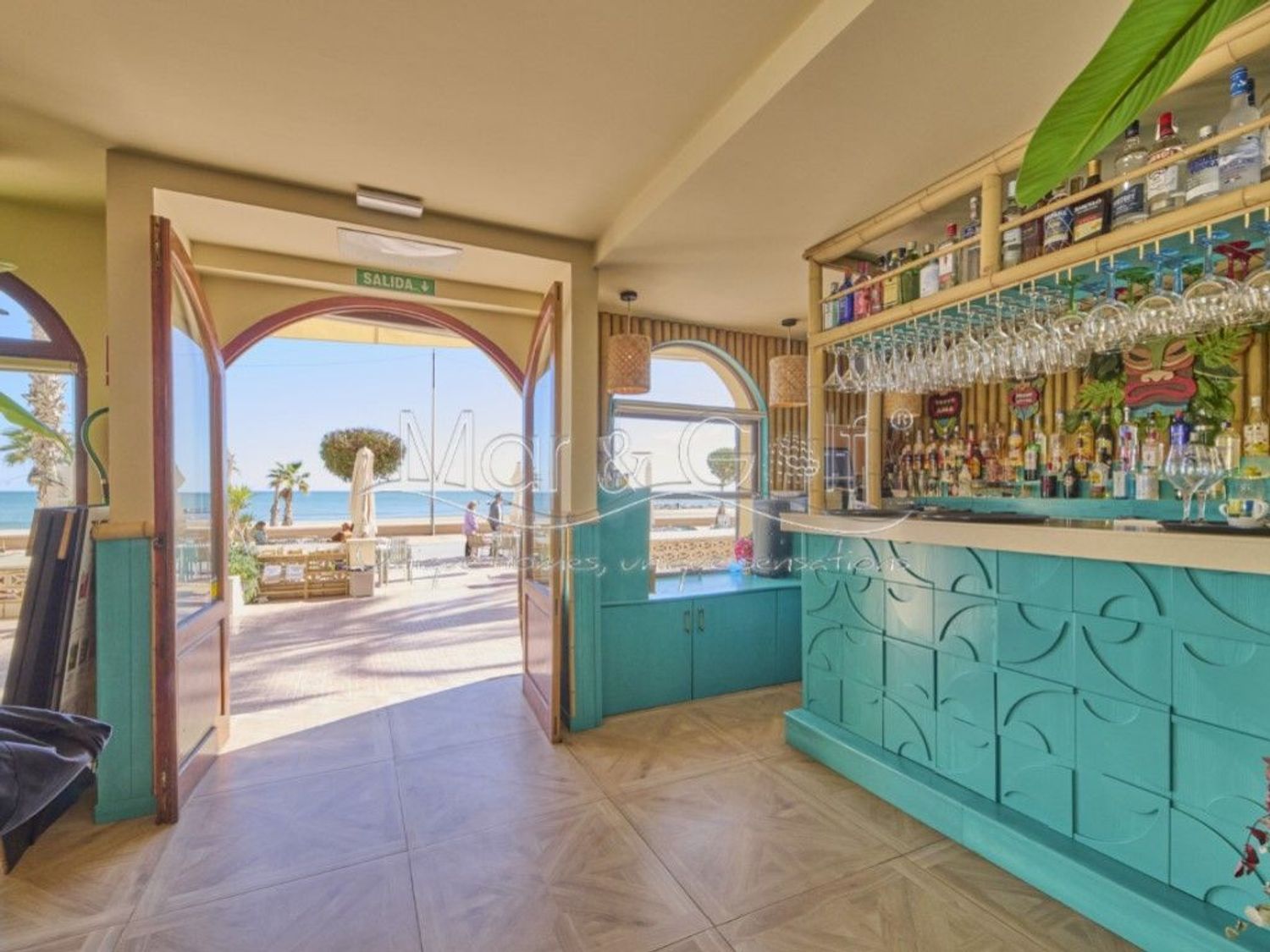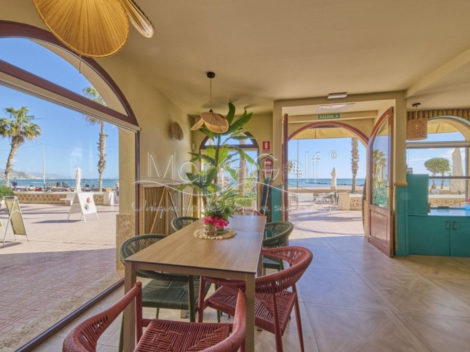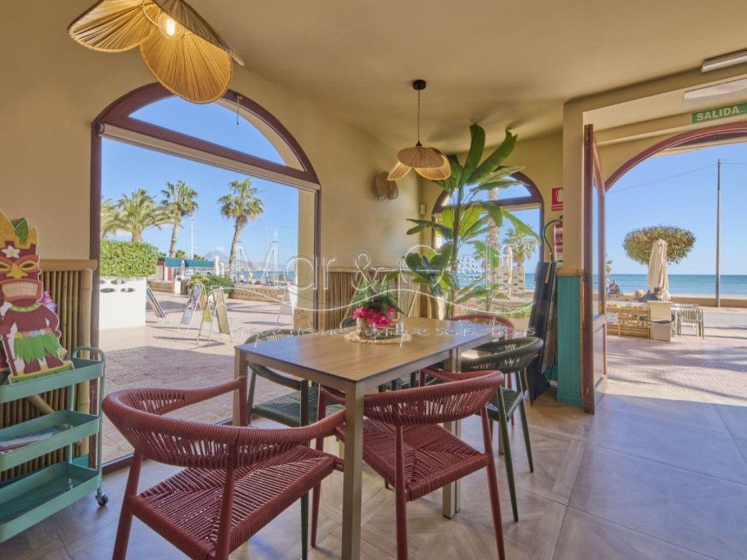 Cuenta con un amplio salón interior de 120 m² y una espectacular terraza de 115 m² con vistas directas al mar, uno de los mayores atractivos del negocio.