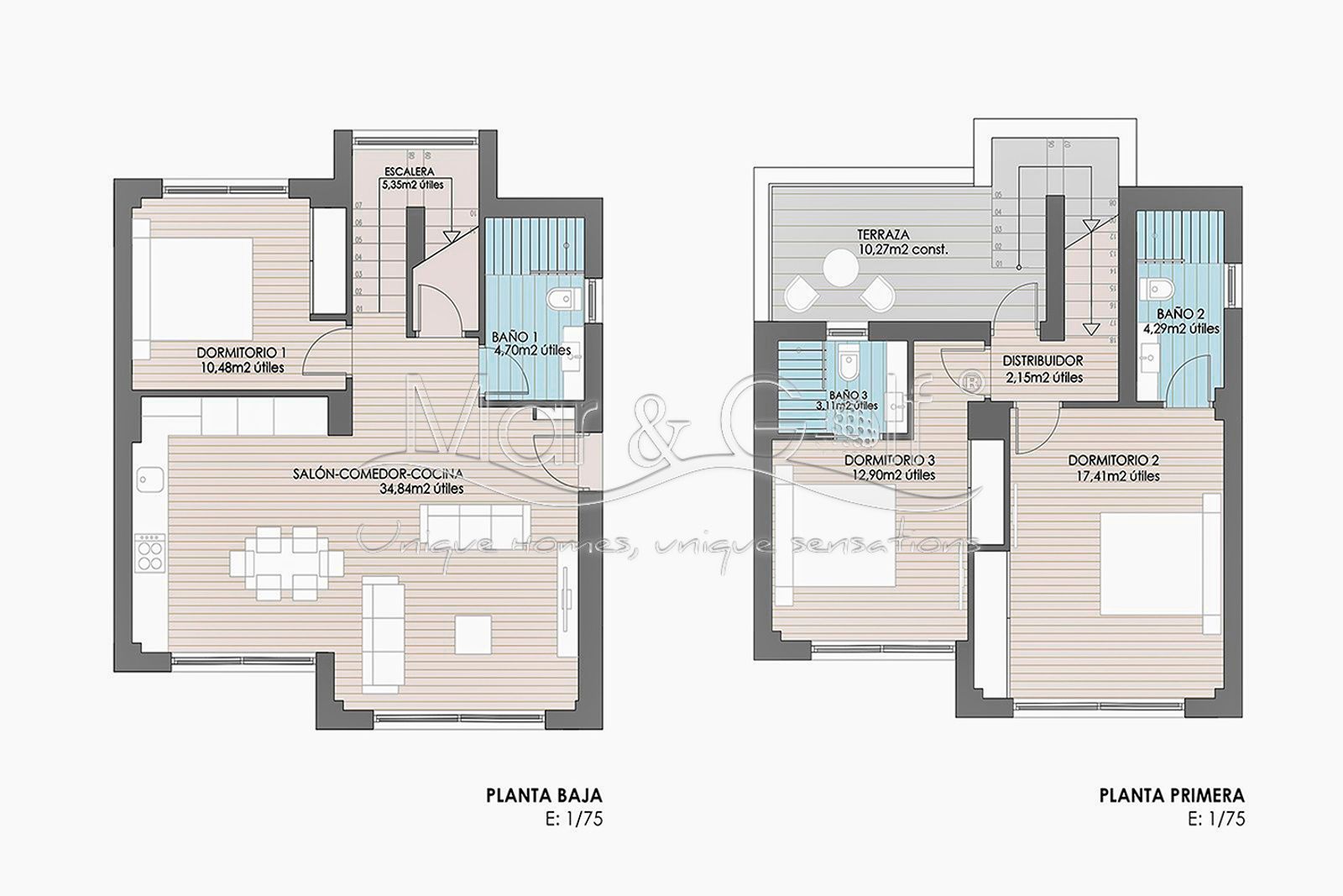 Las viviendas están distribuidas en dos plantas más solárium. A la parcela de la vivienda se accede a través de una puerta mecanizada y cuenta con una zona de aparcamiento exterior. Además, toda la vivienda está rodeada de suelo ajardinado al que acompaña una gran piscina con ducha exterior. En el interior encontramos un amplio salón-comedor con la cocina abierta y con dos accesos al jardín. También un dormitorio y un baño completo. En la primera planta se encuentran dos dormitorios más en suite y con una terraza. En la planta superior se encuentra el solárium.