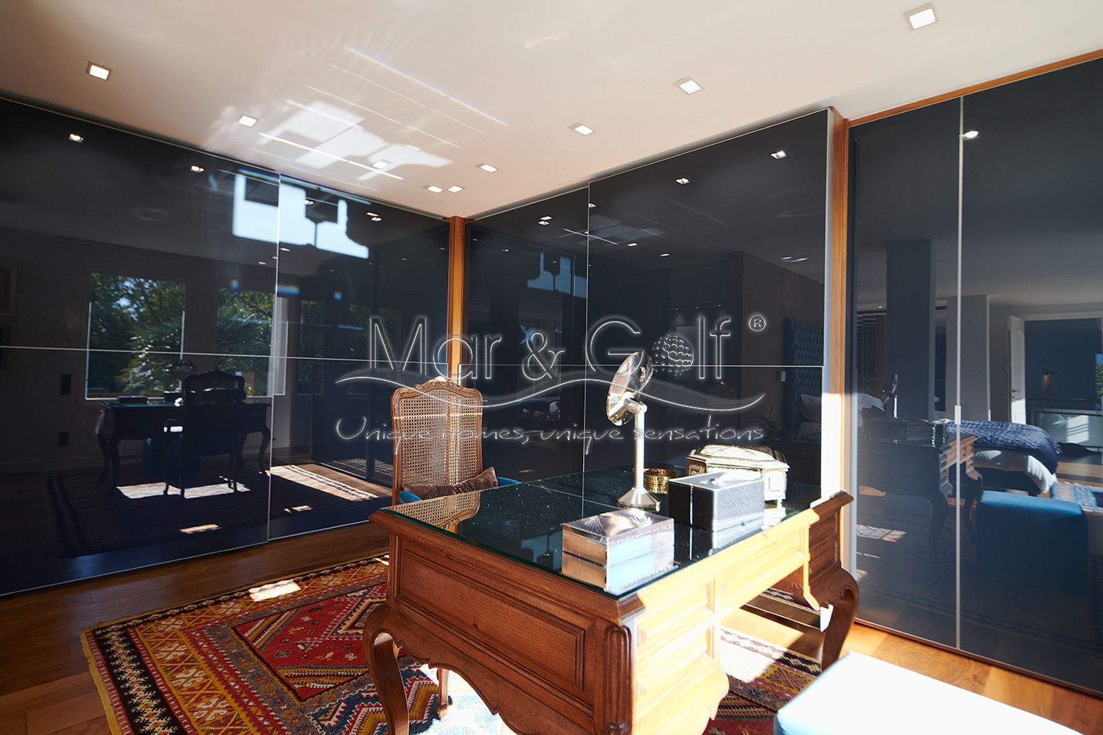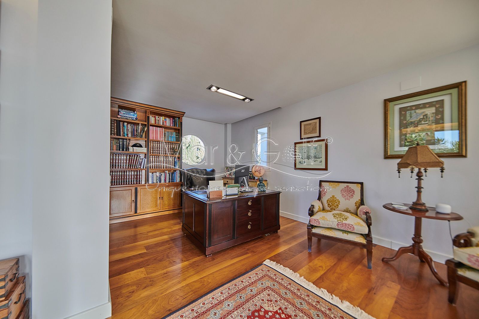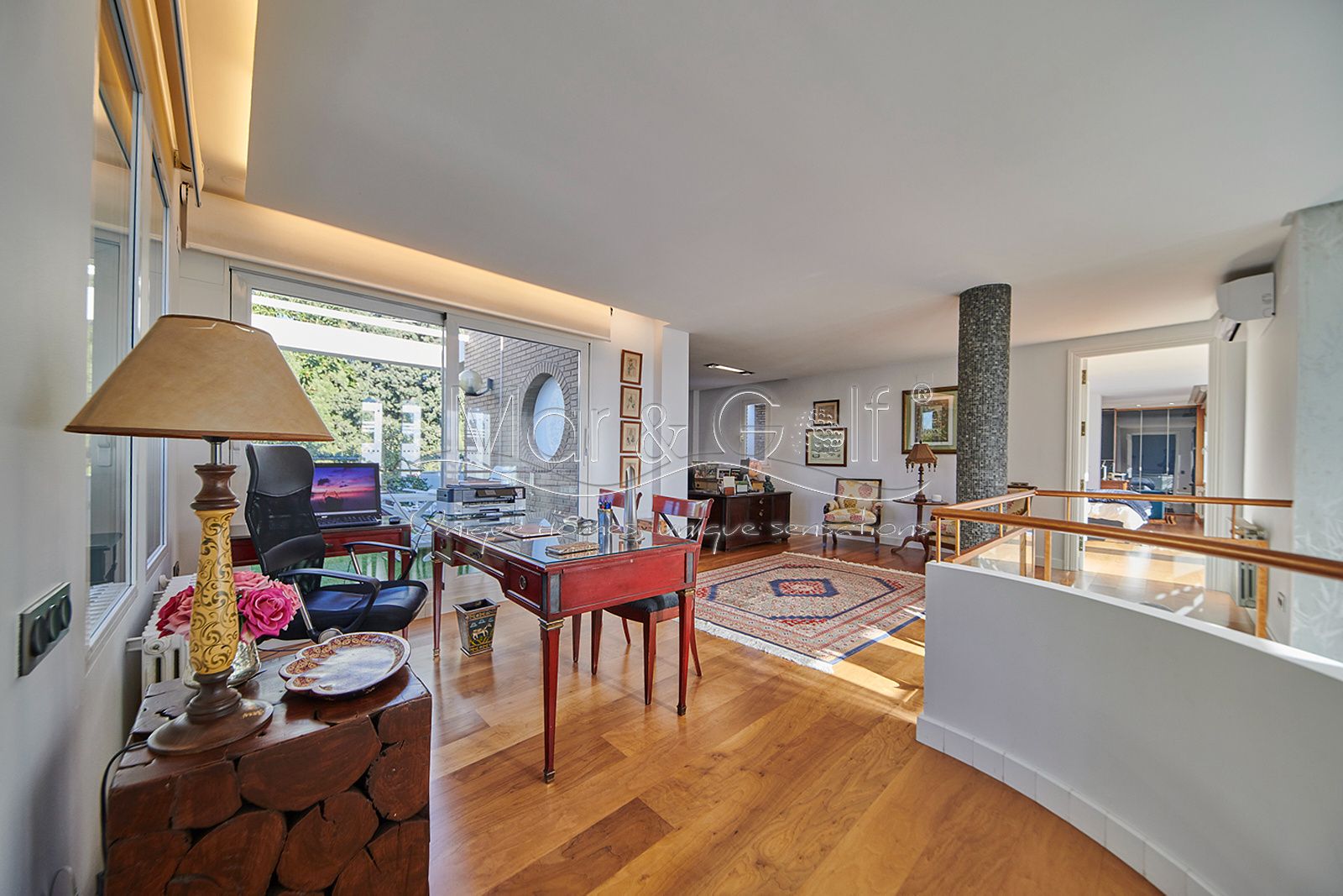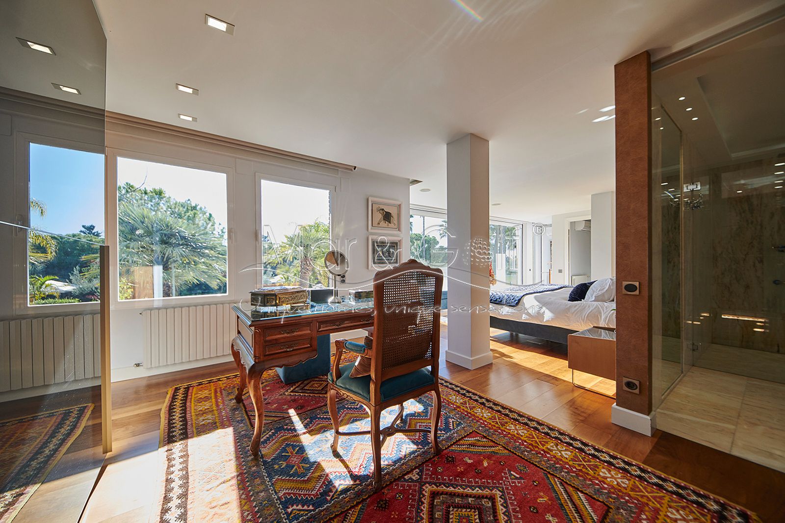 La primera planta es un refugio privado ya que consta de un gran despacho que conecta directamente con la majestuosa suite principal. Este espacio íntimo incorpora un baño con bañera y ducha, vestidor, dos splits frío/calor y dos encantadoras terrazas descubiertas para disfrutar del amanecer o del silencio del atardecer.