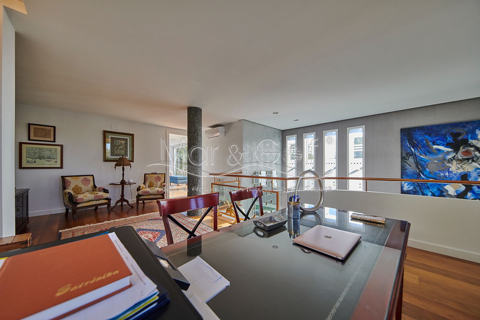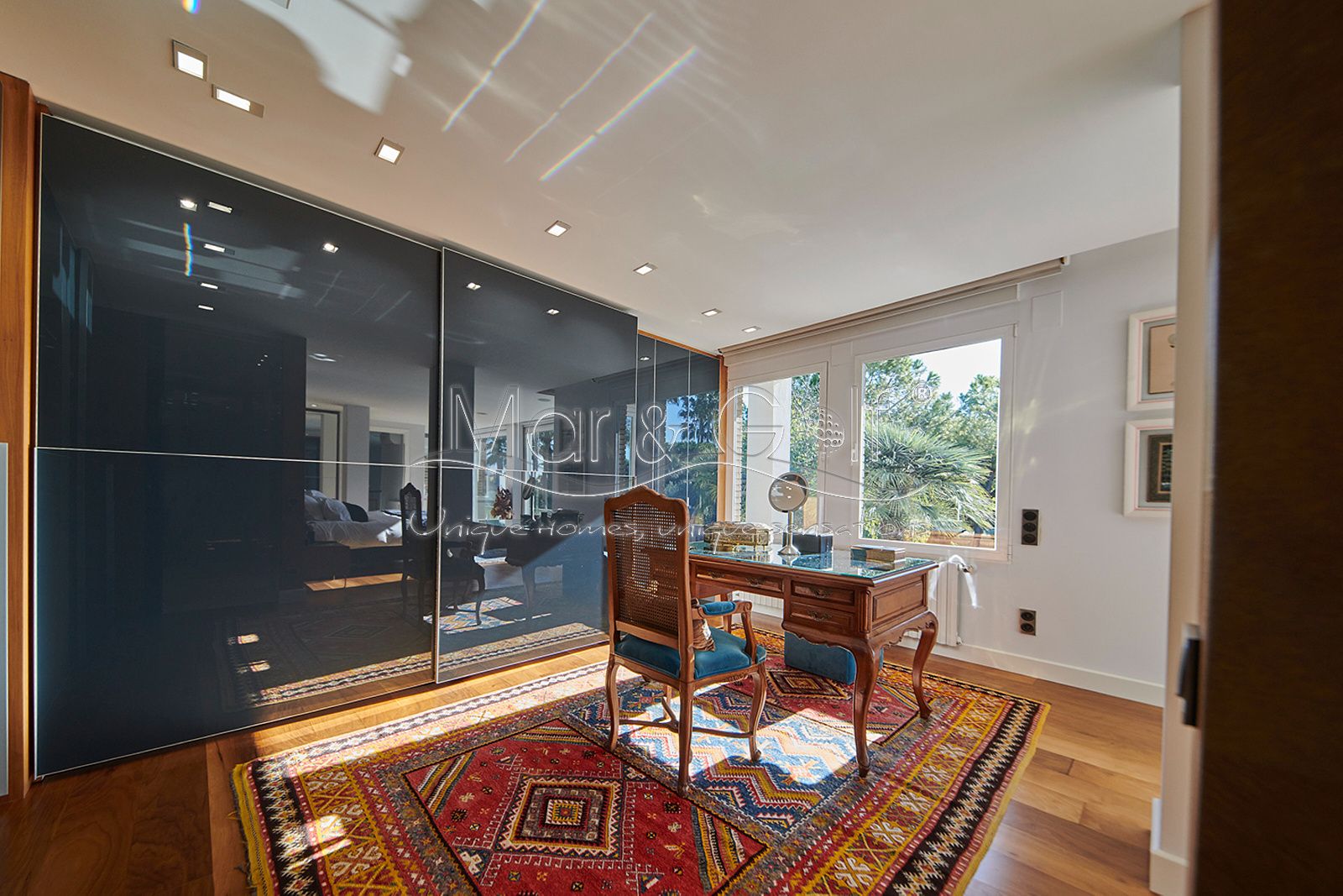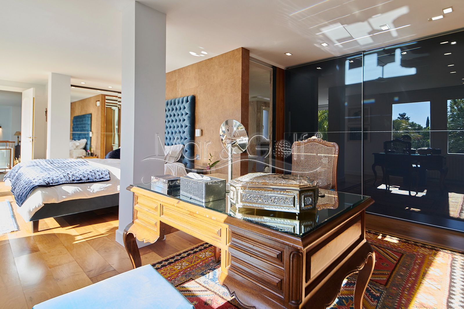 La primera planta es un refugio privado ya que consta de un gran despacho que conecta directamente con la majestuosa suite principal. Este espacio íntimo incorpora un baño con bañera y ducha, vestidor, dos splits frío/calor y dos encantadoras terrazas descubiertas para disfrutar del amanecer o del silencio del atardecer.