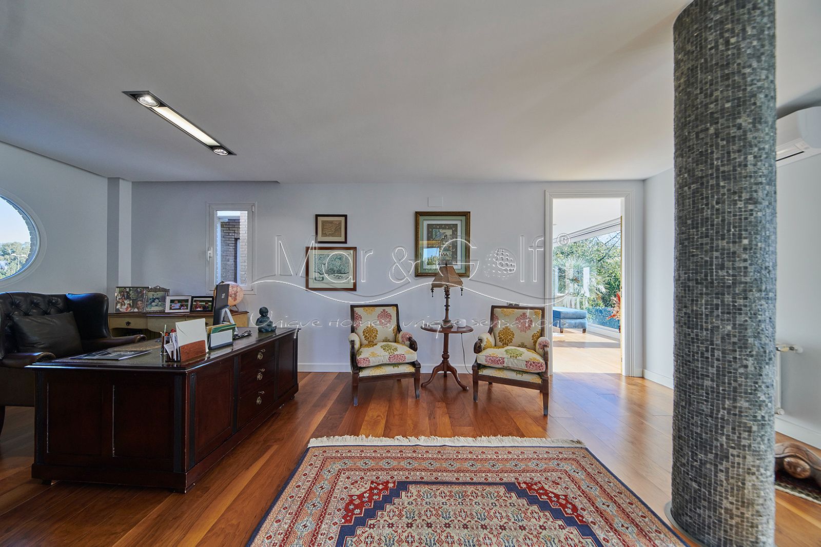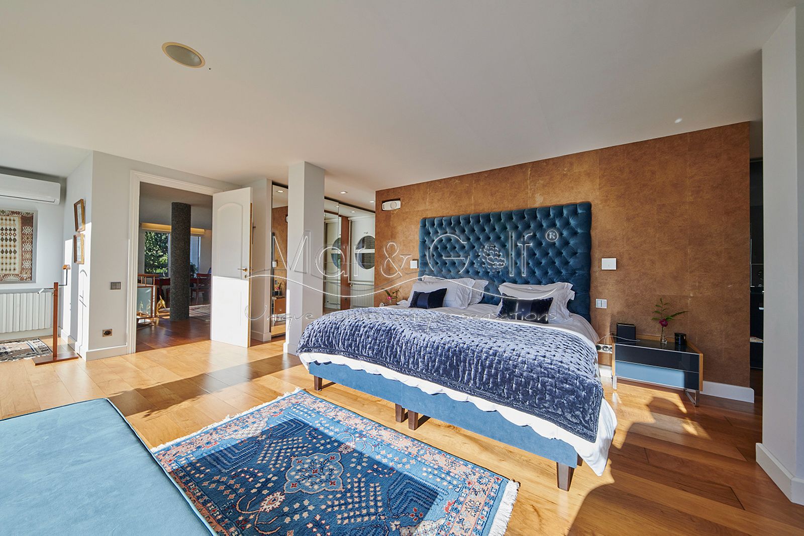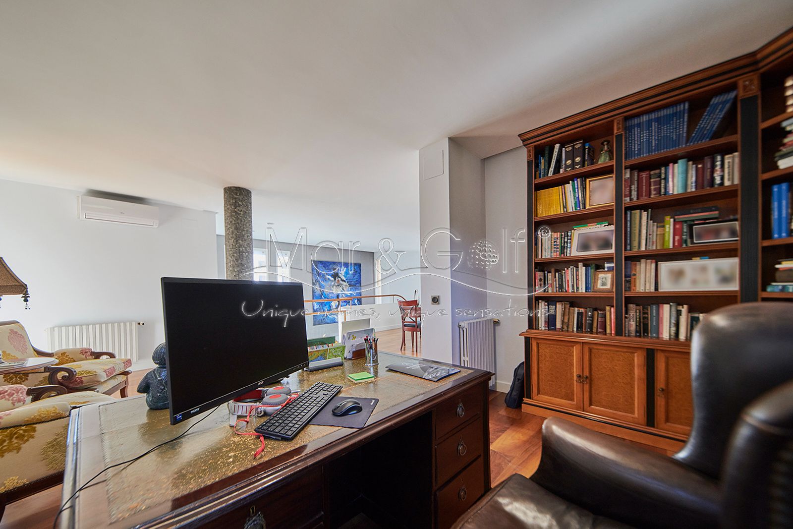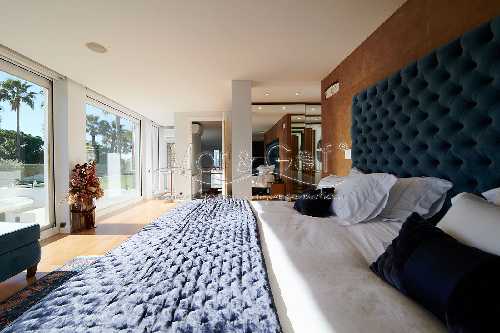 La primera planta es un refugio privado ya que consta de un gran despacho que conecta directamente con la majestuosa suite principal. Este espacio íntimo incorpora un baño con bañera y ducha, vestidor, dos splits frío/calor y dos encantadoras terrazas descubiertas para disfrutar del amanecer o del silencio del atardecer.