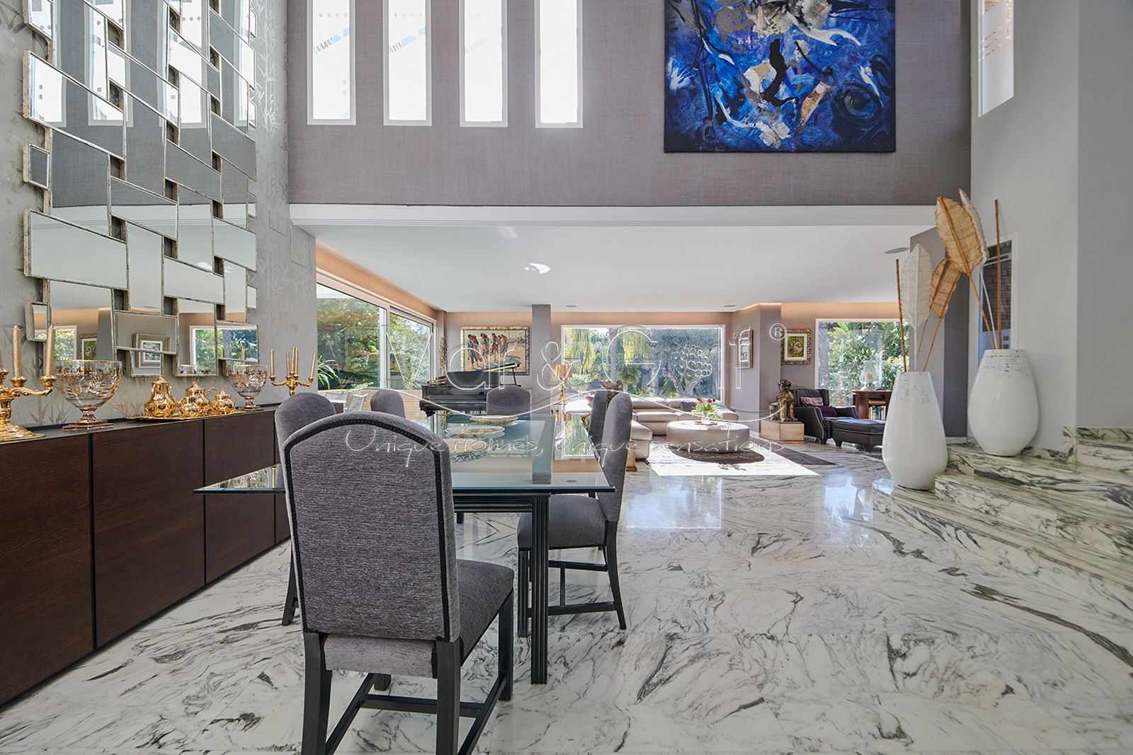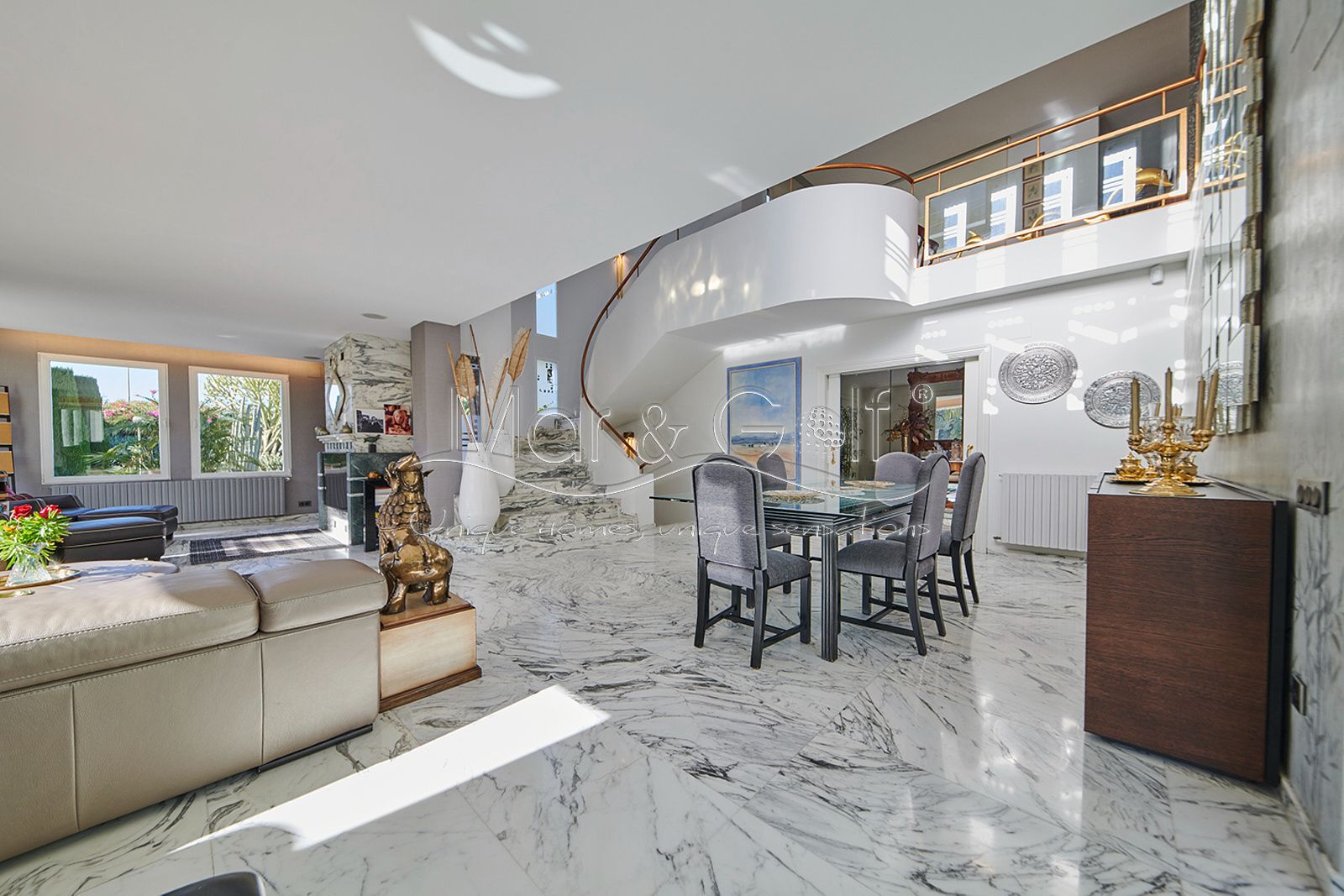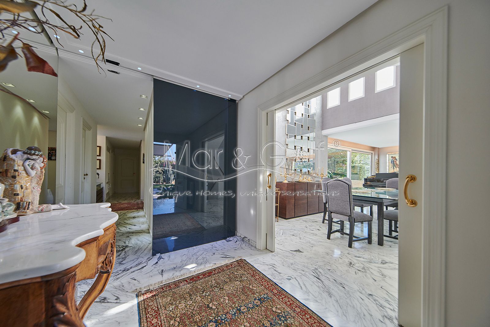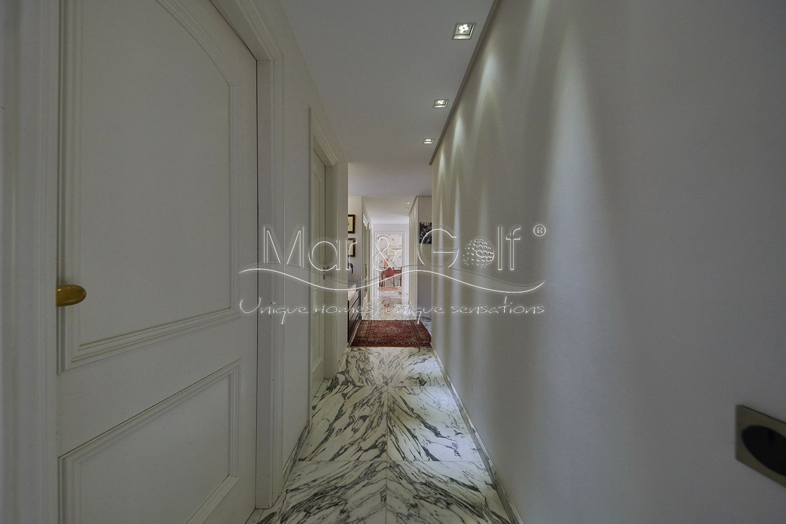 Toda la planta cuenta con un exquisito suelo de mármol arabescato, que suma sofisticación y elegancia a la estancia.