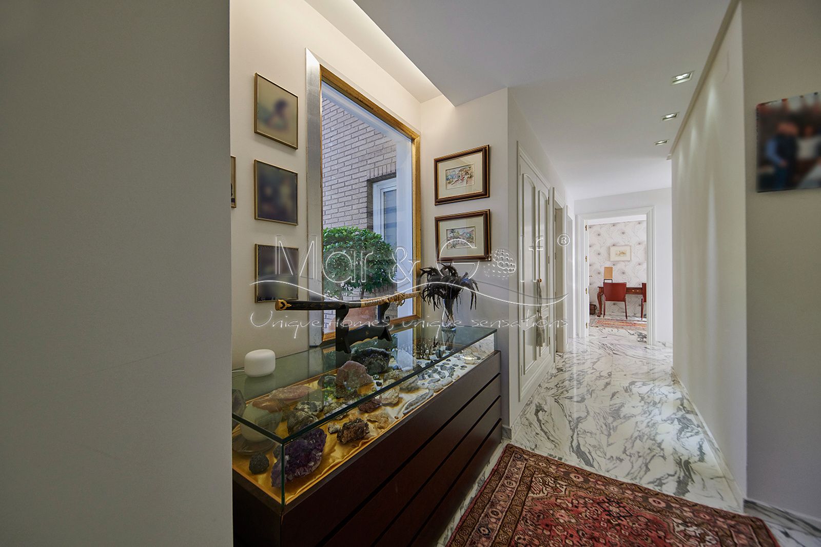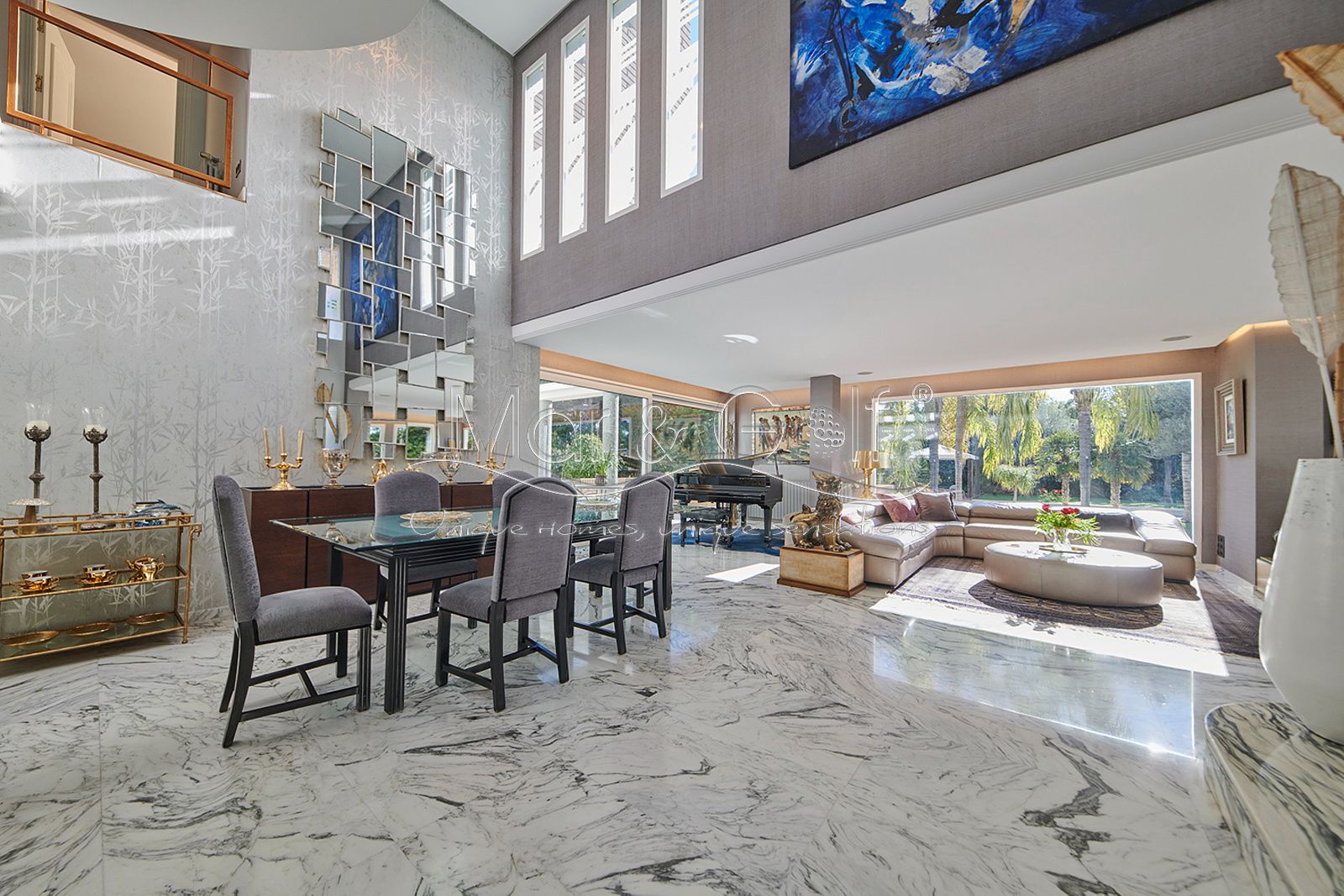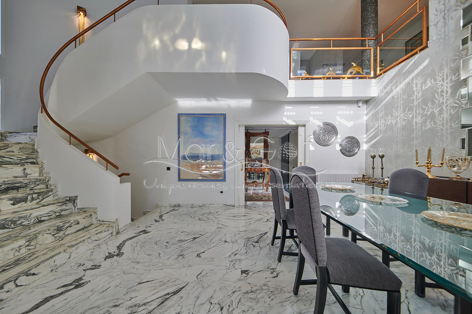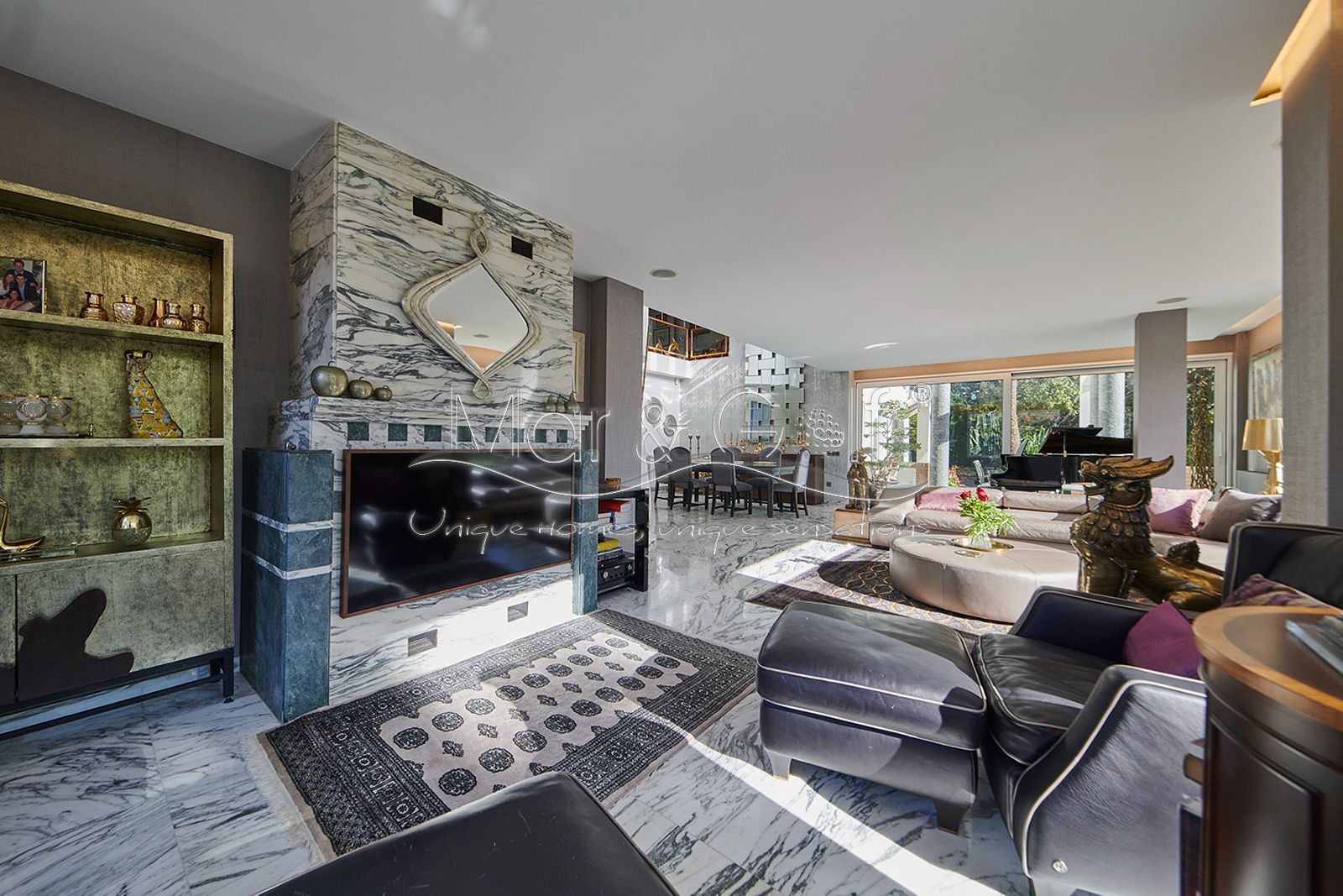Toda la planta cuenta con un exquisito suelo de mármol arabescato, que suma sofisticación y elegancia a la estancia.