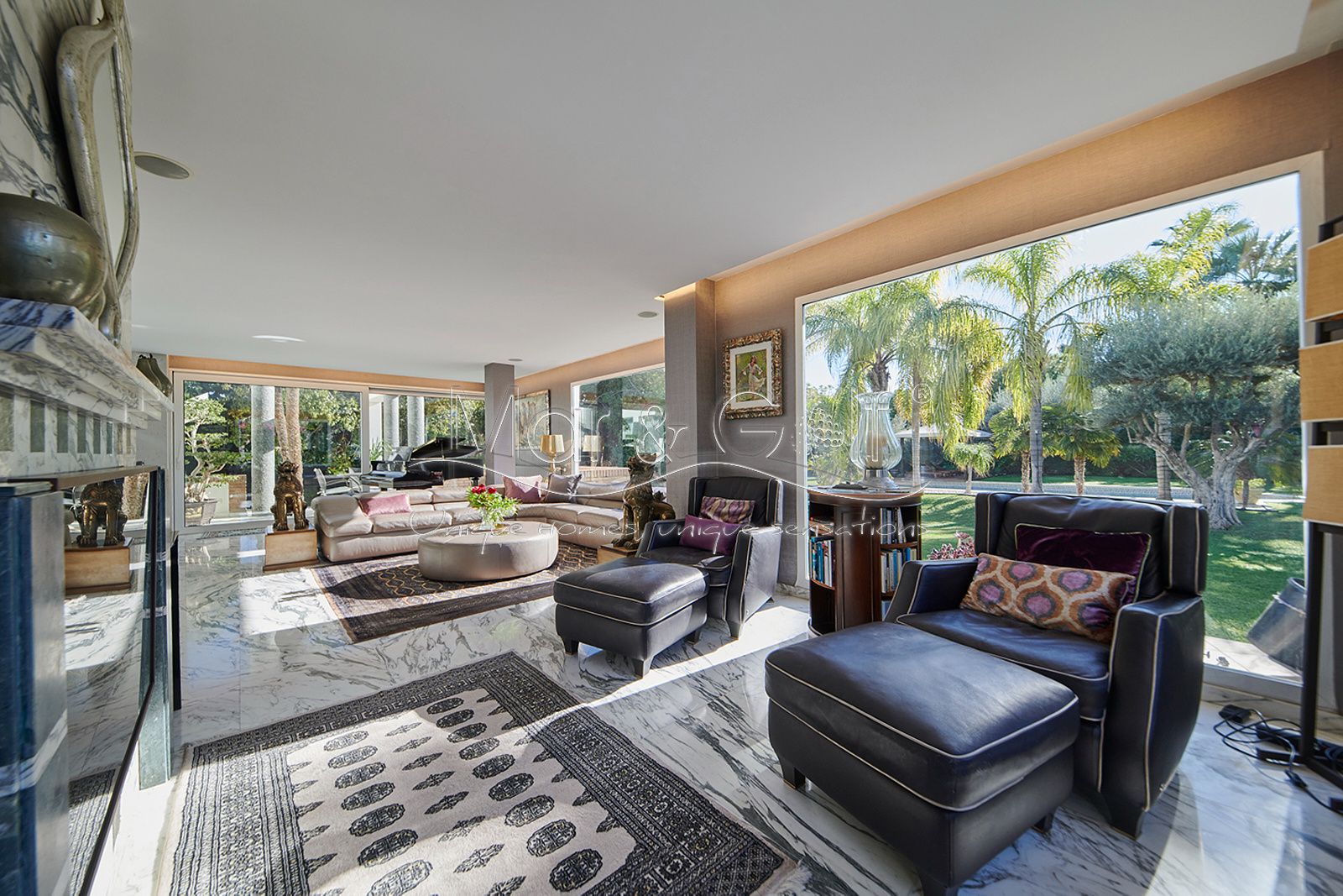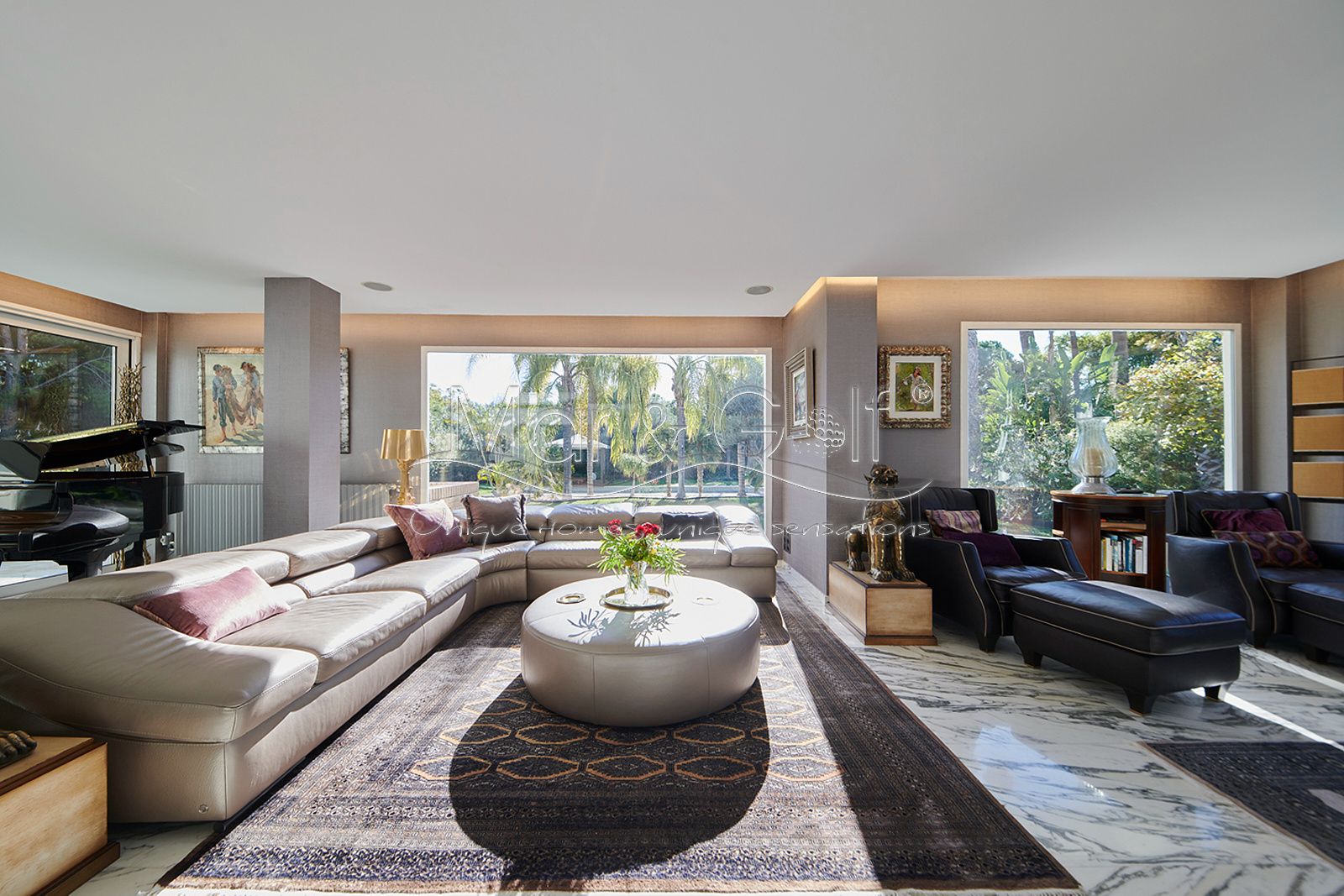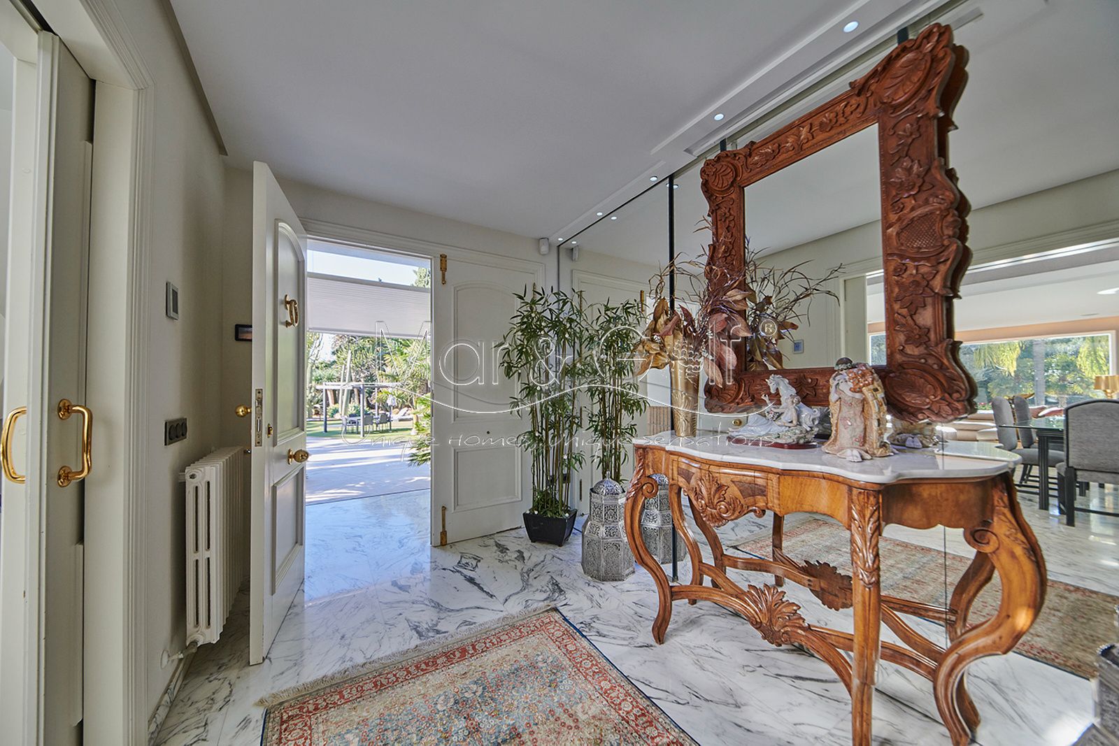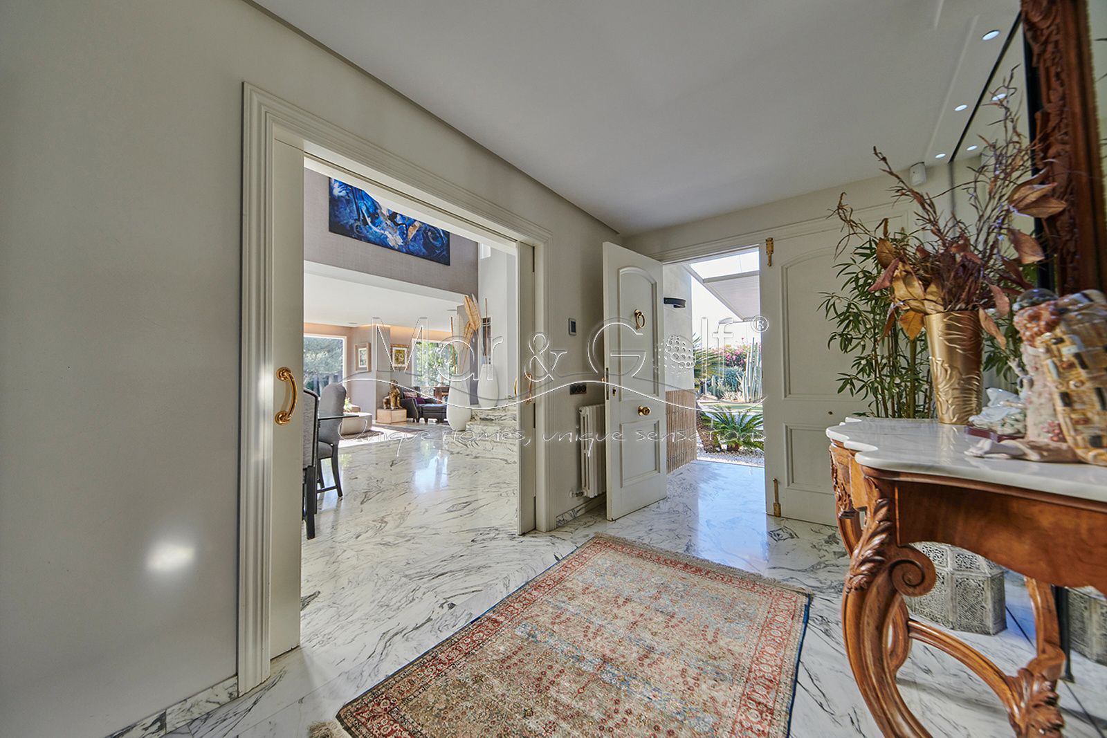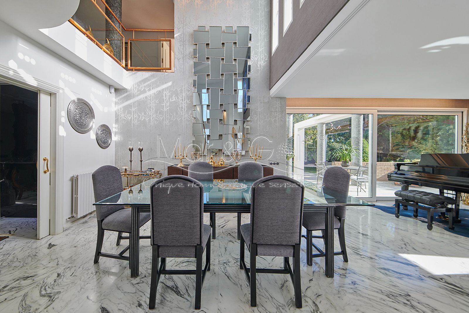 Toda la planta cuenta con un exquisito suelo de mármol arabescato, que suma sofisticación y elegancia a la estancia.