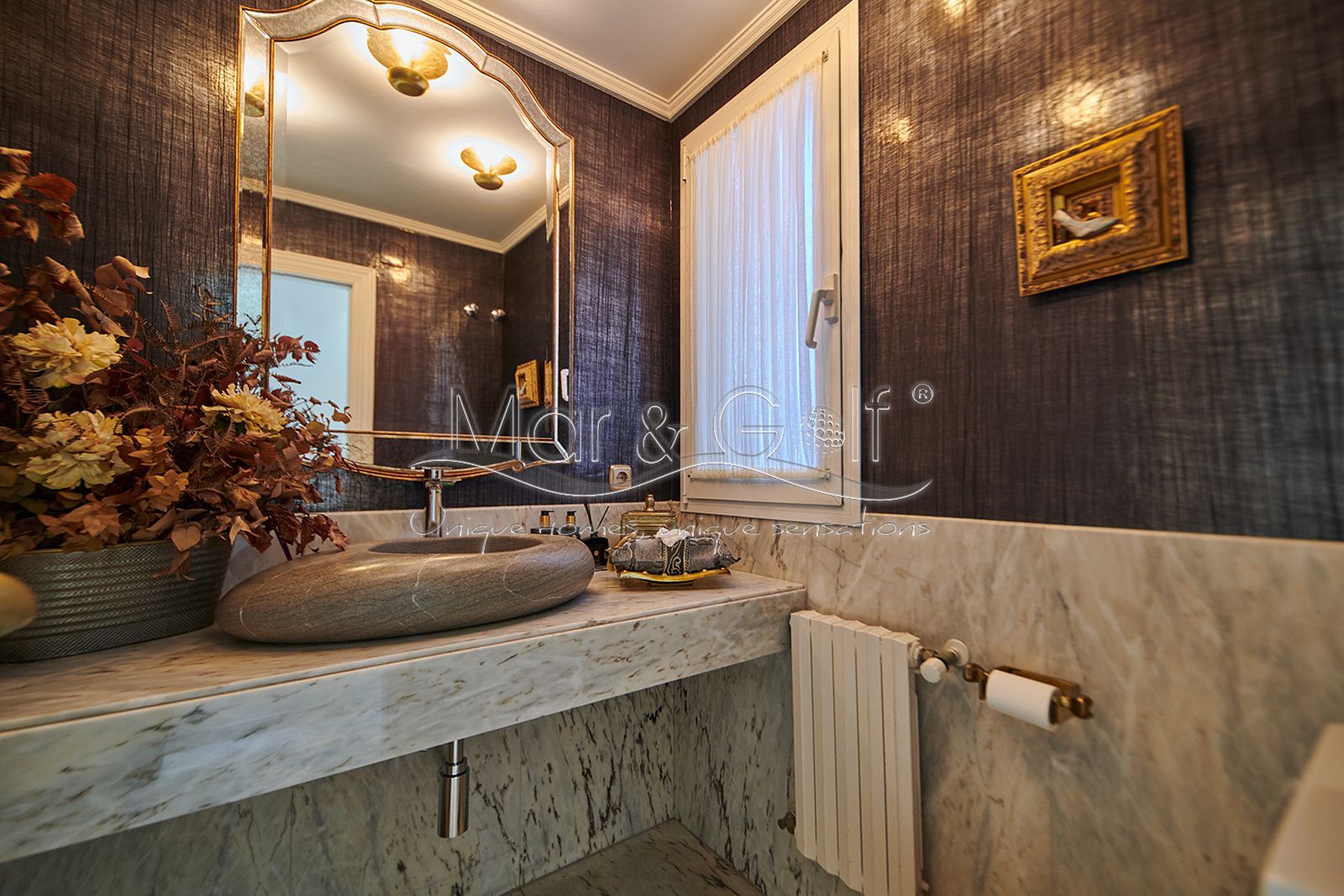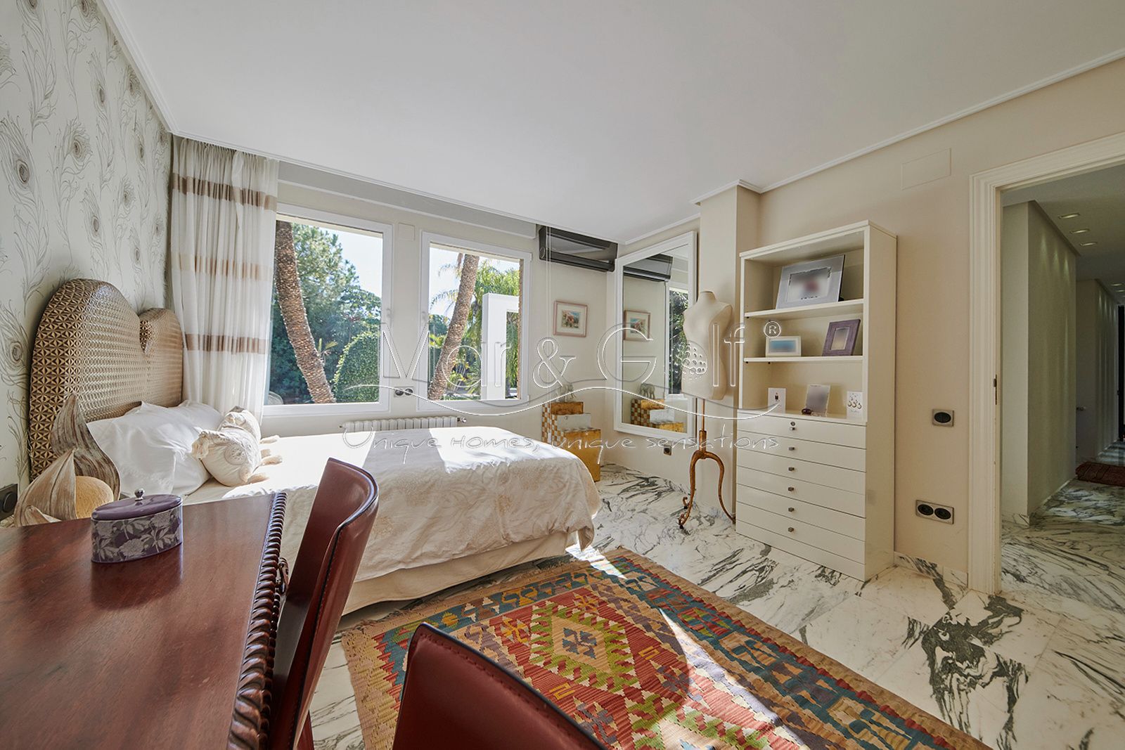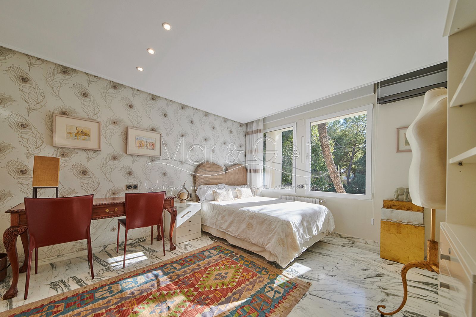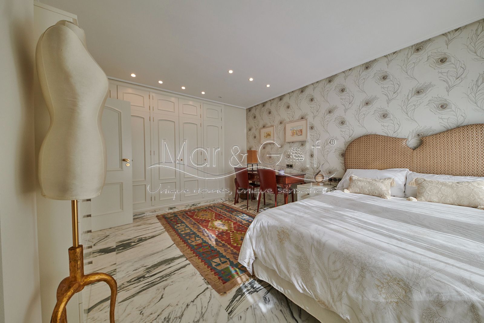 Toda la planta cuenta con un exquisito suelo de mármol arabescato, que suma sofisticación y elegancia a la estancia.