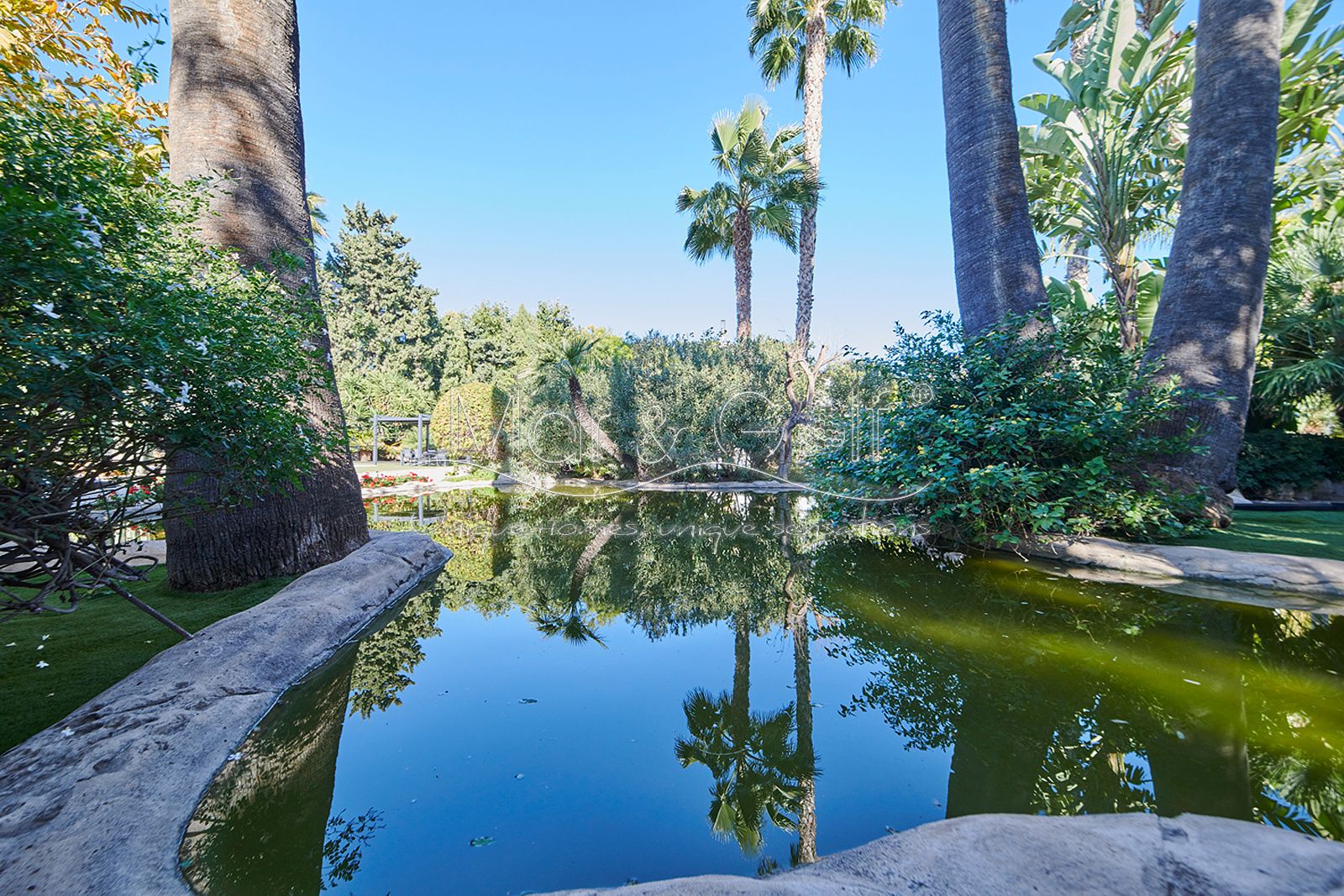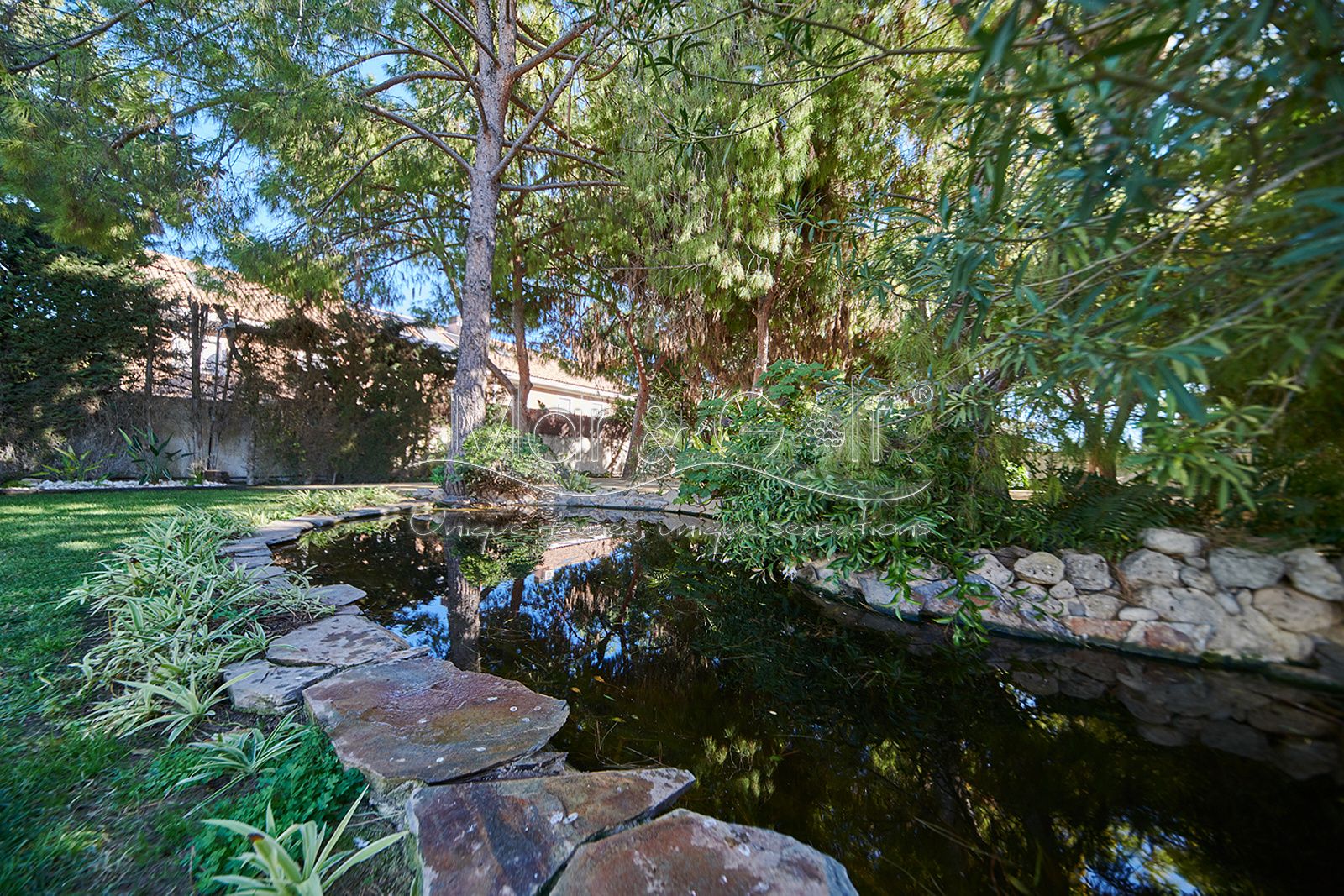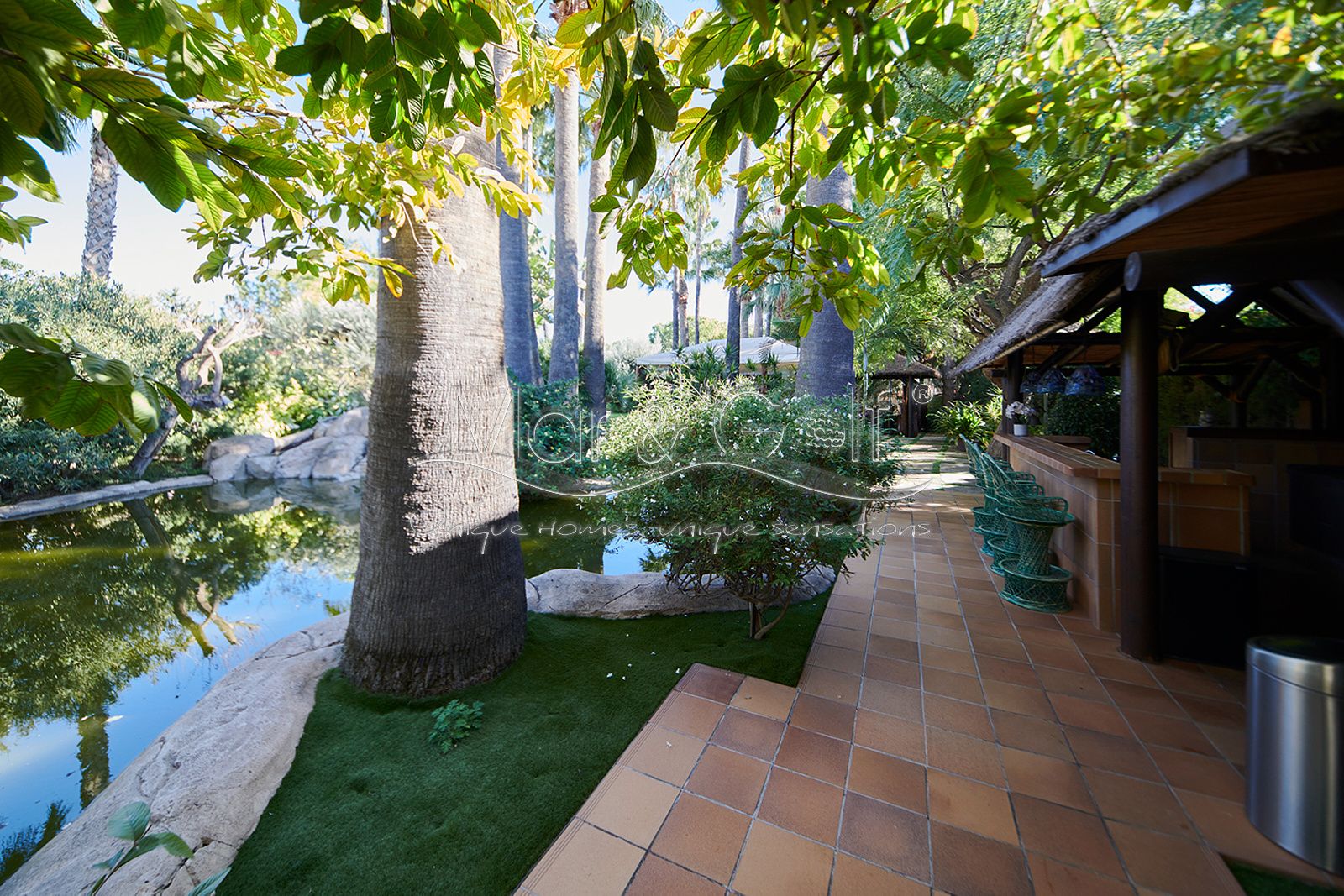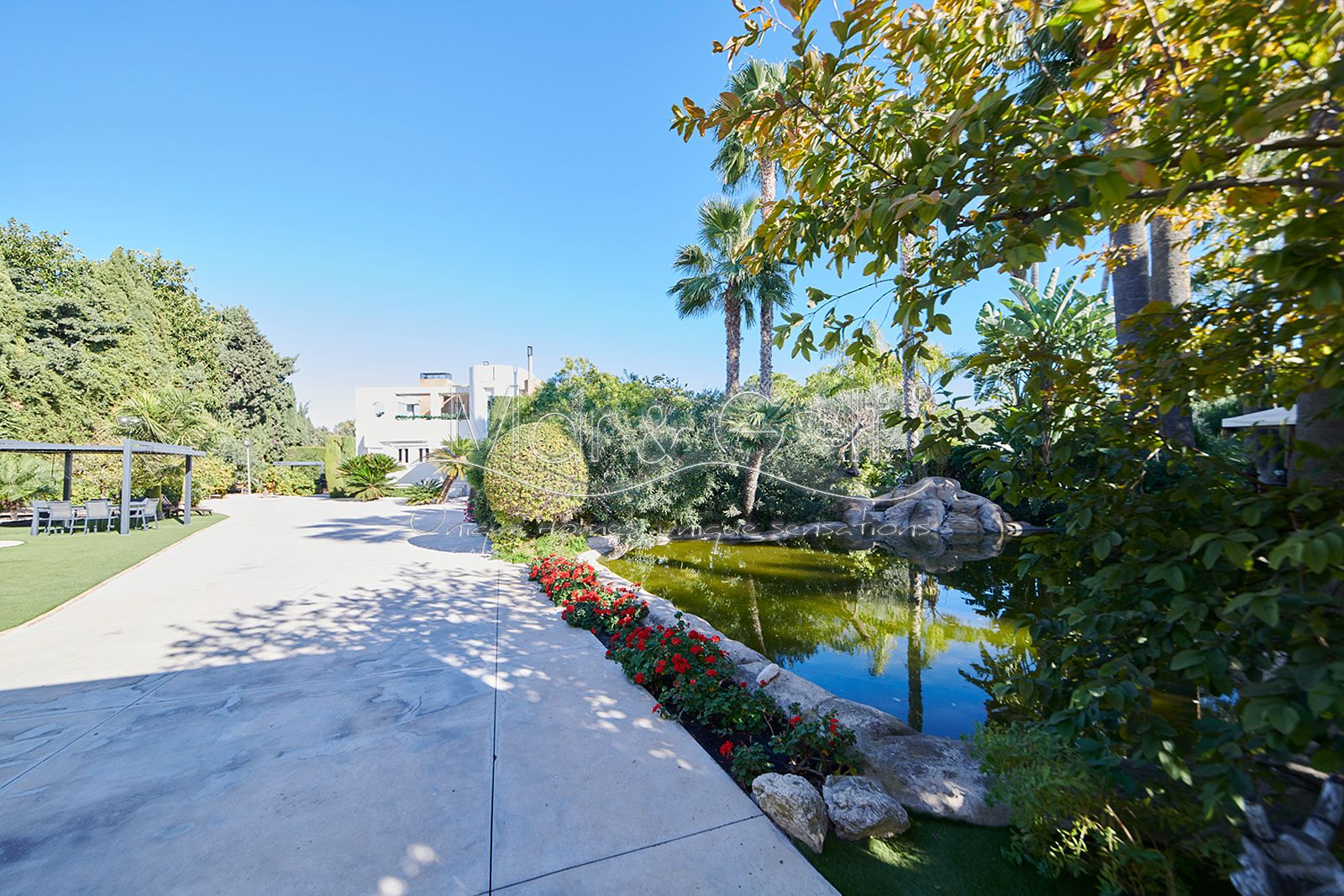 La zona exterior es paraíso privado dentro de la ciudad. La villa se extiende sobre más de 5.000 m² de escenario natural excepcional con árboles frutales y pinada privada, dos lagos artificiales, piscina exterior, cocina exterior techada, baño completo en la zona de piscina, parking exterior con punto de carga eléctrica y dos ambientes chill-out de inspiración balinesa, perfectos para comer, relajarse o disfrutar de veladas inolvidables.