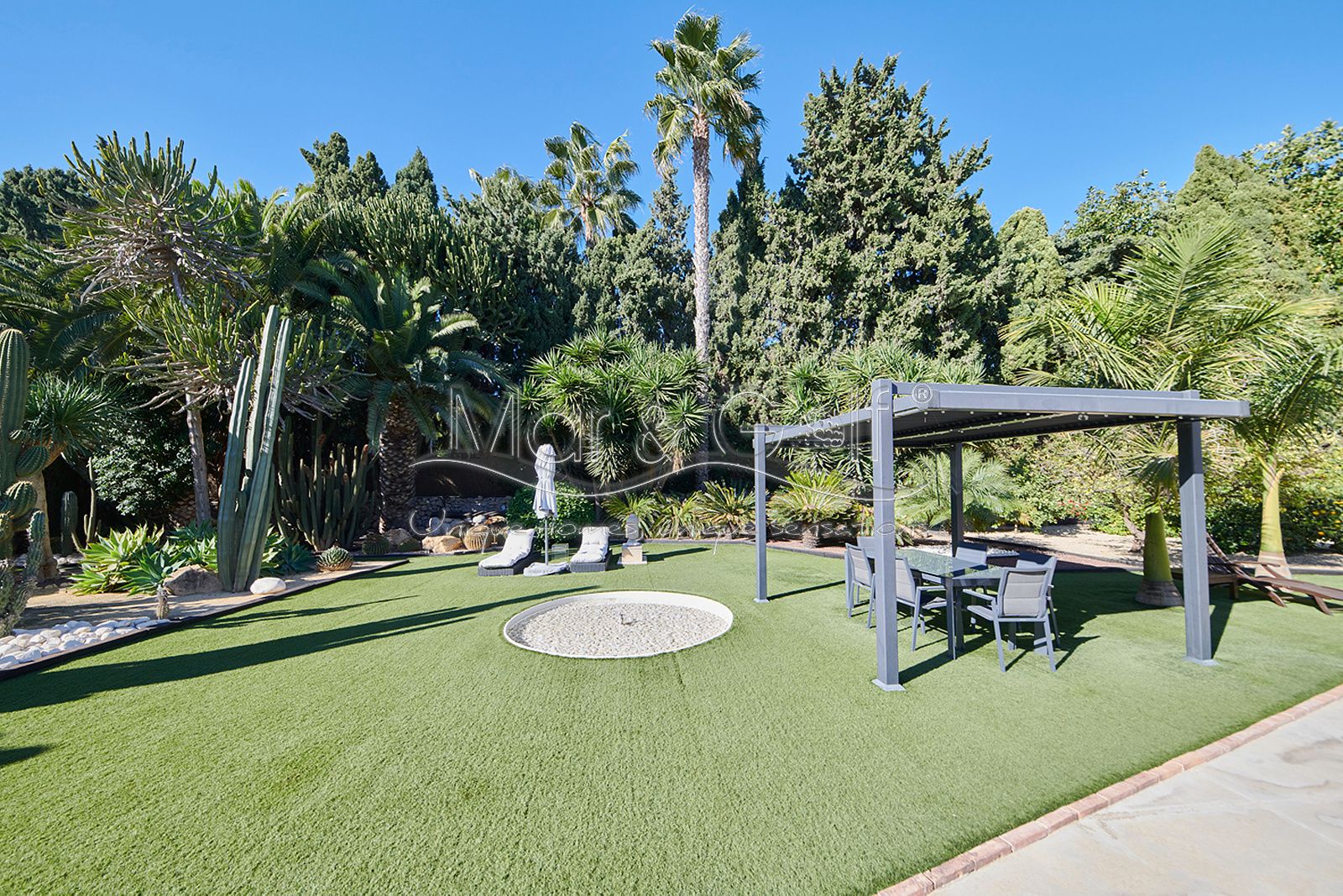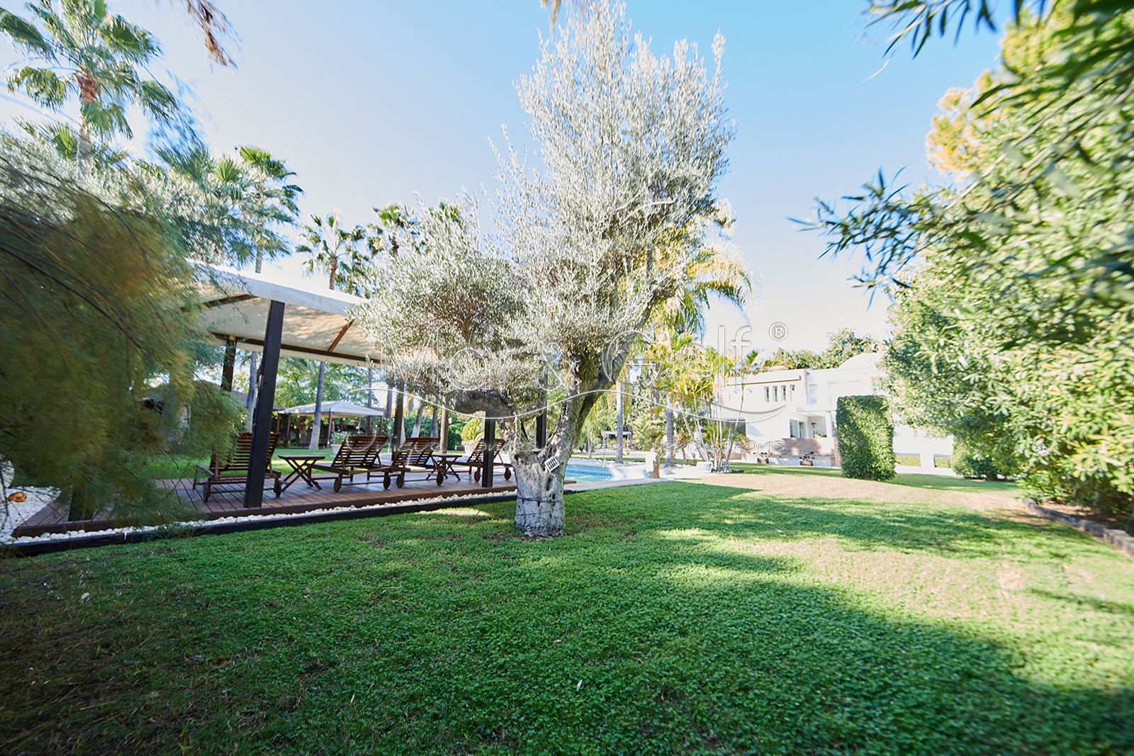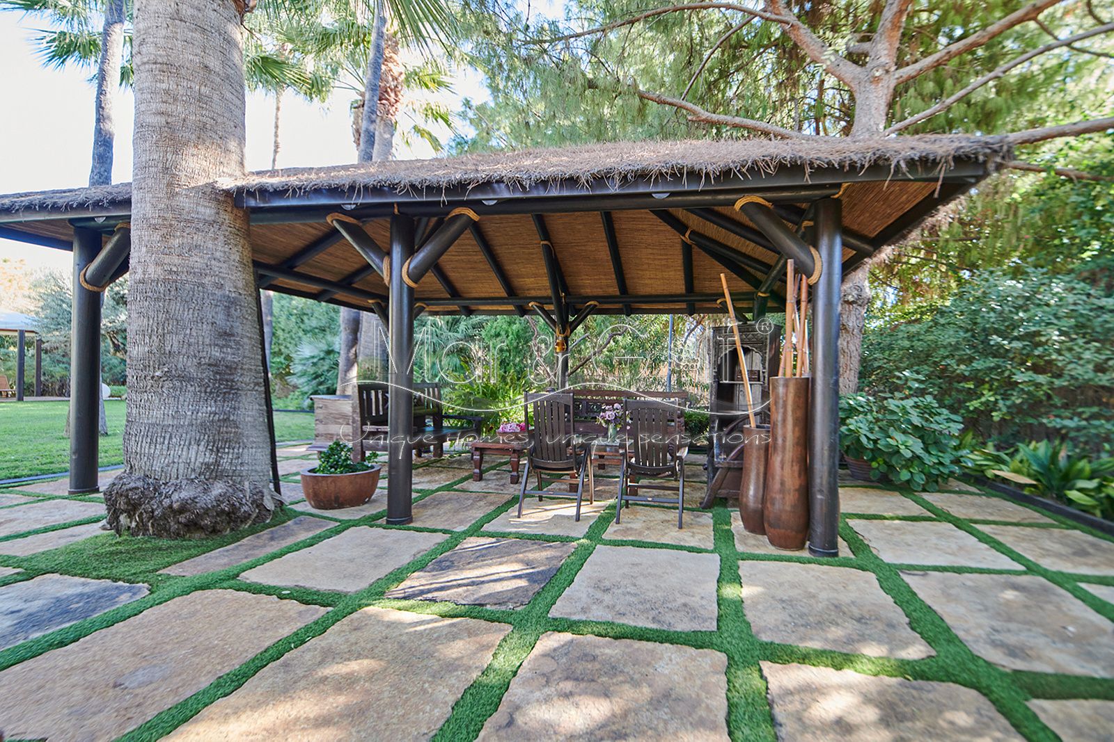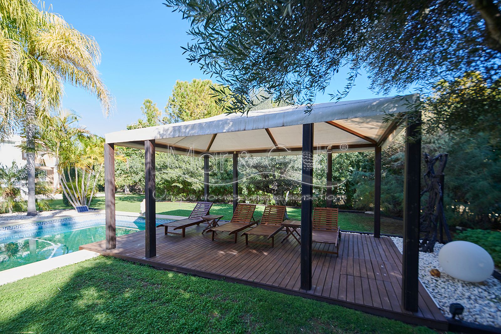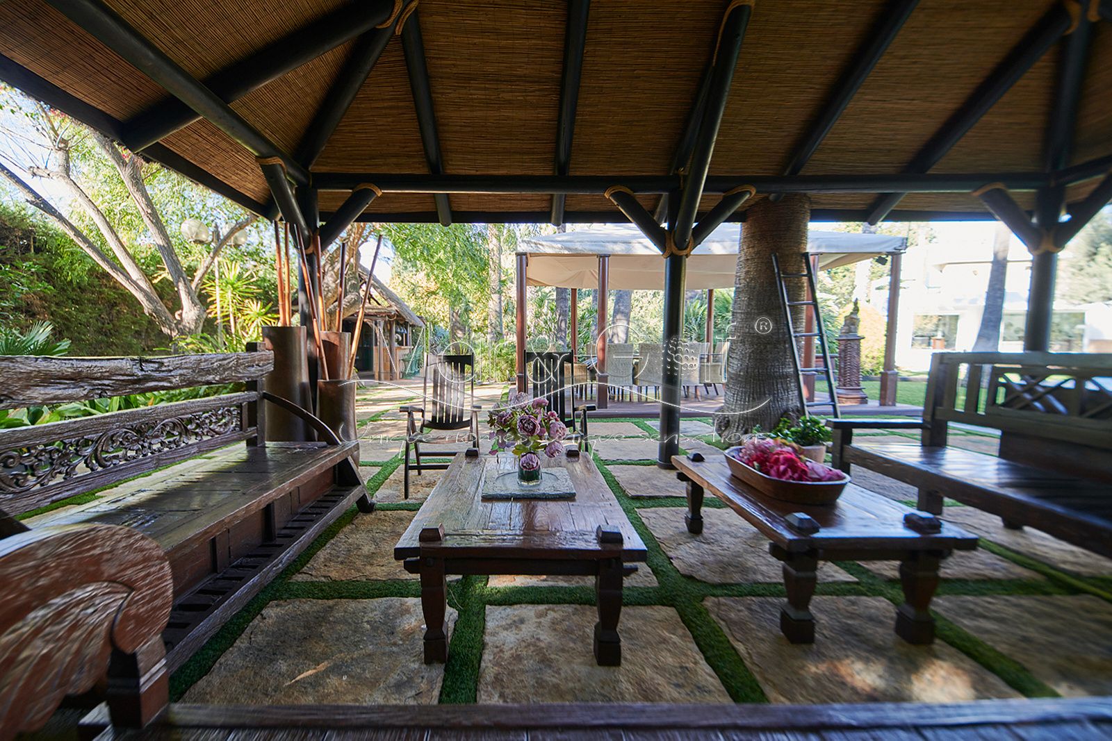 La zona exterior es paraíso privado dentro de la ciudad. La villa se extiende sobre más de 5.000 m² de escenario natural excepcional con árboles frutales y pinada privada, dos lagos artificiales, piscina exterior, cocina exterior techada, baño completo en la zona de piscina, parking exterior con punto de carga eléctrica y dos ambientes chill-out de inspiración balinesa, perfectos para comer, relajarse o disfrutar de veladas inolvidables.