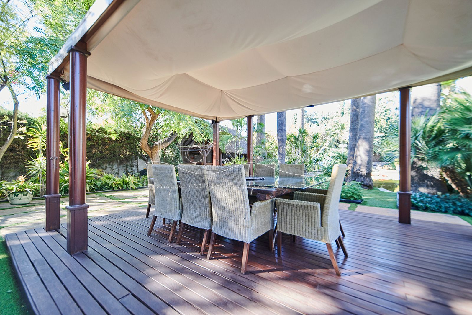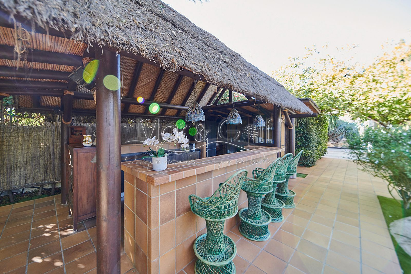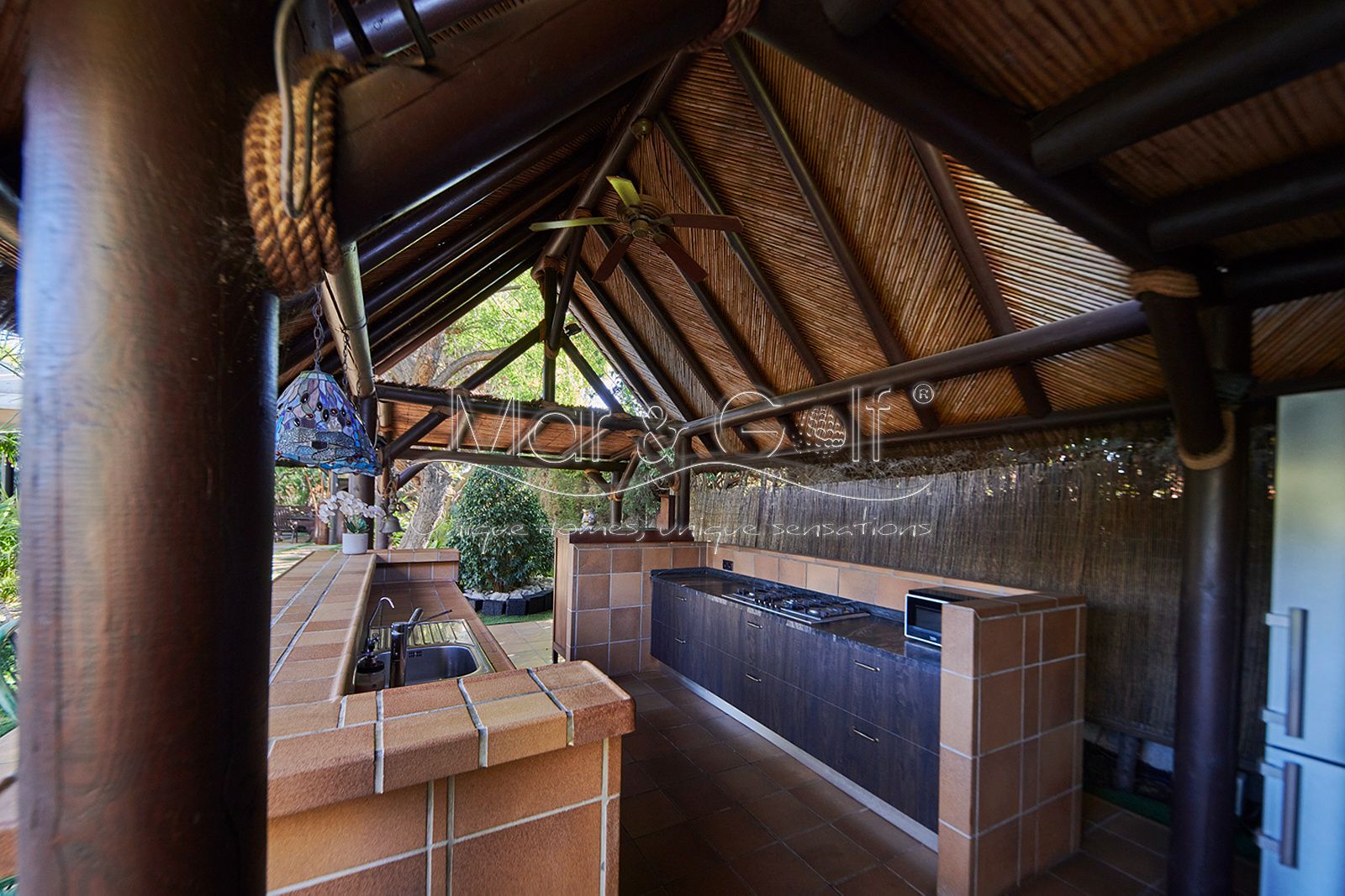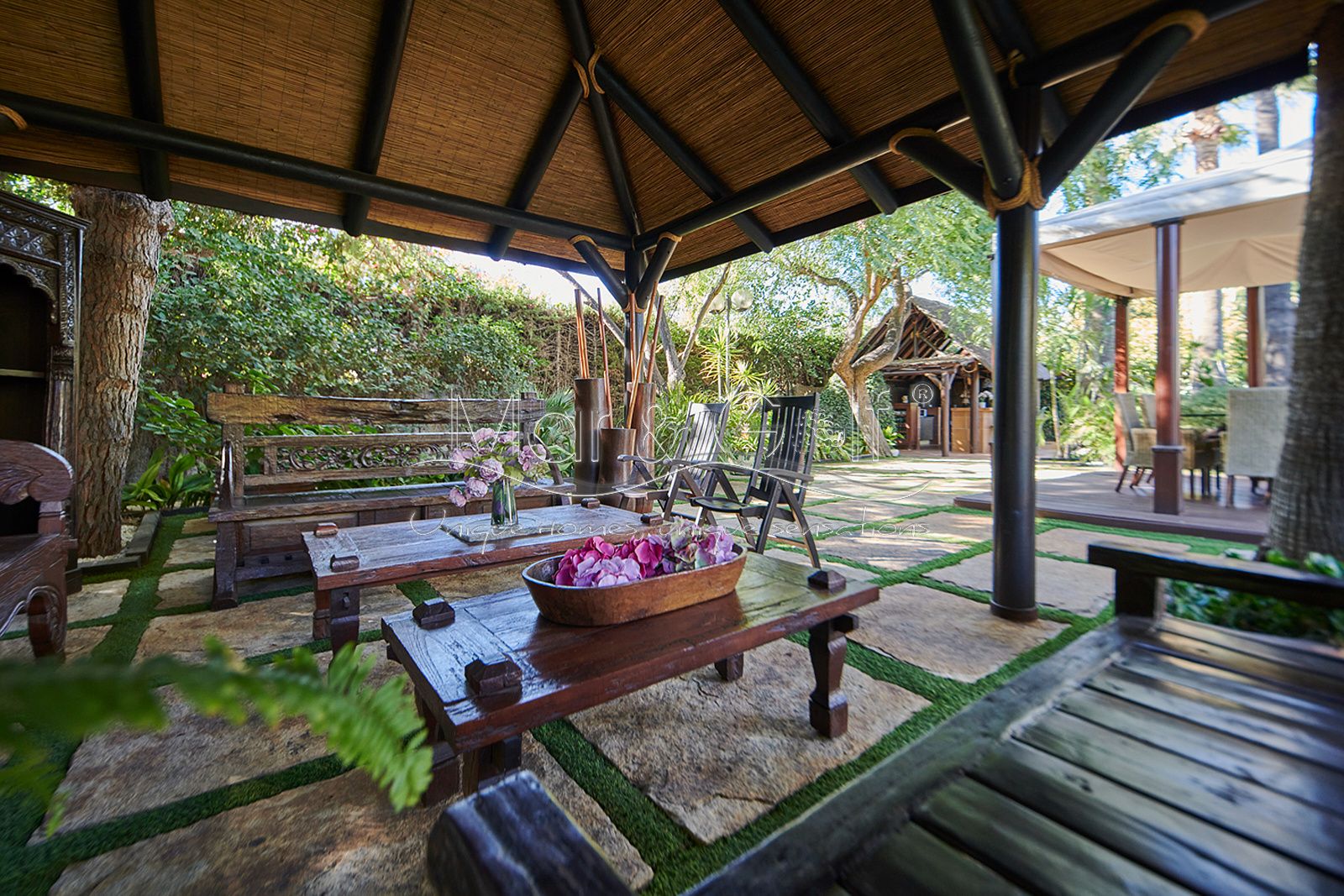 La zona exterior es paraíso privado dentro de la ciudad. La villa se extiende sobre más de 5.000 m² de escenario natural excepcional con árboles frutales y pinada privada, dos lagos artificiales, piscina exterior, cocina exterior techada, baño completo en la zona de piscina, parking exterior con punto de carga eléctrica y dos ambientes chill-out de inspiración balinesa, perfectos para comer, relajarse o disfrutar de veladas inolvidables.