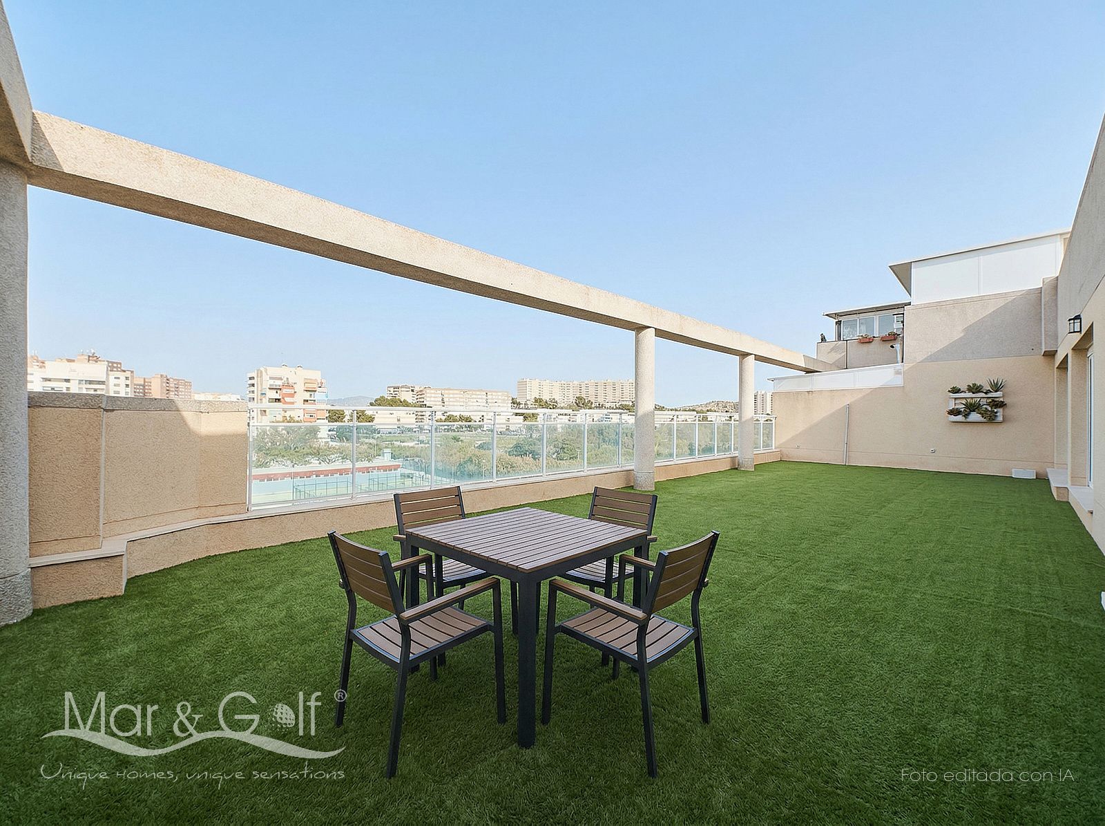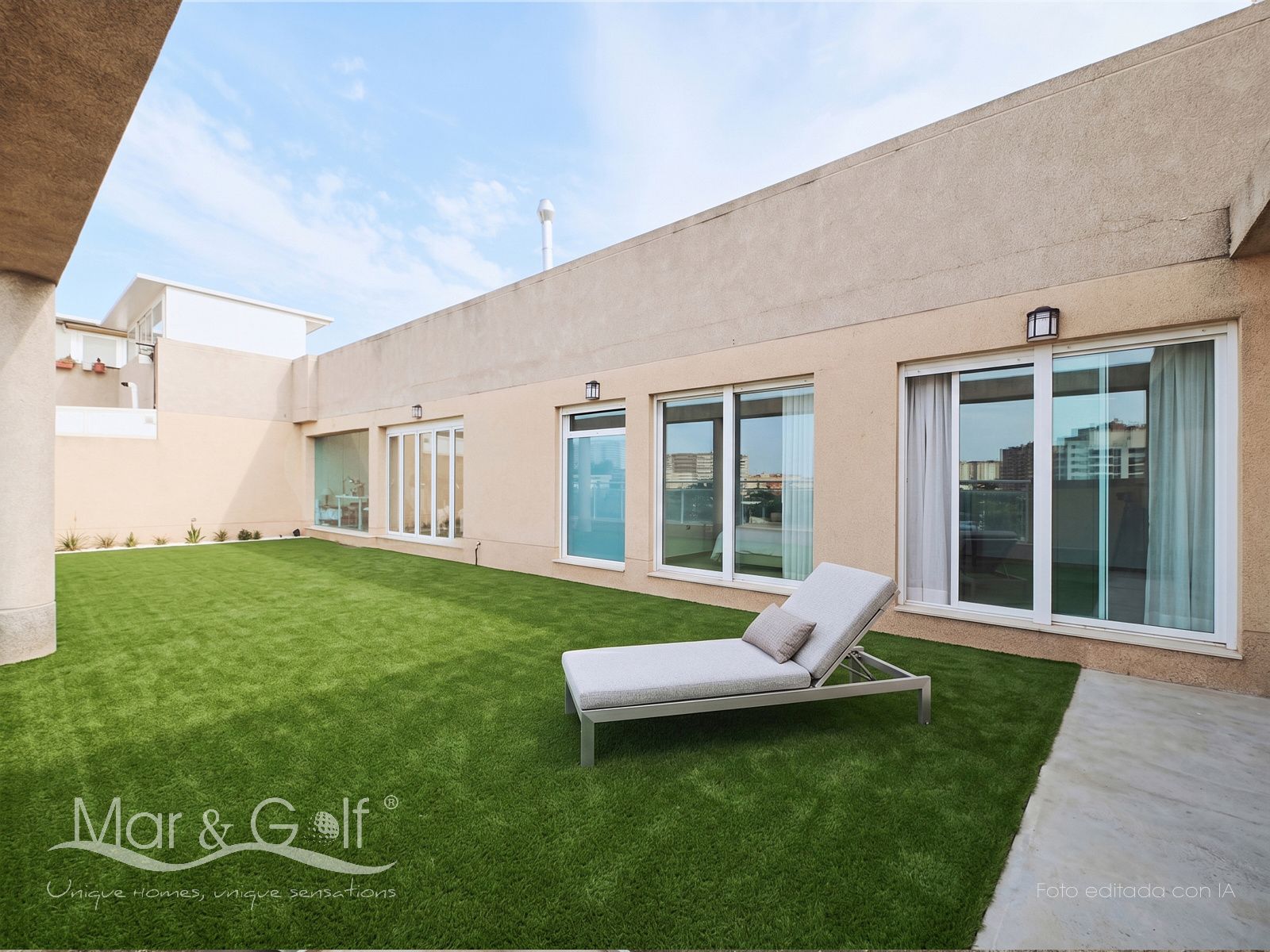 Una discreta escalera nos conduce a la impresionante terraza superior de 125m2 que ocupa prácticamente toda la totalidad de la superficie de la vivienda, ofreciendo un espacio único con infinitas posibilidades para disfrutarla.